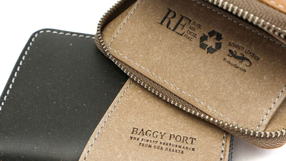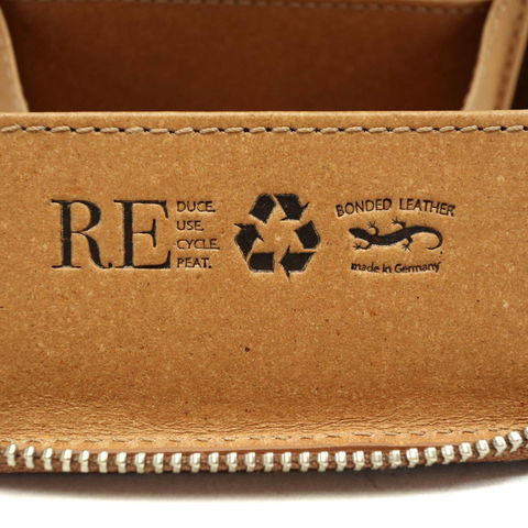 本製品のリサイクルレザーは、世界中から入手した天然皮革の端材を、ラテックス樹脂とともに固め合わせて作られました。内装には高品質を証明する刻印を施しています。少しハリのある素材感と、さらっとした心地よい手触りが魅力的。キズや汚れがつきにくく、水にも強いため、経年変化はゆっくりです。