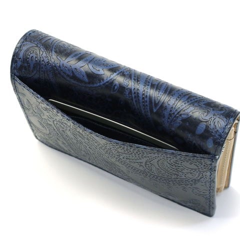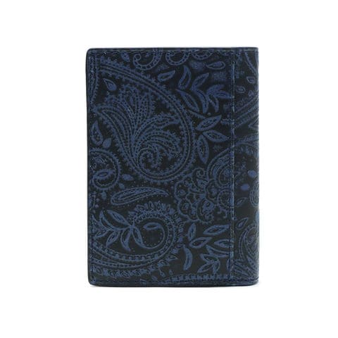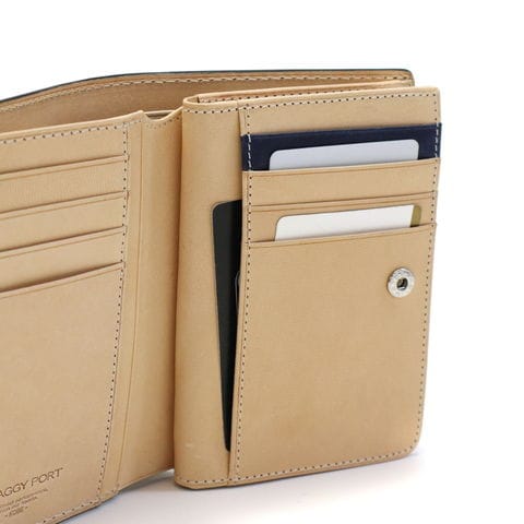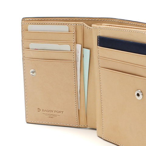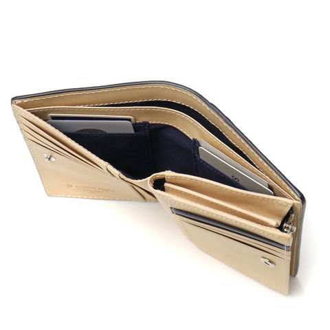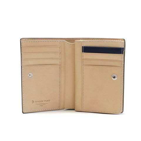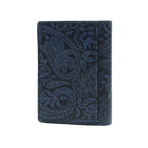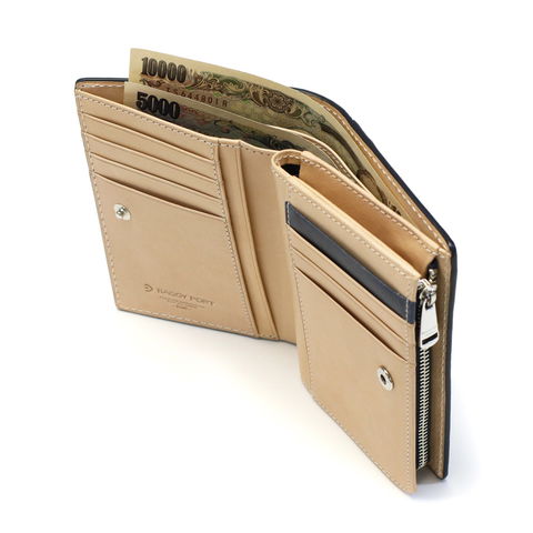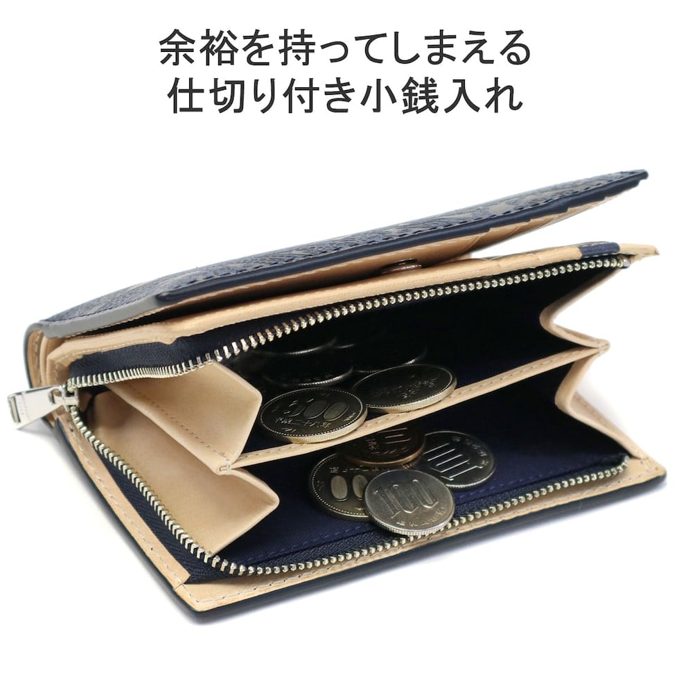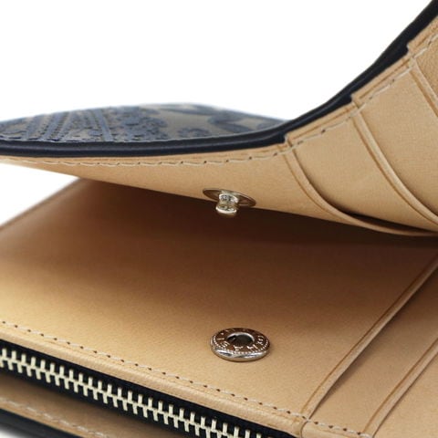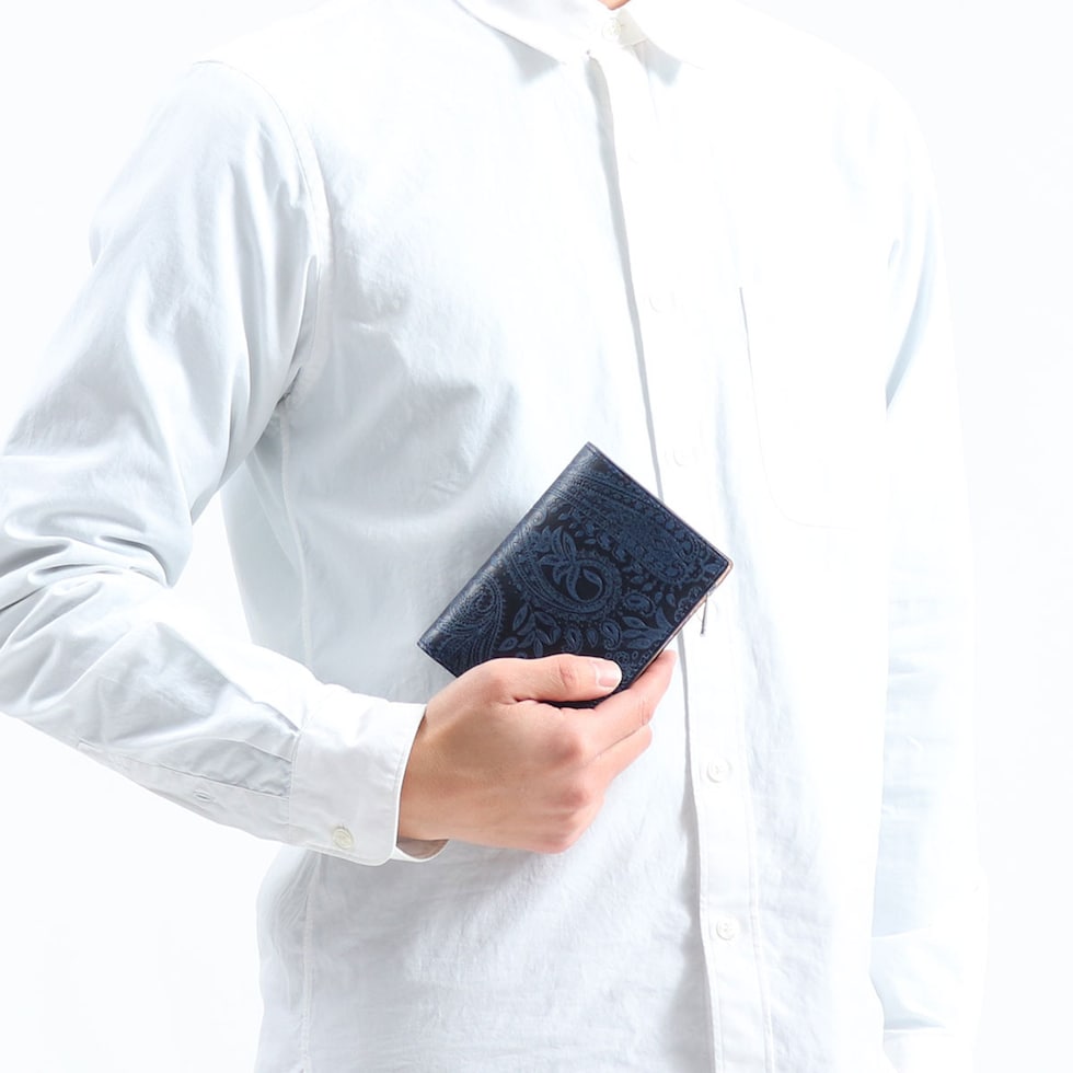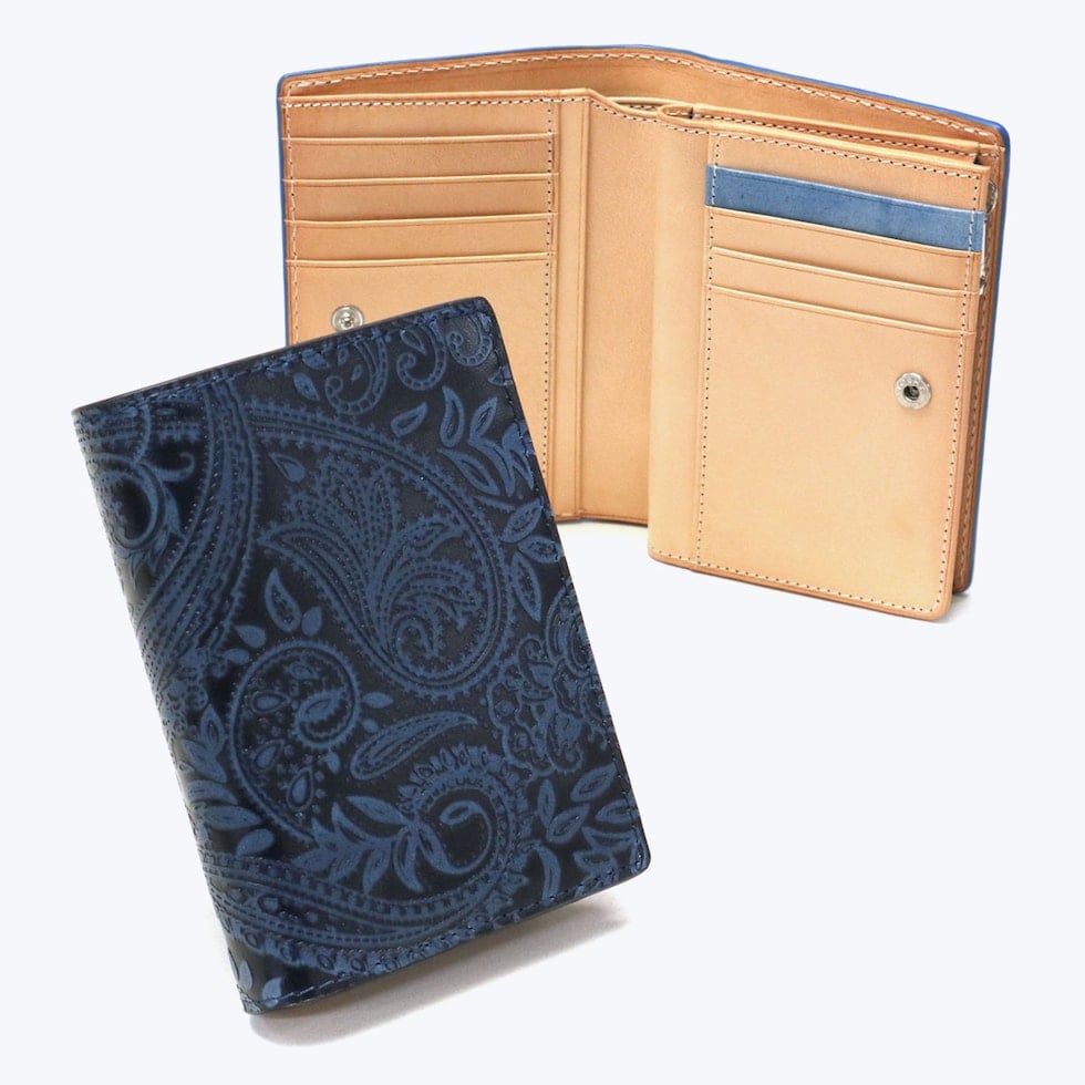 「BAGGY PORT」から誕生した「KOI/コーアイ」。こちらは伝統的な藍染めを革に落とし込んだ、ペイズリー柄の二つ折り財布です。職人技術により1枚1枚丁寧に型押しを施し、浮き出た部分を削ることで唯一無二の存在感あるデザインに。本体は2層の札入れや豊富なカードポケット、仕切り付きの小銭入れなどを設置しており、種別管理のできる収納力に優れたつくりとなっています。