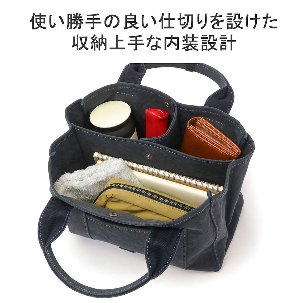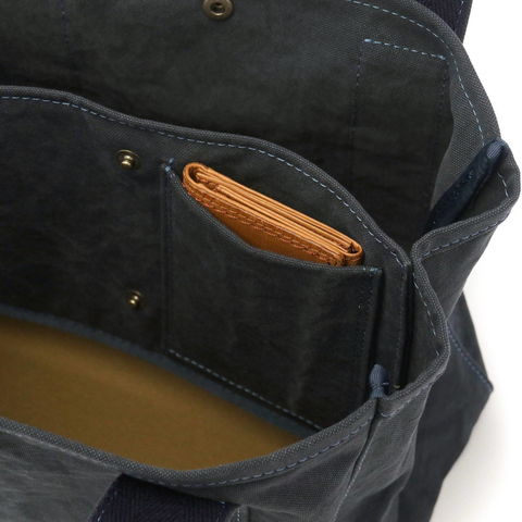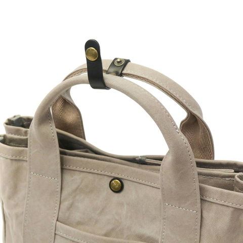 荷物の管理が簡単に行える仕切り付きの設計が特徴。中央に設けた仕切りに加え、スナップボタンで簡単に取り付けられる小さめの仕切りも設けられているので、収納物やライフスタイルに合わせた収納が簡単に行えます。本体素材には、バイオ加工を施した18オンスアーミーダック帆布を採用。細い糸を使用し、織物の組織密度を上げたダック素材と呼ばれる平組織で織られた帆布で、厚みは抑えつつも高密度で、軽くて丈夫な頼もしい素材となっています。