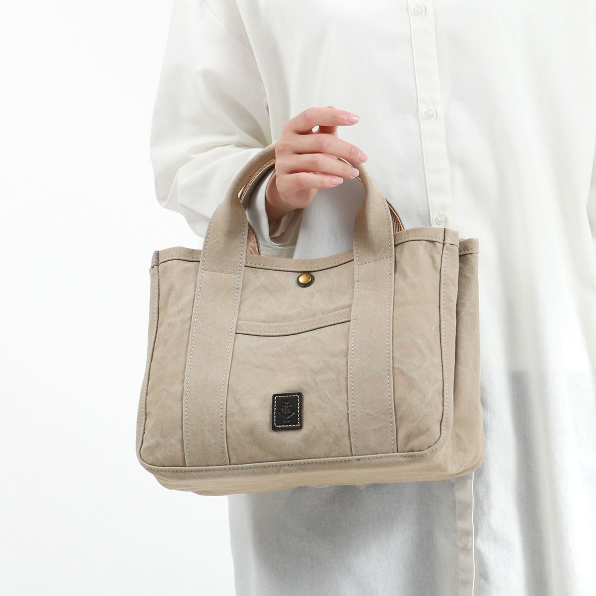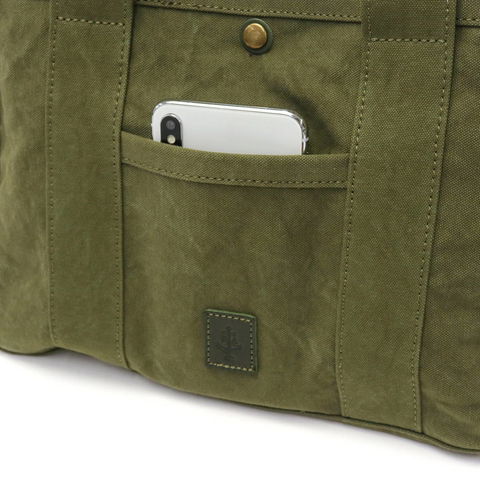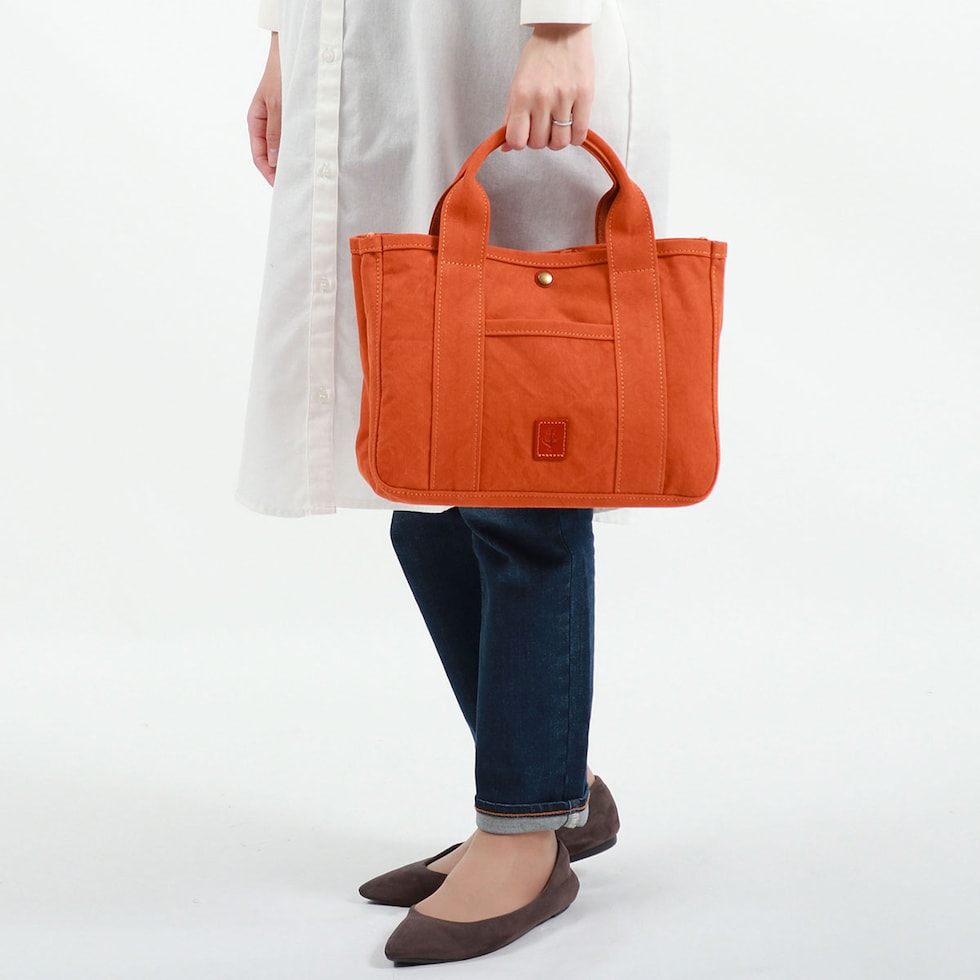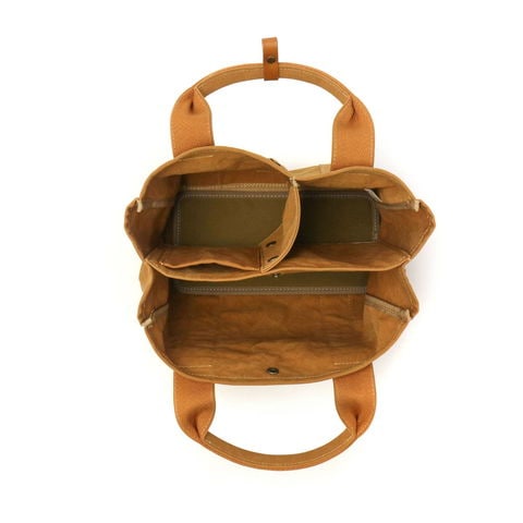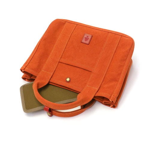 素材に、軽量で丈夫な18オンスアーミーダック帆布を使用したトートバッグ。ちょっとしたお出かけに丁度いいサイズ感と、ハリ感があり自立しやすいつくりで、休日のお出かけやお買い物、通勤時のサブバッグなど、多用途で活躍する仕上がりになっています。