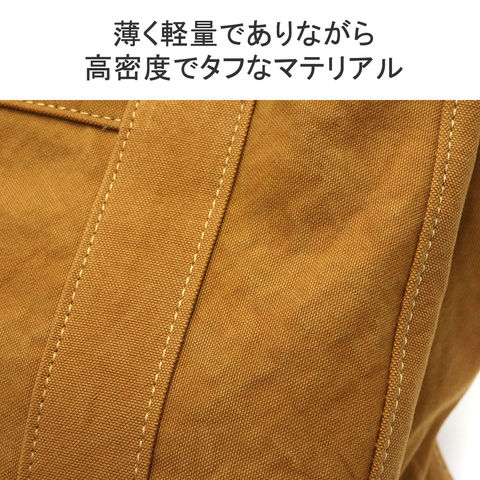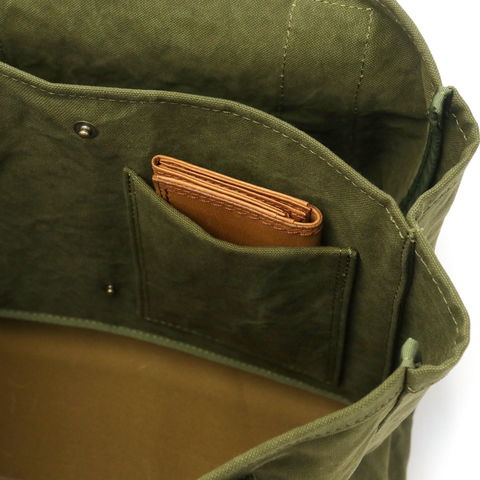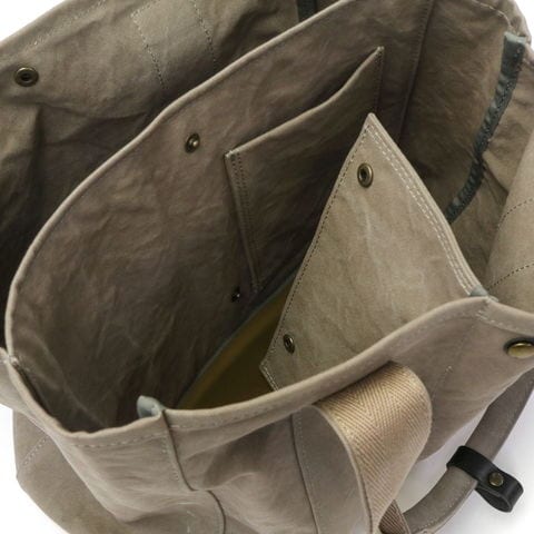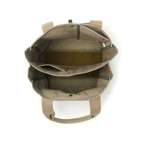 荷物の管理が簡単に行える仕切り付きの設計が特徴。中央に設けた仕切りに加え、スナップボタンで簡単に取り付けられる小さめの仕切りも設けられているので、より細かくアイテム管理をすることができます。本体素材には、バイオ加工を施した18オンスアーミーダック帆布を採用。細い糸を使用し、織物の組織密度を上げたダック素材と呼ばれる平組織で織られた帆布で、厚みを抑えつつも高密度な、軽くて丈夫な頼もしい素材となっています。