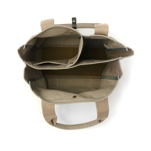 素材に、軽量で丈夫な18オンスアーミーダック帆布を使用したトートバッグ。A4サイズがちょうど入る大きさで、通勤時にもプライベート時間にも活躍します。ハリ感があり自立しやすいつくりで、扱いやすさも抜群。マルチなシーンで使いたくなる仕上がりです。