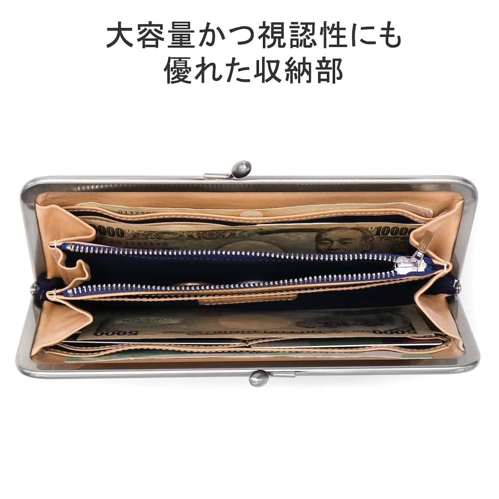 詳細説明 大きく開く開口部は、視認性に優れ取り出しやすいのが特徴。また、計11枚分の豊富なカードポケットをはじめ、その他用途別の収納スペースを複数確保することで実用性の高いつくりとなりました。がま口特有のふっくらとしたフォルムでありながら、すっきりした印象で大人らしさが引き立つアイテムです。