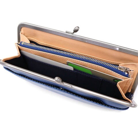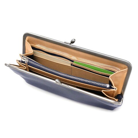 大きく開く開口部は、視認性に優れ取り出しやすいのが特徴。また、計11枚分の豊富なカードポケットをはじめ、その他用途別の収納スペースを複数確保することで実用性の高いつくりとなりました。がま口特有のふっくらとしたフォルムでありながら、すっきりした印象で大人らしさが引き立つアイテムです。