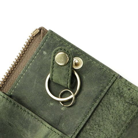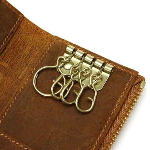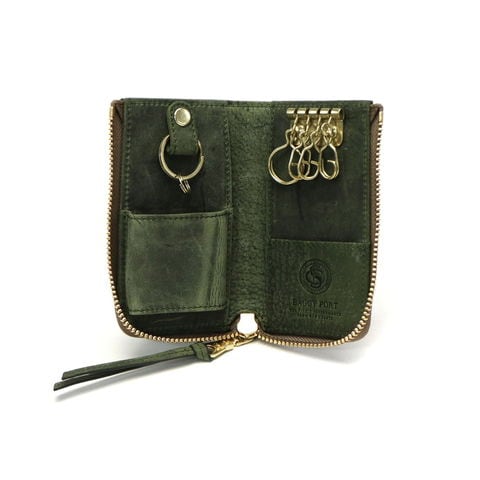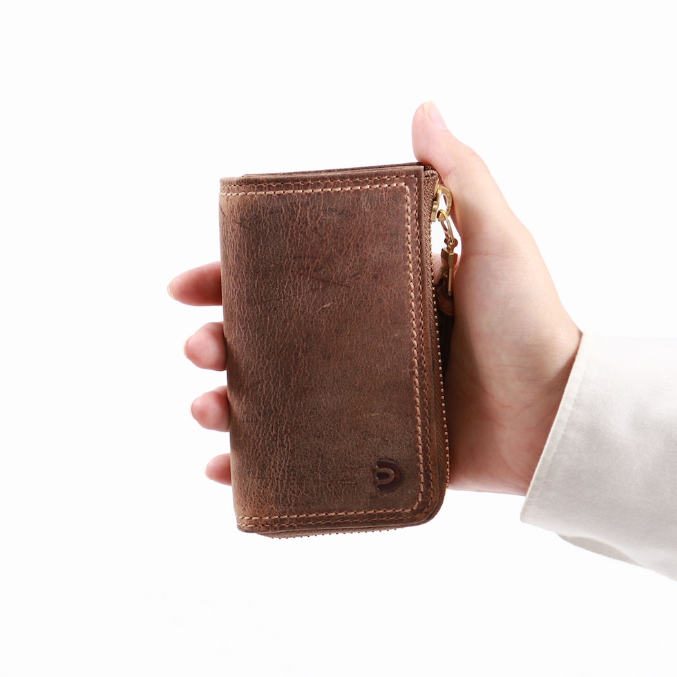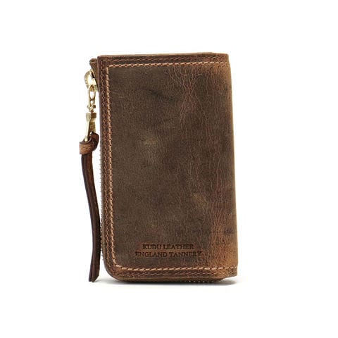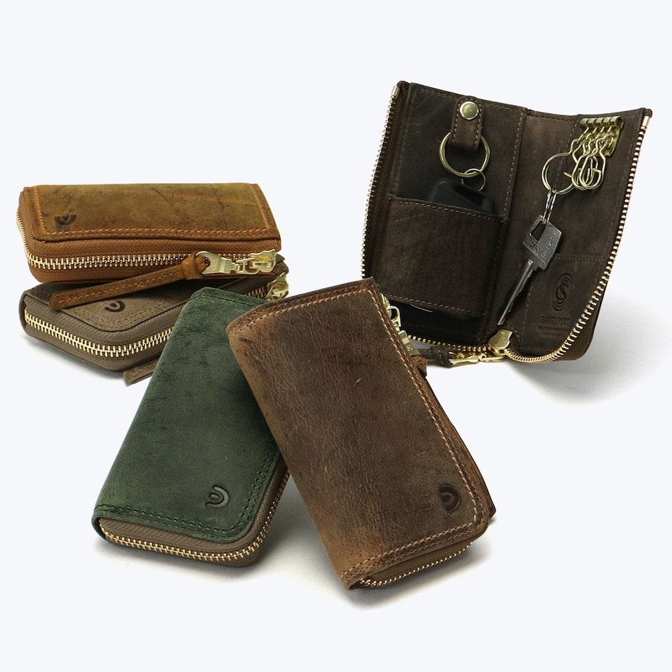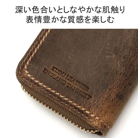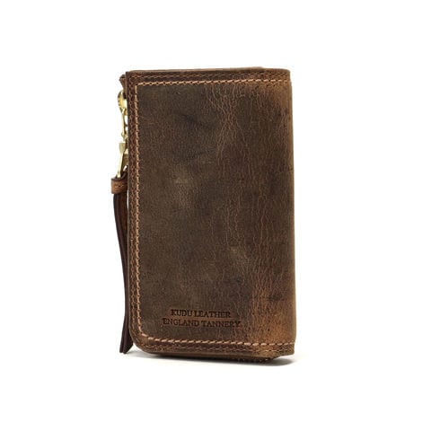 ハードな質感のクーズーレザーを使用した『KUDU シリーズ』のキーケース。4つのキーフックのほかスマートキーを収納できるスペースを装備。素材には、アフリカ大陸に生息するクーズーの原皮を使用し、野生に生きた証としてのキズやシワなどが無数にあるのが特徴的。製品によっては大きな個体差が現れる革ですが、ワイルドさ宿るその見た目によってオリジナルの表情をお楽しみいただけます。さらに、ワックス加工を施すことにより、経年変化によるツヤが出て更なる深みが増し、唯一無二の仕上がりとなっています。