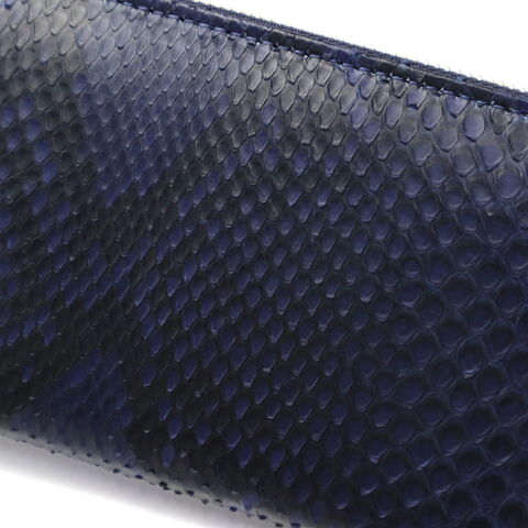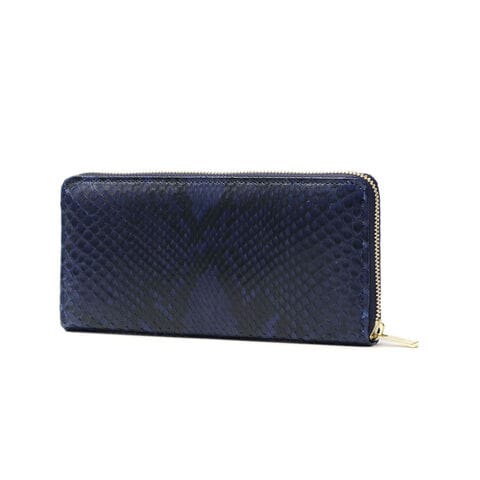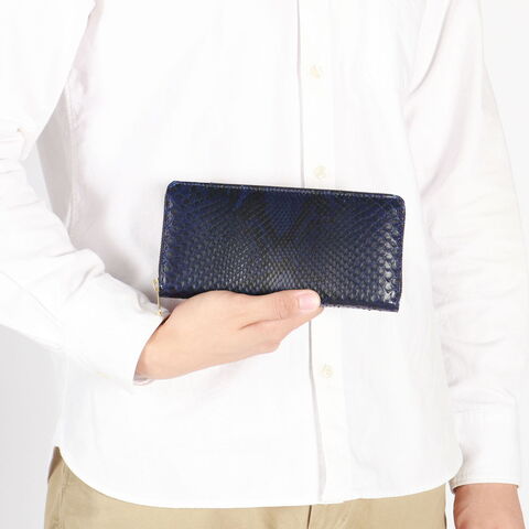 徳島県指定無形文化財「阿波正藍染法」によって仕上げられた蛇革のロングウォレット。藍染料の中でも高品質な阿波藍として扱われ、その品高さから『正藍』と呼ばれています。また蛇革の鱗は皮膚と一体になっているため、魚の鱗のように剥がれ落ちることはなく、立っている鱗は経年変化とともに落ち着いてきます。