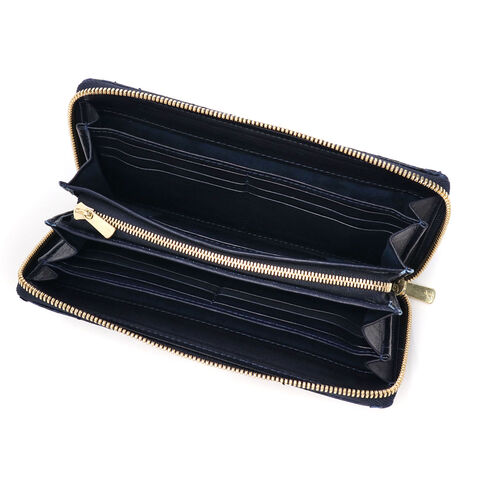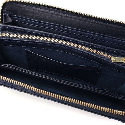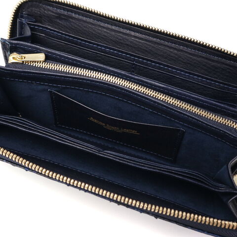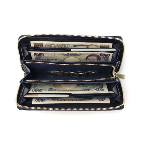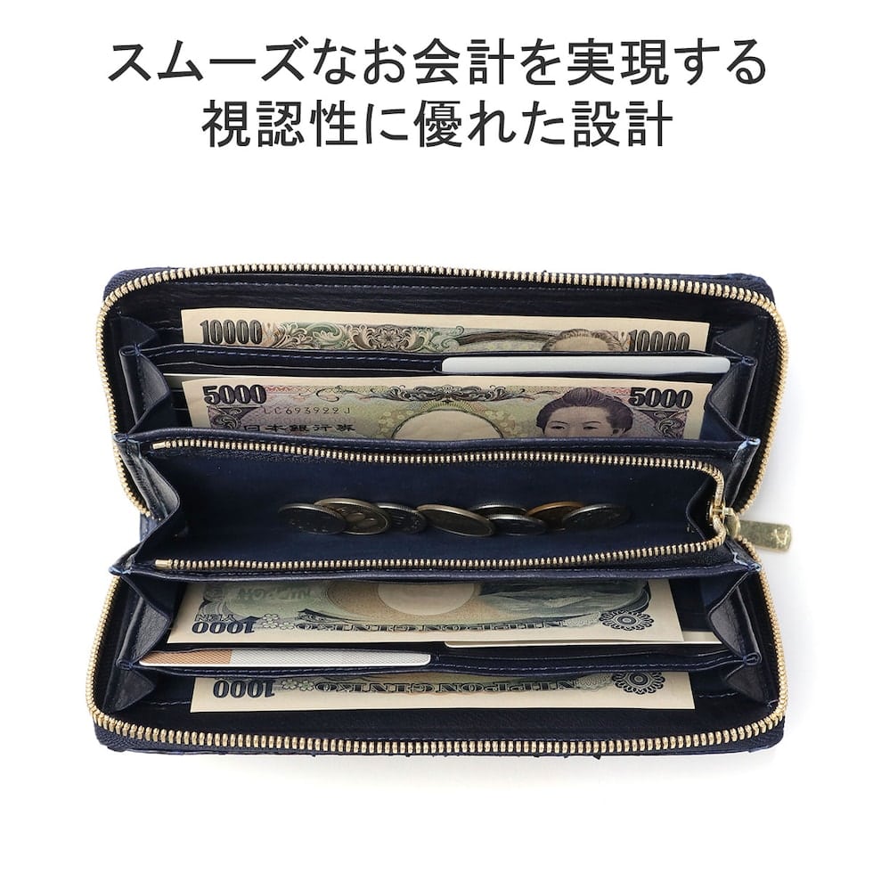 本体は、4つの札入れにファスナー付きの小銭入れ、多数のカードポケットを配置した大容量の設計。ファスナーには美しさと滑らかな手触りの「エクセラファスナー」を採用しており、長年の使用にも耐えうる耐久性を兼ね備えています。また裏地に高級感のあるスエード生地を使用することで、カード類をストレスなく取り出すことができます。