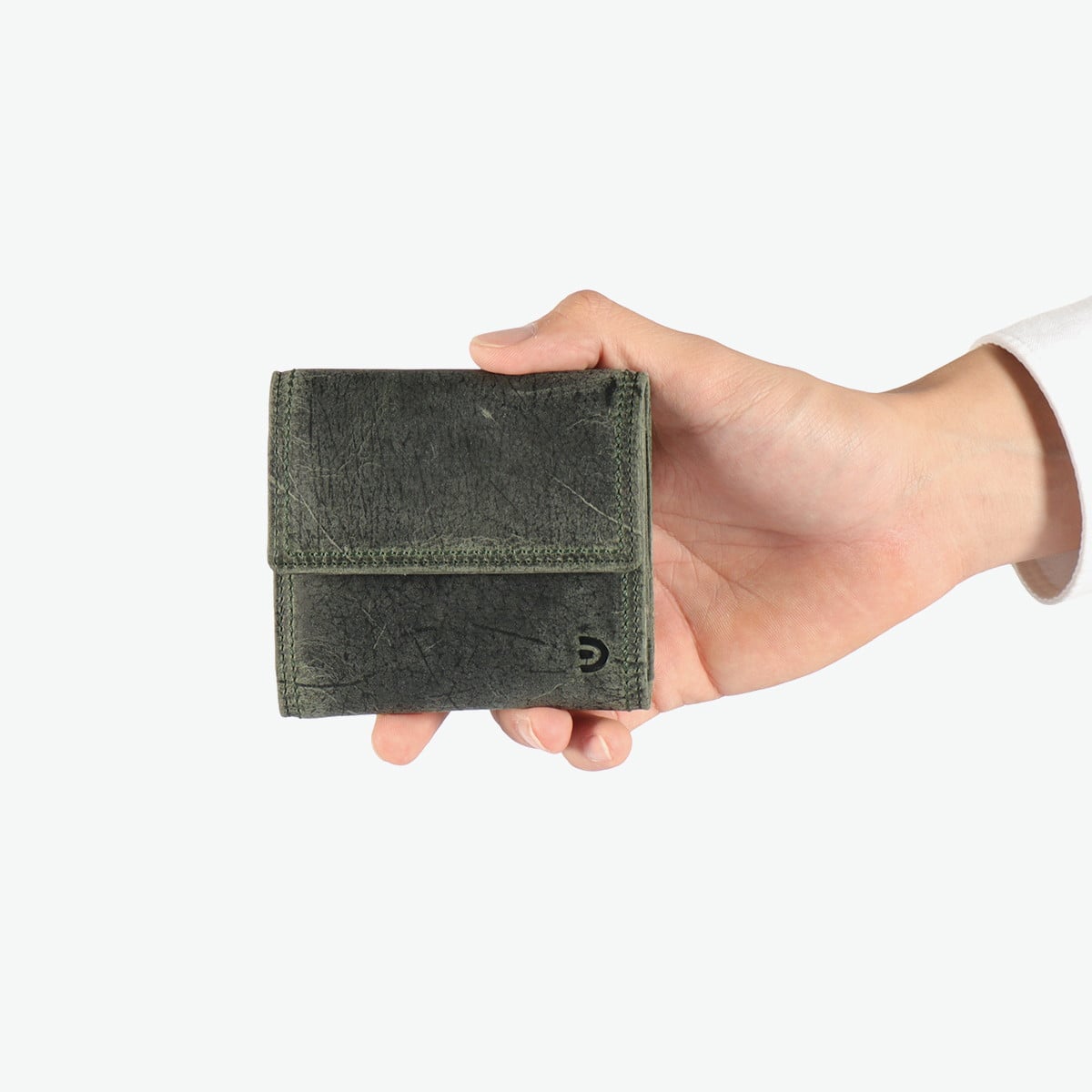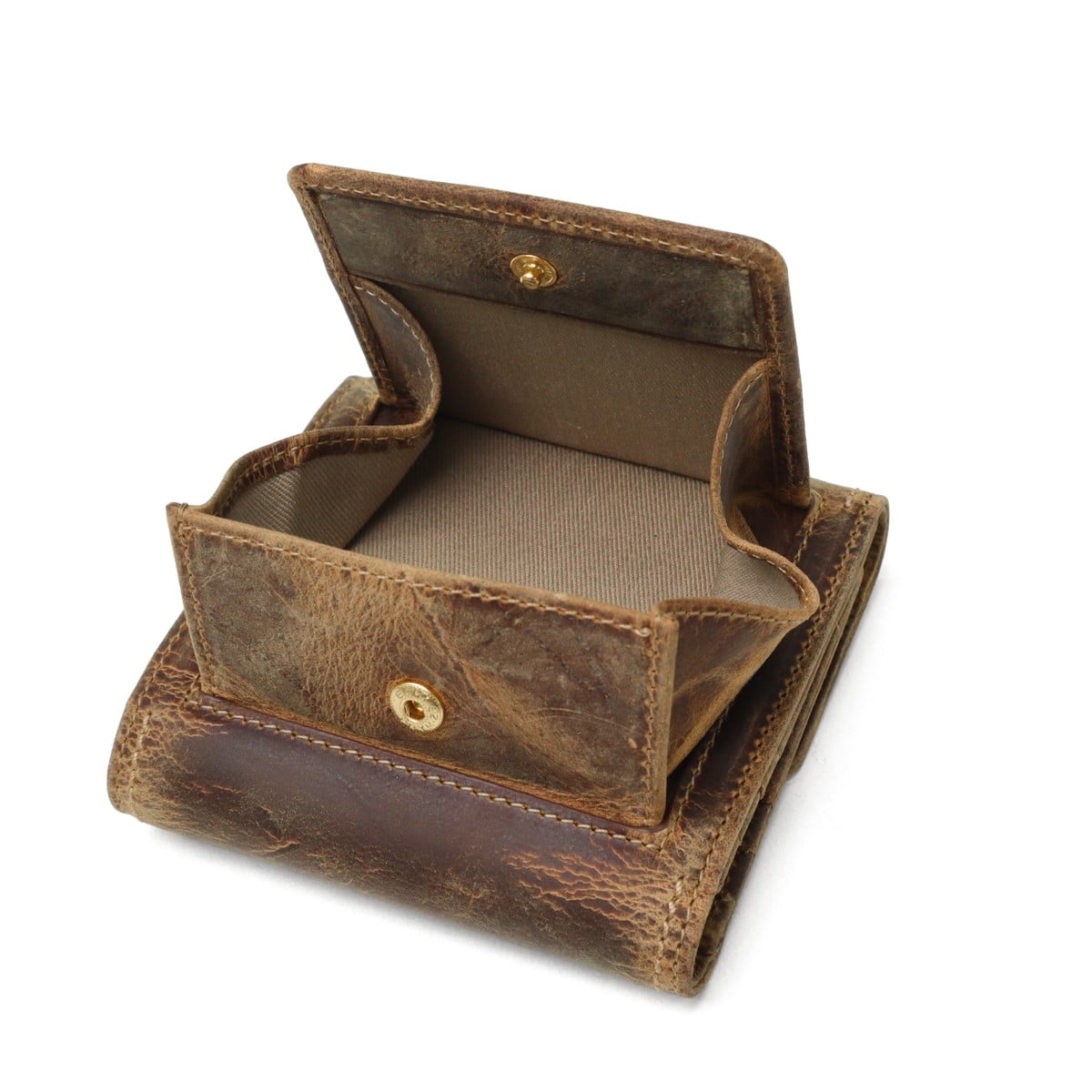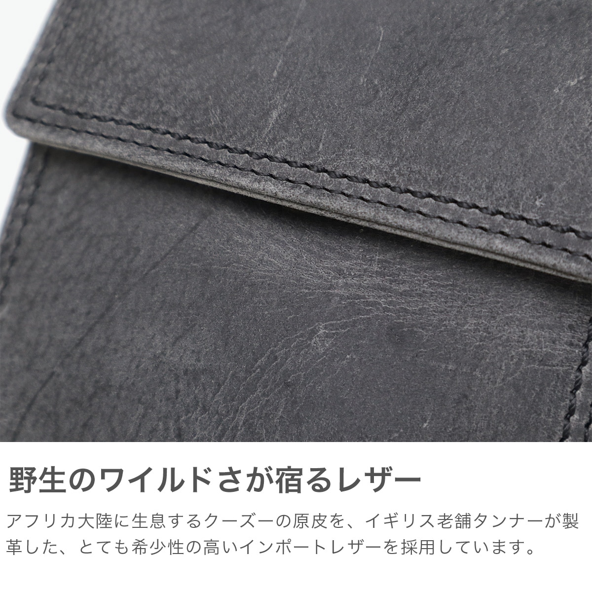 ハードな質感のクーズーレザーを使用した『KUDU シリーズ』の二つ折り財布。アフリカ大陸に生息するクーズーの原皮を使用し、野生に生きた証としてのキズやシワなどが無数にあるのが特徴的。製品によっては大きな個体差が現れる革ですが、ワイルドさ宿るその見た目によってオリジナルの表情をお楽しみいただけます。さらに、ワックス加工を施すことにより、経年変化によるツヤが出て更なる深みが増し、唯一無二の仕上がりとなっています。