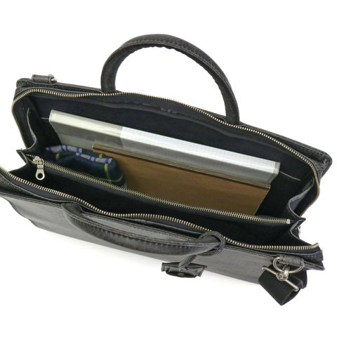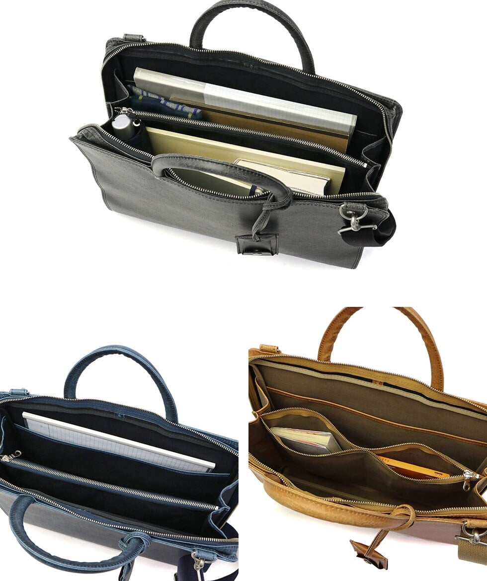 ベーシックなデザインで使い勝手の良い2WAYブリーフケース。革によく似た上質な合皮を使用し、急な雨などで水に濡れてもケアが簡単なのが魅力的です。ビジネスバッグでありながらカジュアルダウンしたルックスで、スーツスタイル以外にも合わせやすい仕上がりとなっています。
