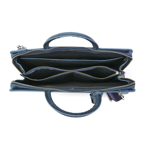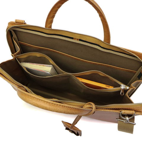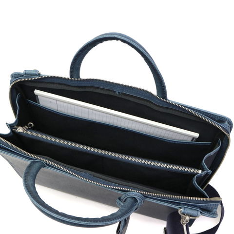 大きく開くメイン収納部は、中央のジップポケットが仕切りとなり、アイテムを分けてしまえるデザイン。A4サイズのファイルや書類を整理しながら収納可能です。内装には、大きめのポケットやジップポケットが備えられ、バッグの中で紛れてしまいがちな小物類をまとめるのに最適なスペースです。