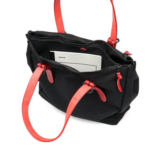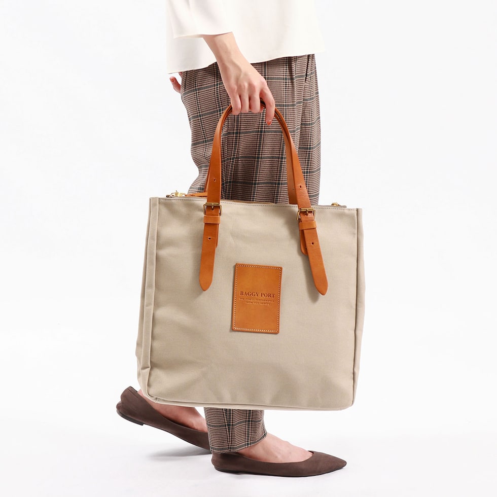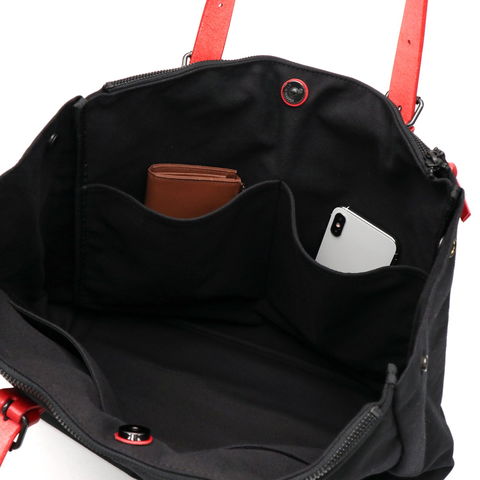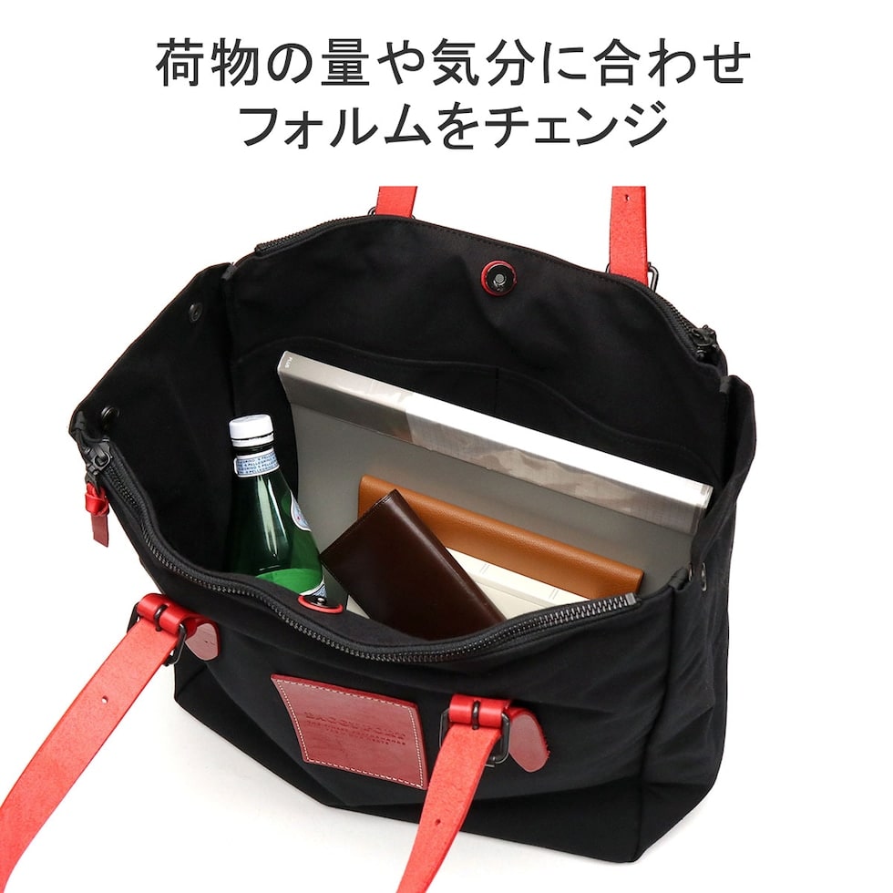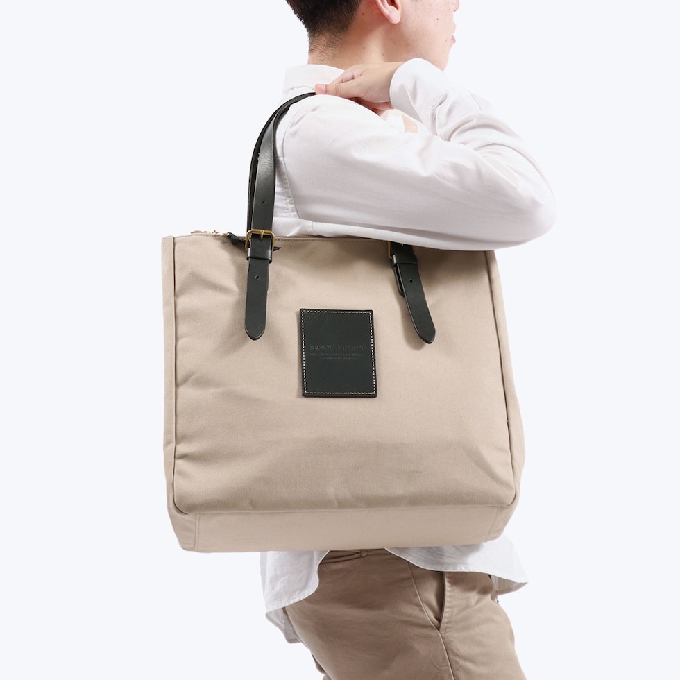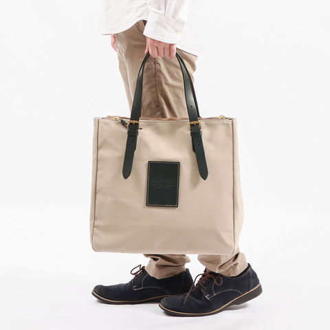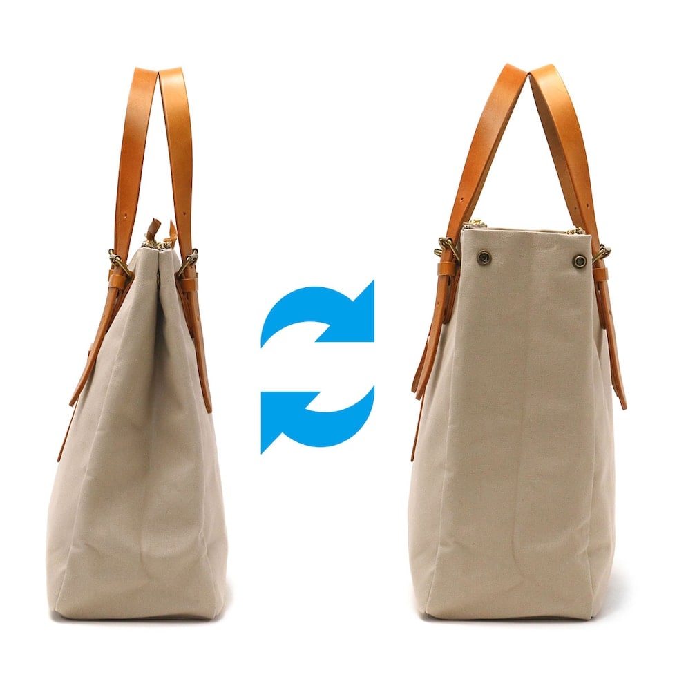 耐久性に優れた高密度帆布に、ヌメ革のアクセントが効いたトートバッグ。使い込むことで味わいが増し、ナチュラルな風合いで男女問わずお使いいただけるアイテムです。メインの収納部はA4サイズが縦にも横にもすっぽりと収まる大容量のサイズ感。広め設計の間口は視認性も抜群で、使い勝手の良いつくりとなっています。さらに、サイドに設けたスナップボタンで変形が可能となっており、荷物の量や気分に合わせてフォルムチェンジをお楽しみいただけます。
