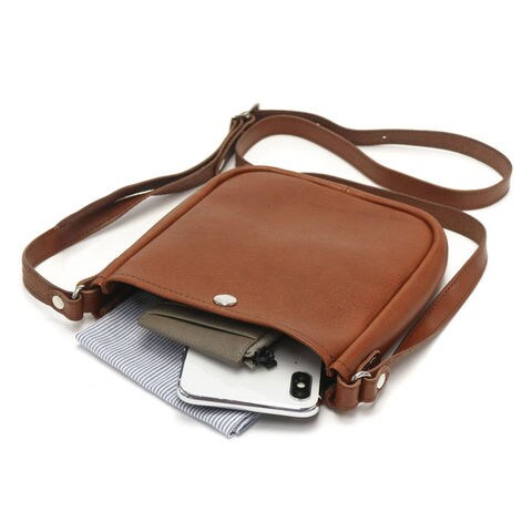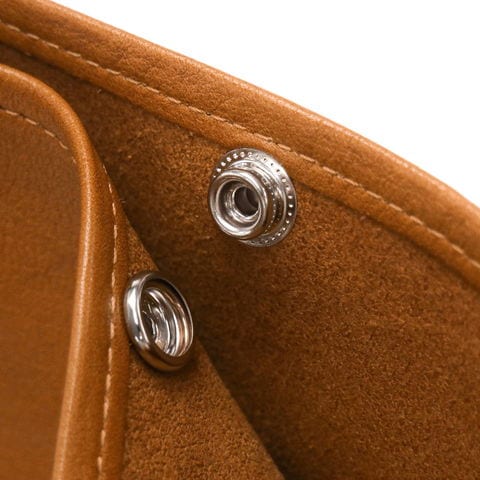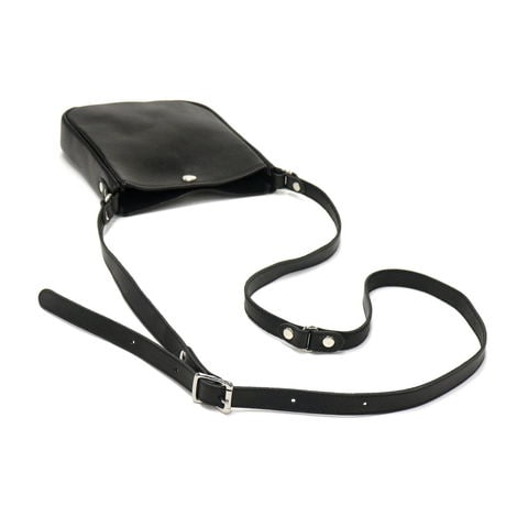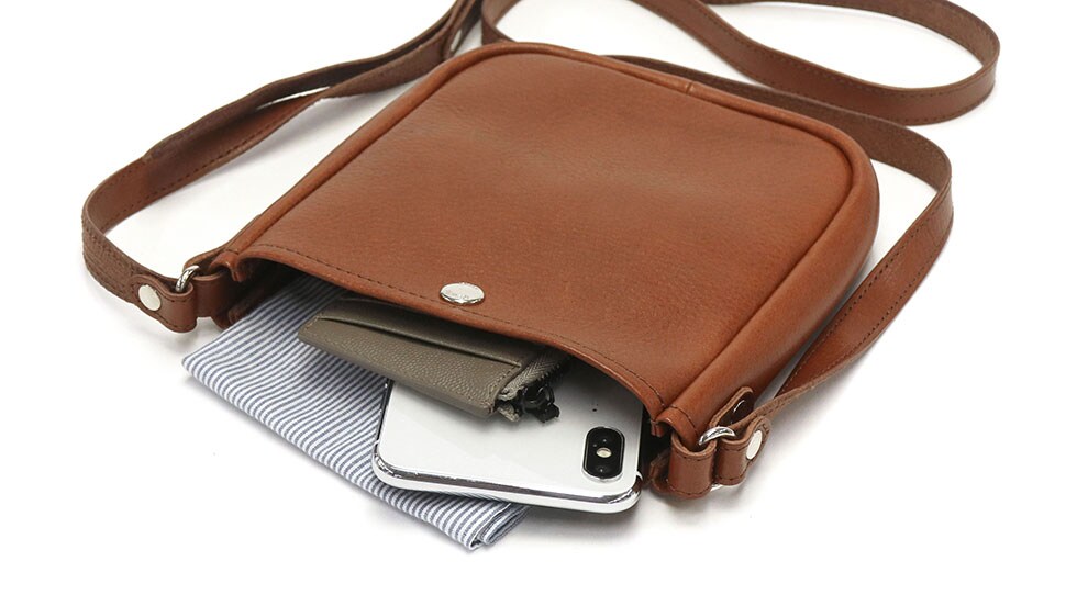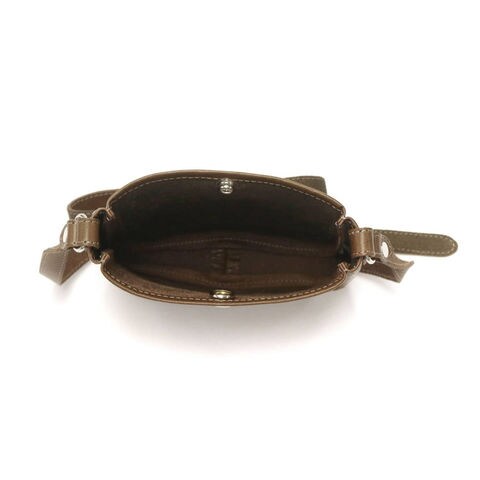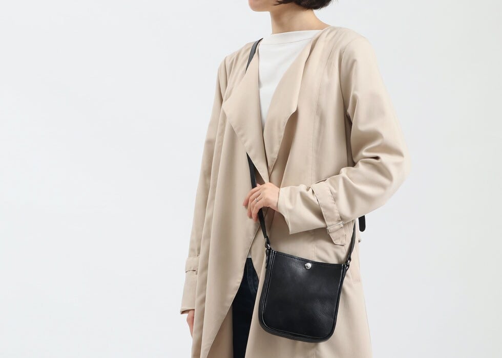 スナップ開閉の収納部は、ポケットなどを設けず薄マチですっきりとしたつくり。ポケットに入れて、さっと手にしたい小物などの収納に適しています。ショルダーストラップは調整穴での長さ調整も可能ですが、ストラップの先部分を結ぶこともでき、違った印象でお持ちいただけます。