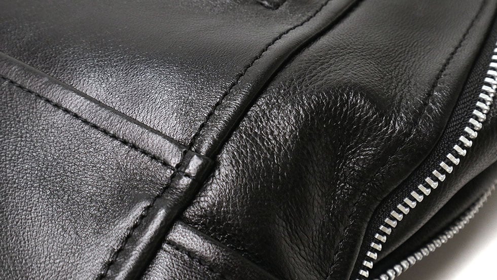 素材には、しっとりと肌に吸い付くような、滑らかな触り心地が魅力の羊革を採用。エッジの効いたデザインを引き立てつつも、落ち着いた上品な雰囲気に仕上がっています。使い込むほどにレザーのツヤ感や味わいがよりいっそう増し、経年変化を楽しみながら長くご愛用いただけます。