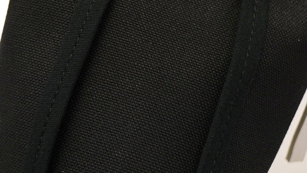 素材には、綿100%のハンプ生地にハードな樹脂撥水加工を施した生地を使用。急な雨でも気兼ねなくお使い頂ける安定感とハリのある素材です。また外ポケットは、レザーに型押しプリントを施した存在感のあるデザインとなっています。