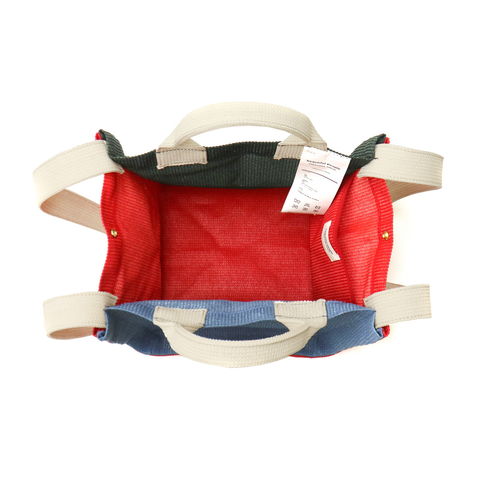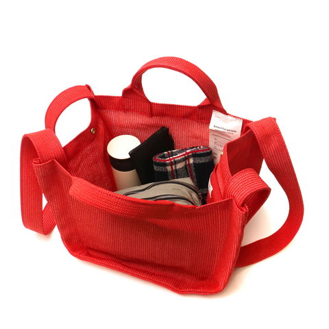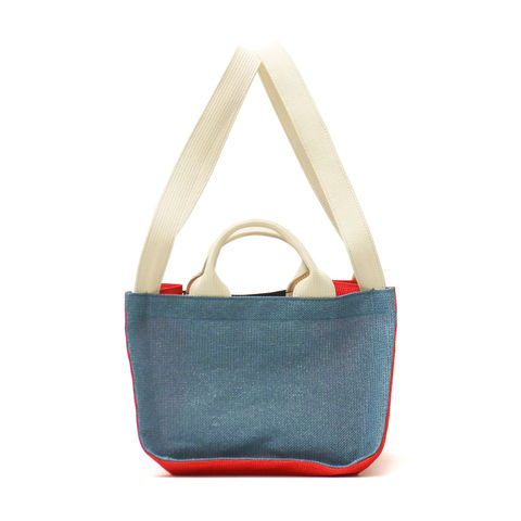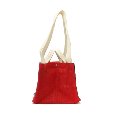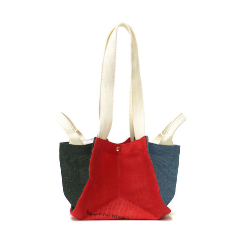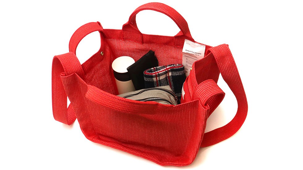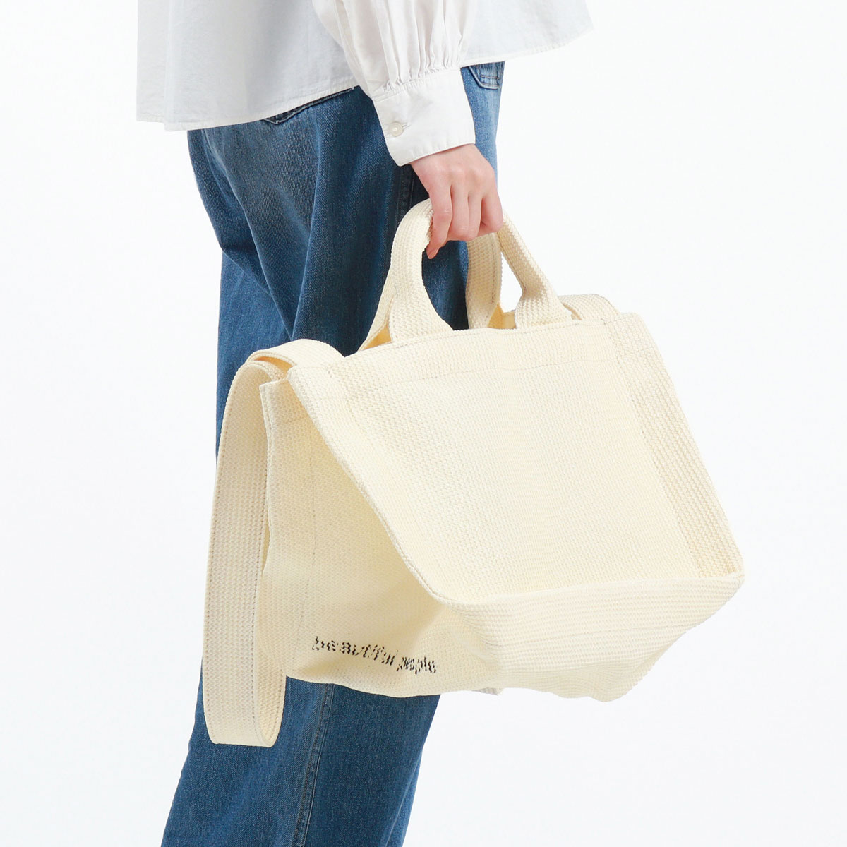 ロングとショートのハンドルを備え、本体正面をシフトし2つのルックスが楽しめる2WAYトートバッグ。生地の質感を生かしてハギ部分に凹凸が出るような仕様にすることで、バッグに立体感を出しています。ロックミシンがかかったフチ部分もデザインポイントのひとつです。