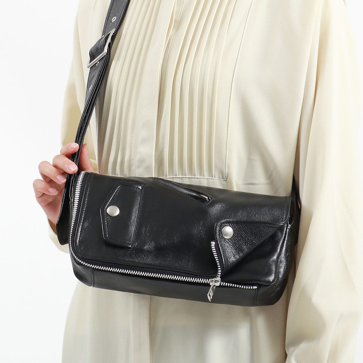 『beautiful people/ビューティフルピープル』から、ブランドアイコンの定番ヴィンテージライダースジャケットをモチーフにしたミニショルダーが登場。ライダースのディテールをギュッと凝縮したデザインが魅力的。かぶせタイプのワンショルダーは、よりモードに大人っぽいデザインとなっています。