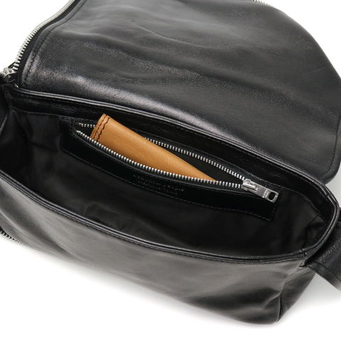 小ぶりながらも、必需品がしっかり収まるサイズ感のバッグ。素材には滑らかな手触りの羊革を採用。染色時に特殊なオイルを添加し、ベジタブルなめし特有の芯の固さが残らないよう加工されています。再度ハンドアイロンを伸ばすことにより、ハリ感と艶感を併せ持ち、美しい地艶のある表情に。上品さの中にもカジュアル感のある素材で、お手持ちのお洋服に合わせやすいバッグに仕上がっています。