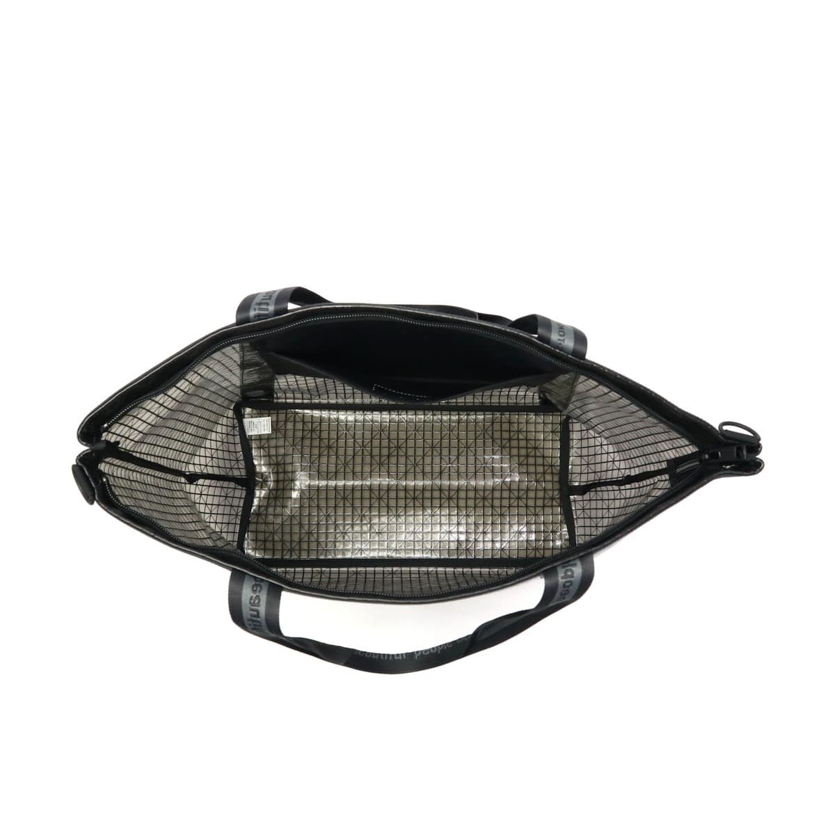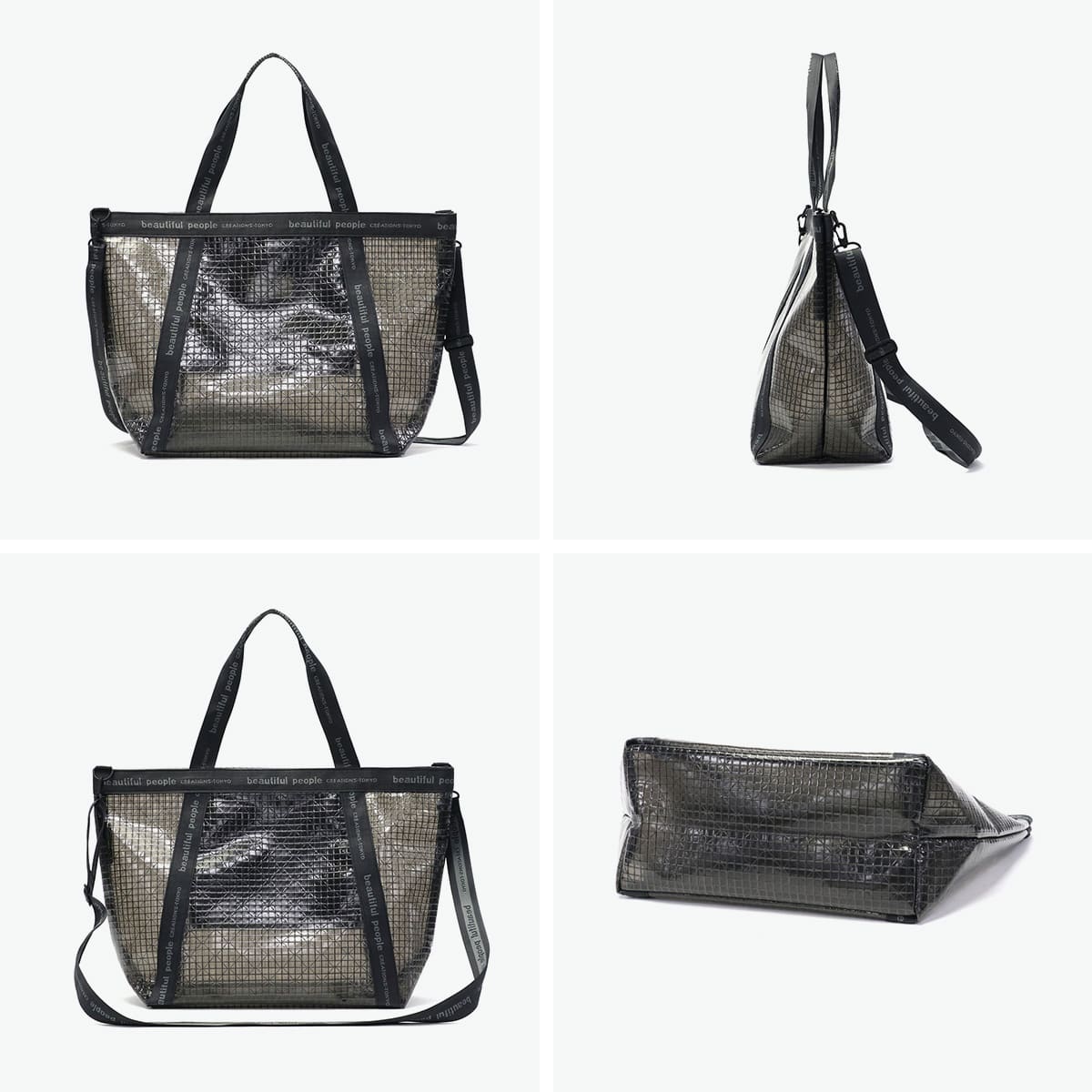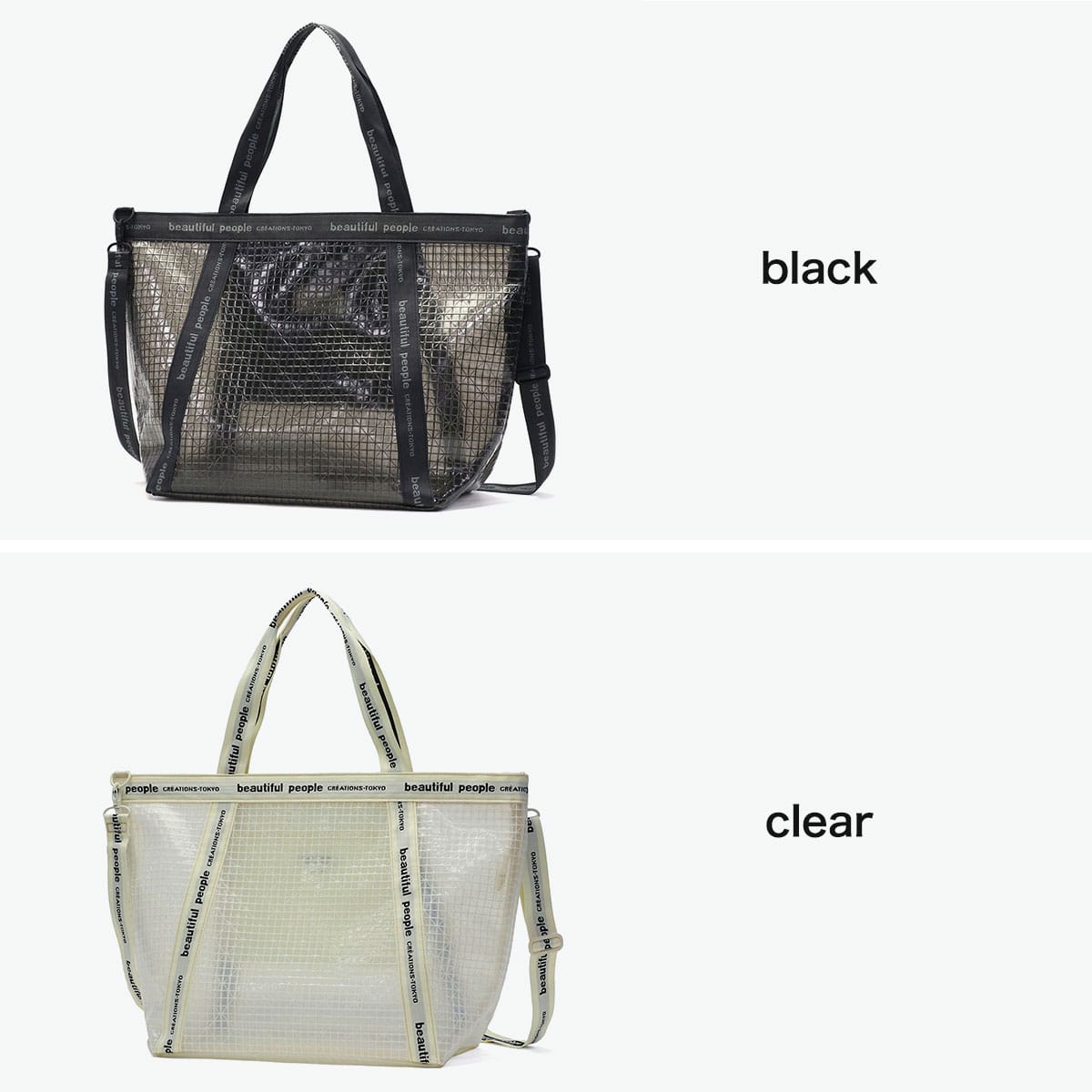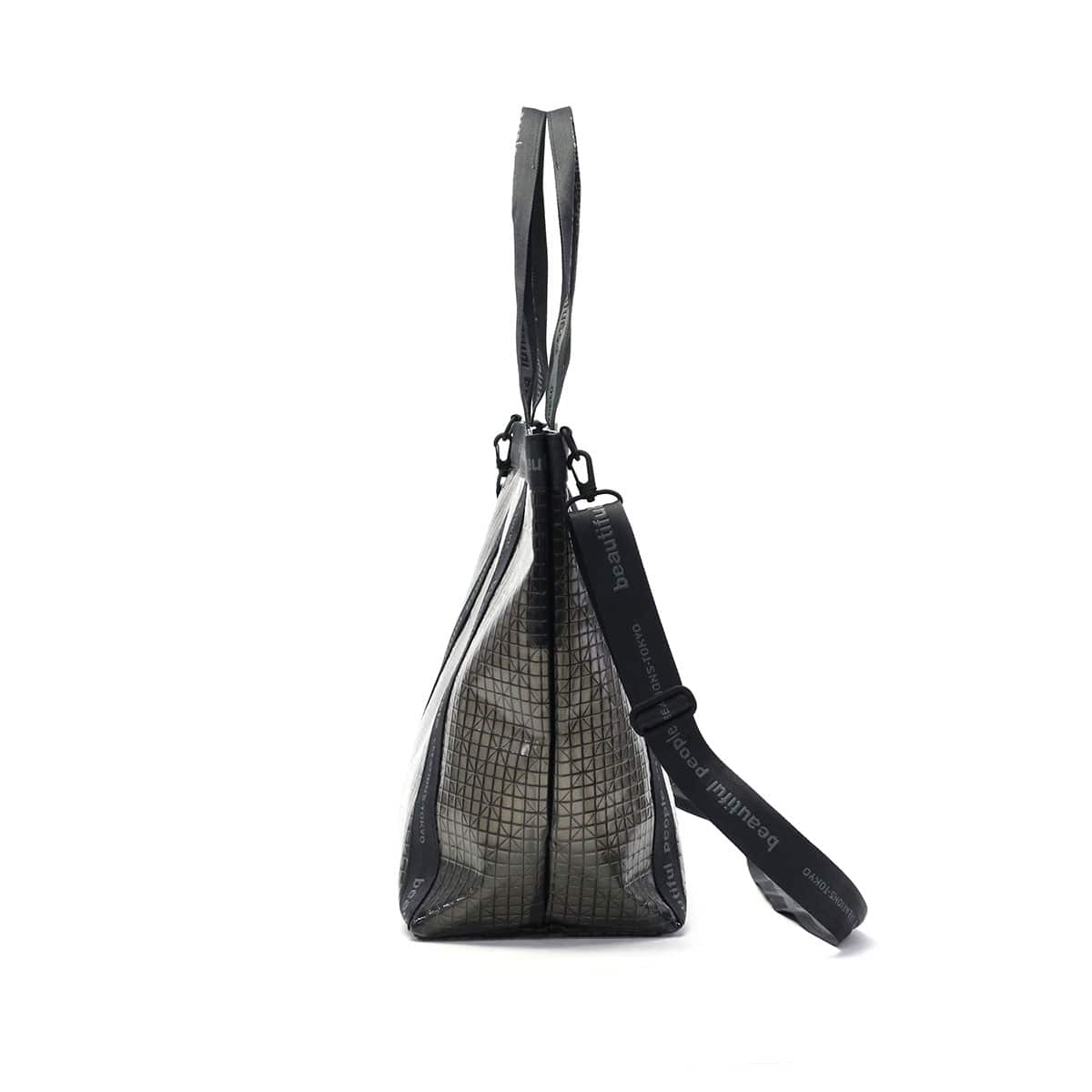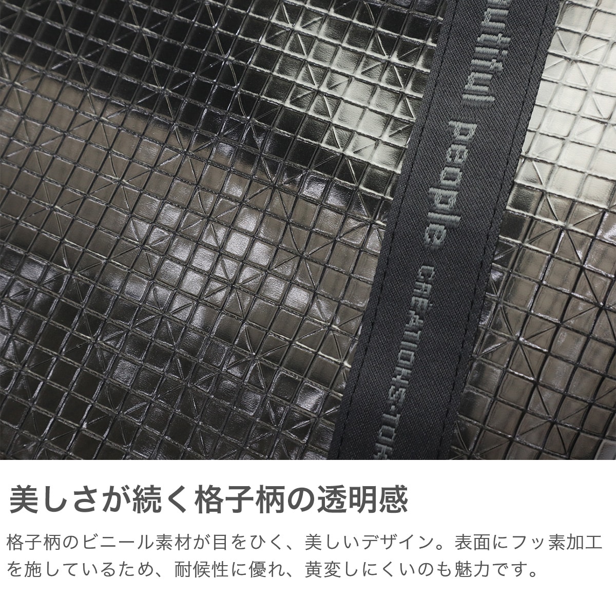 A4サイズがストレスなく入るサイズ感の2WAYトートバッグです。注目すべきは、テント素材を使った本体の質感。格子柄のビニールには表面にフッ素加工を施すことで耐光性を高め、黄変せず長く愛用できる丈夫さを生み出しています。艶やかで清涼感のある素材に、オリジナルジャガードテープを組み合わせ、存在感のあるルックスに仕上げました。