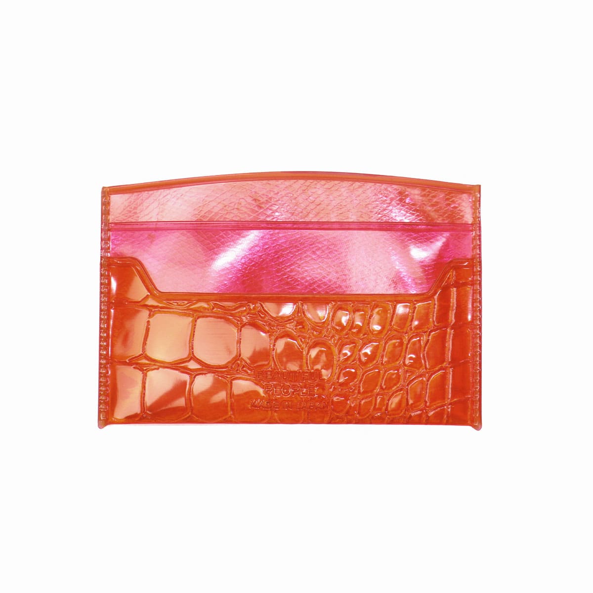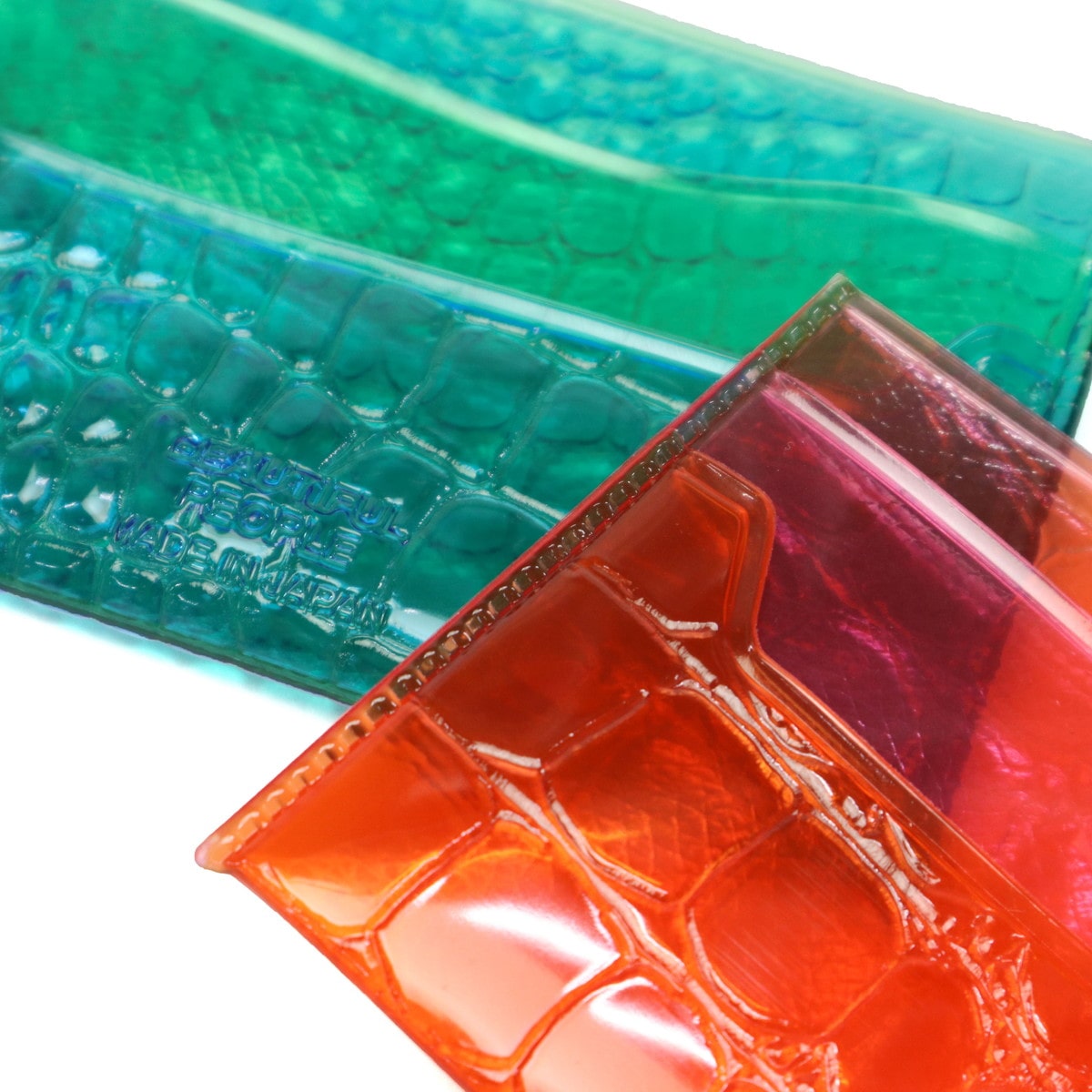 「隠すものは何もない/Nothing to hide」をコンセプトに、色や中身の透け感を楽しめるカードケース。縫い目は入れずにラグジュアリーな小物の念引きやステッチを熱加工により表現しています。2種の異なる色の重なり合いと、エンボス加工を表面に施したキャッチーな見た目が、シンプルながらも存在感を放つアイテムです。