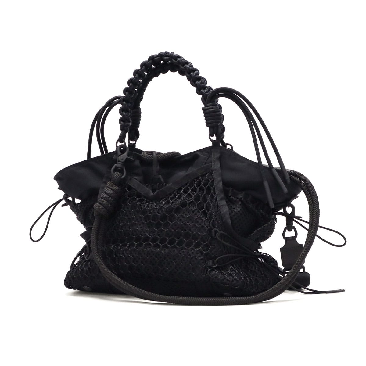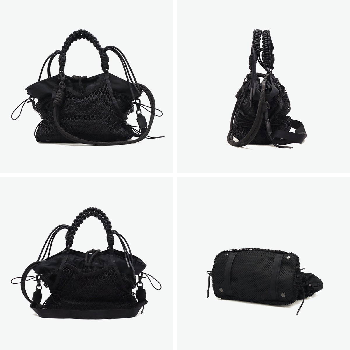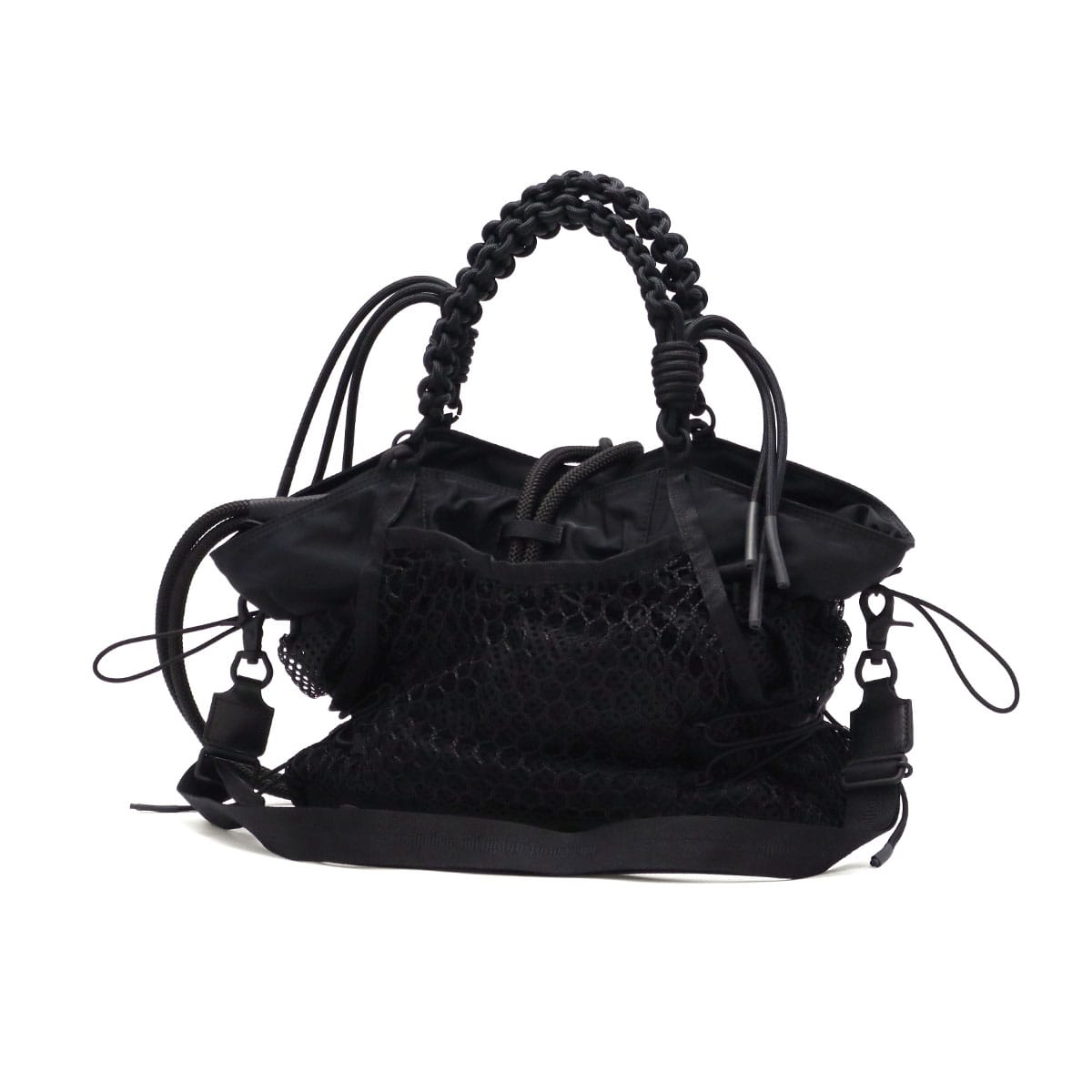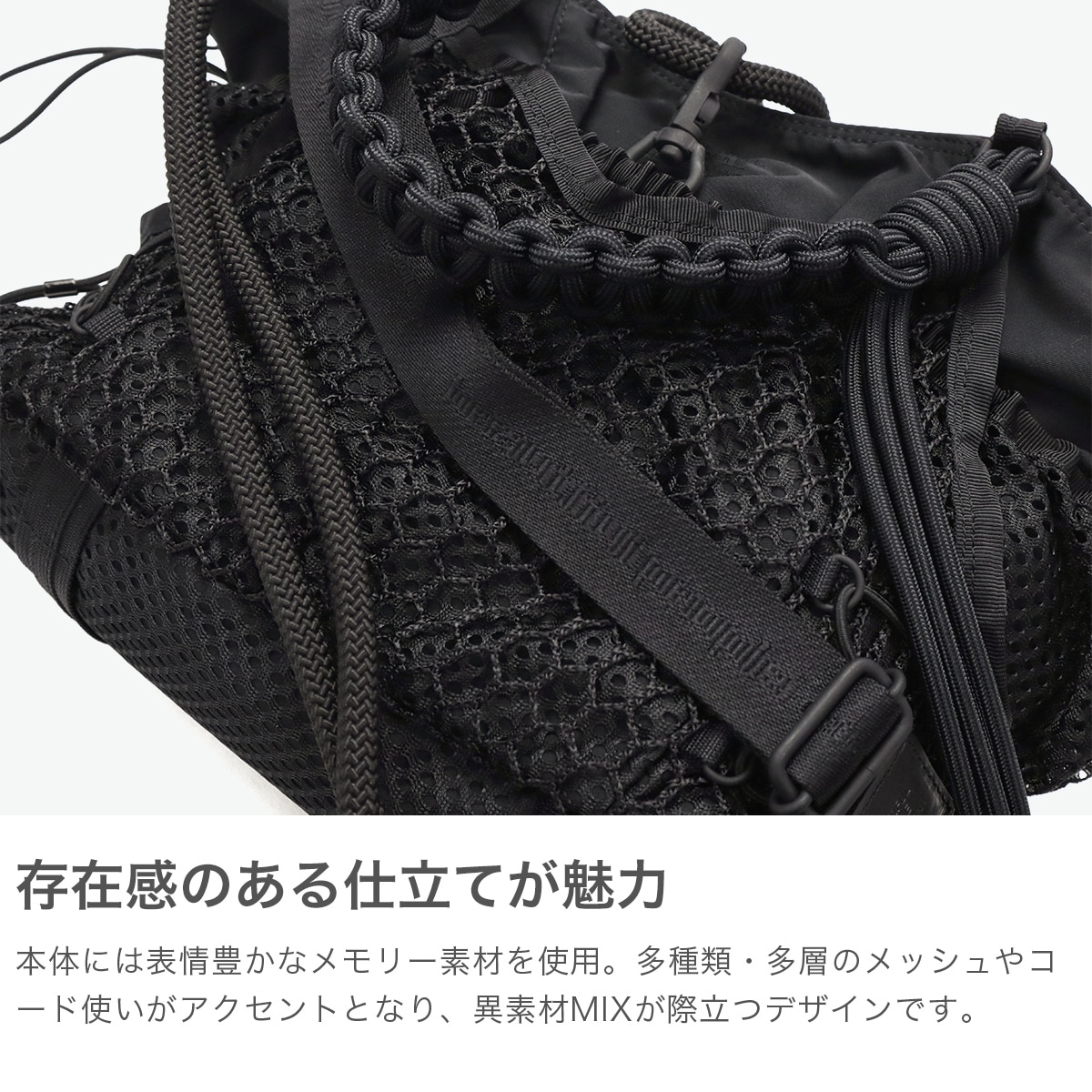 ブラックをベースに異素材MIXしたトートバッグ。多層のメッシュやコード使い、ハンドクラフトで編み込んだハンドルが特徴です。さりげなく施されたブランドのロゴ刺繍もポイント。個性が光る、存在感抜群のデザインに仕上がっています。