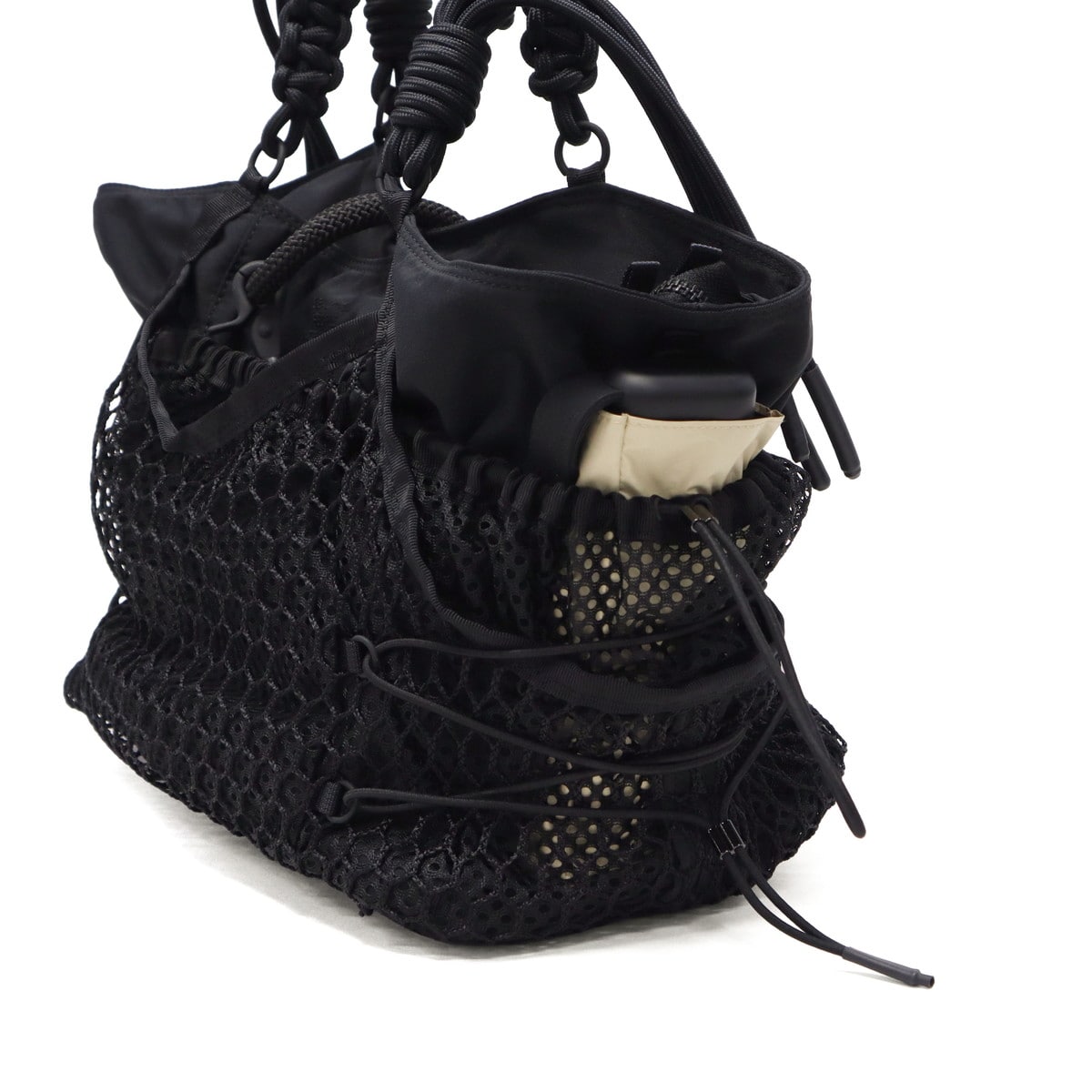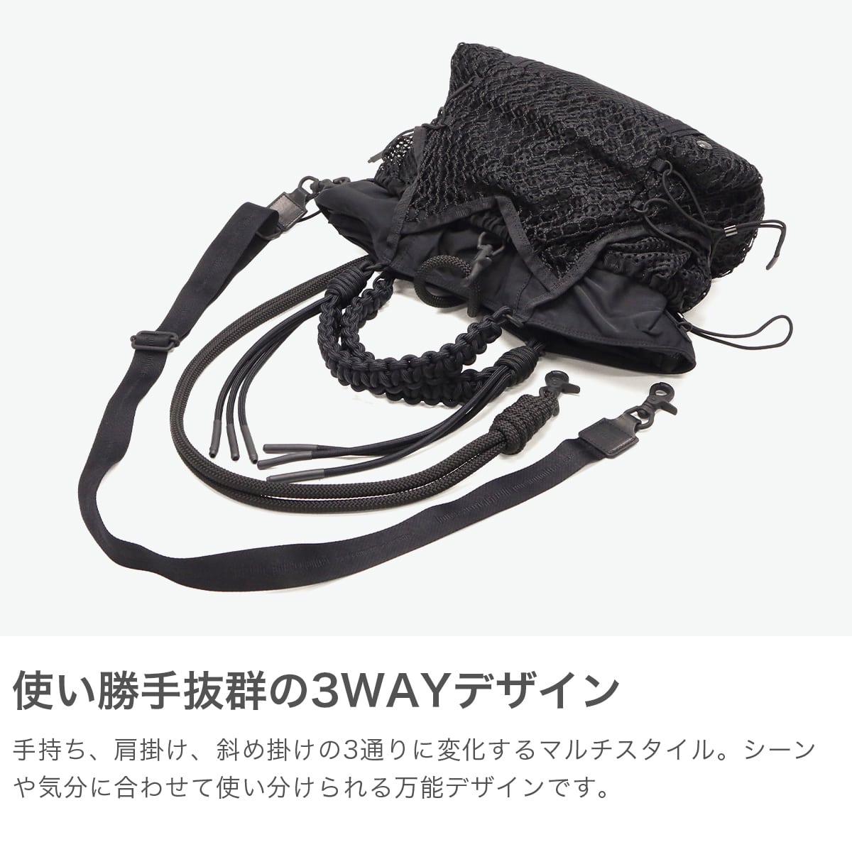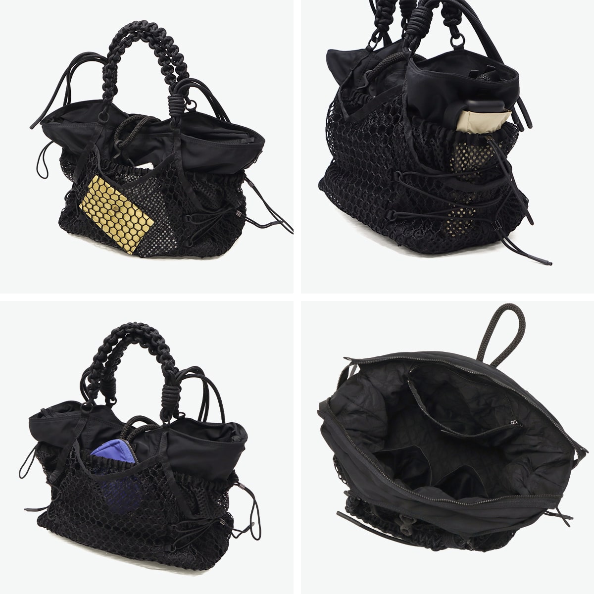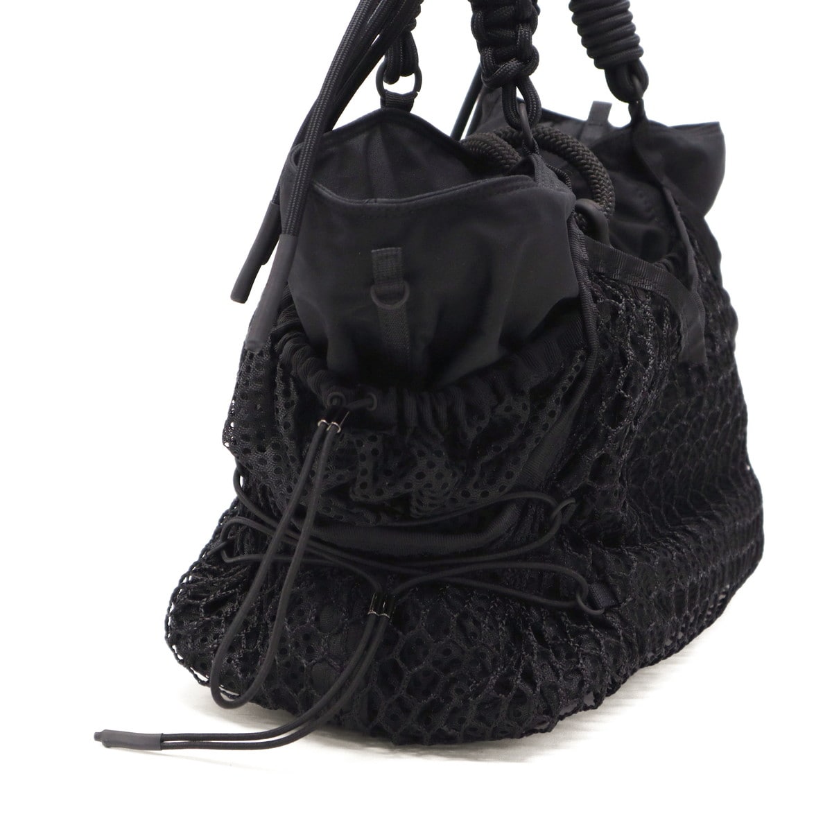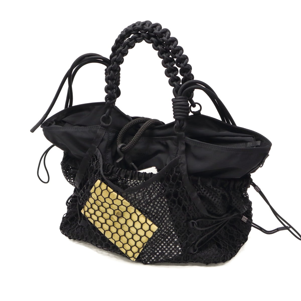 ブラックをベースに異素材MIXしたトートバッグ。多層のメッシュやコード使い、ハンドクラフトで編み込んだハンドルが特徴です。さりげなく施されたブランドのロゴ刺繍もポイント。個性が光る、存在感抜群のデザインに仕上がっています。