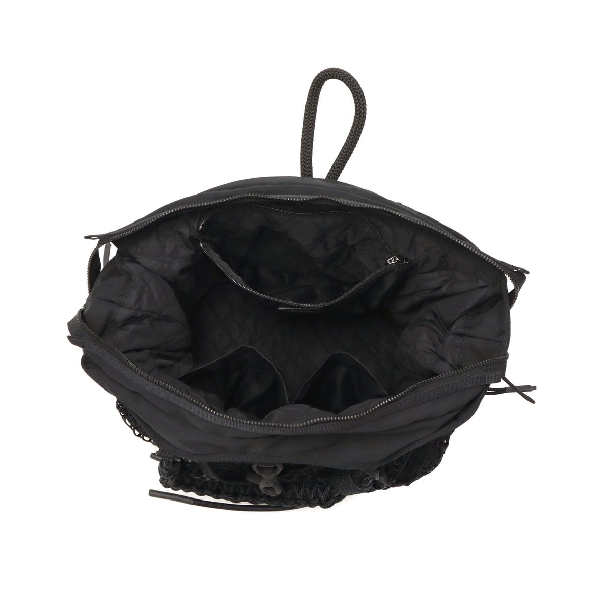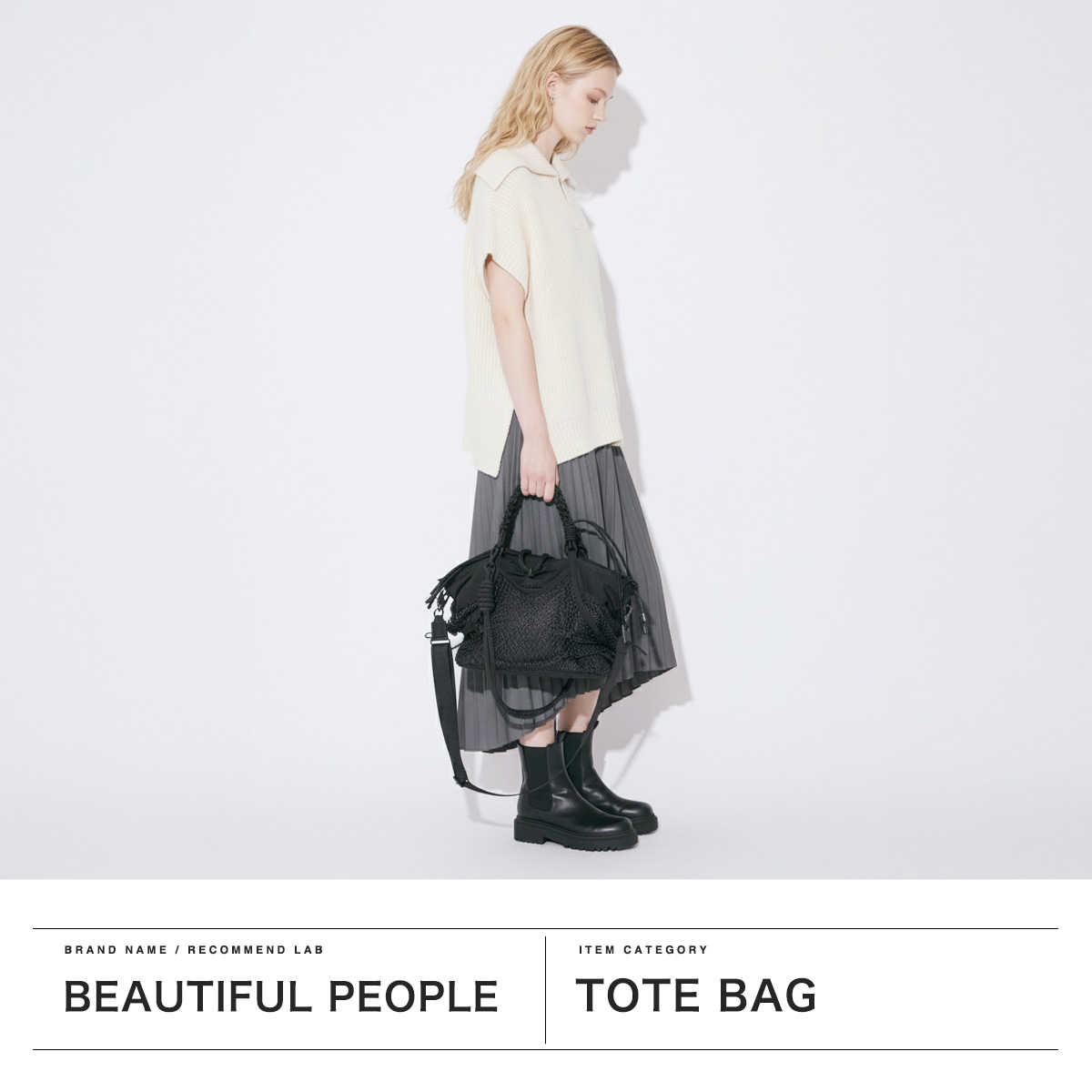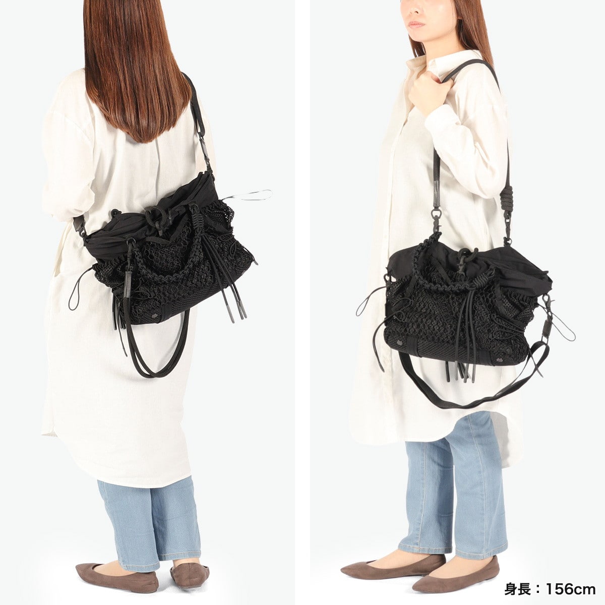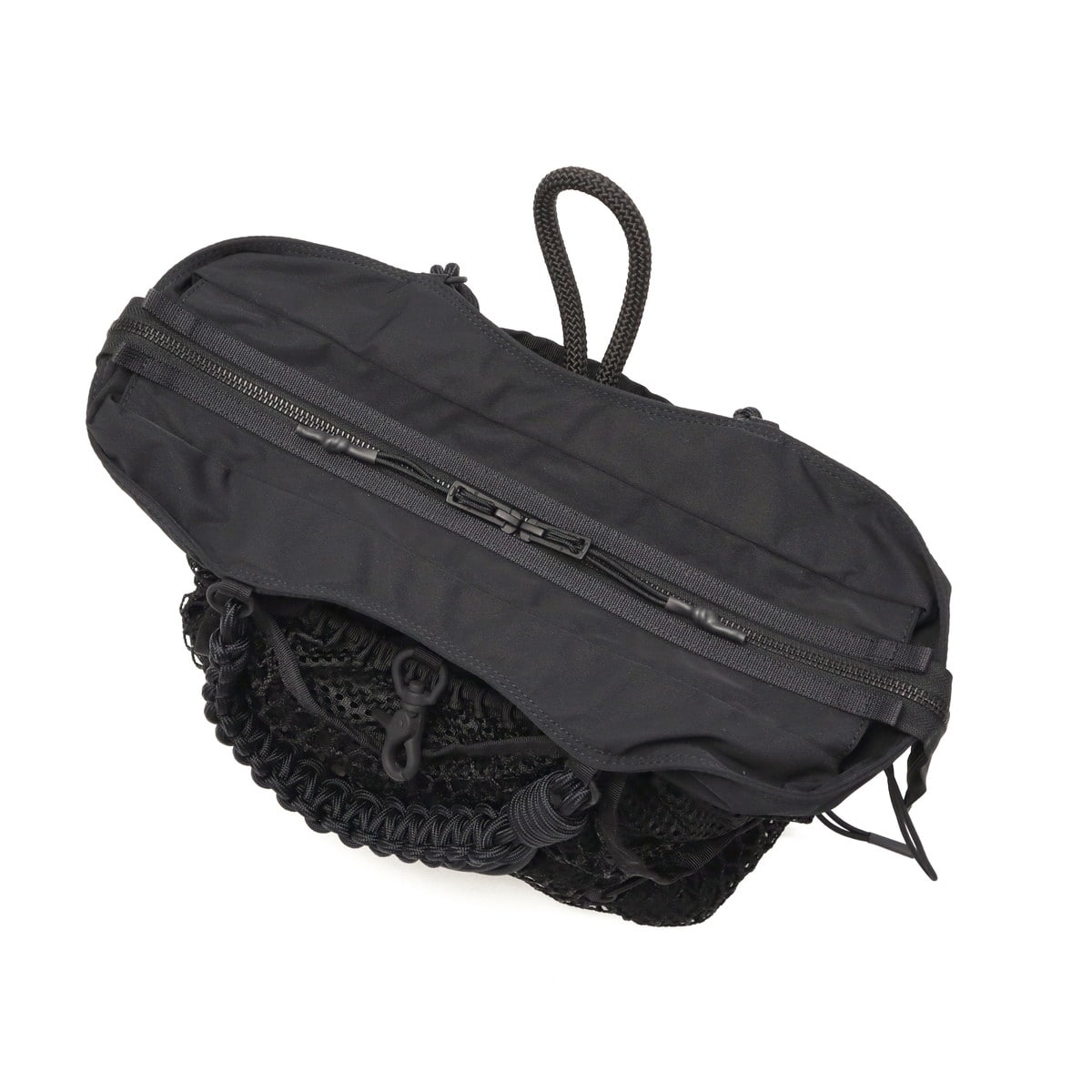 ブラックをベースに異素材MIXしたトートバッグ。多層のメッシュやコード使い、ハンドクラフトで編み込んだハンドルが特徴です。さりげなく施されたブランドのロゴ刺繍もポイント。個性が光る、存在感抜群のデザインに仕上がっています。