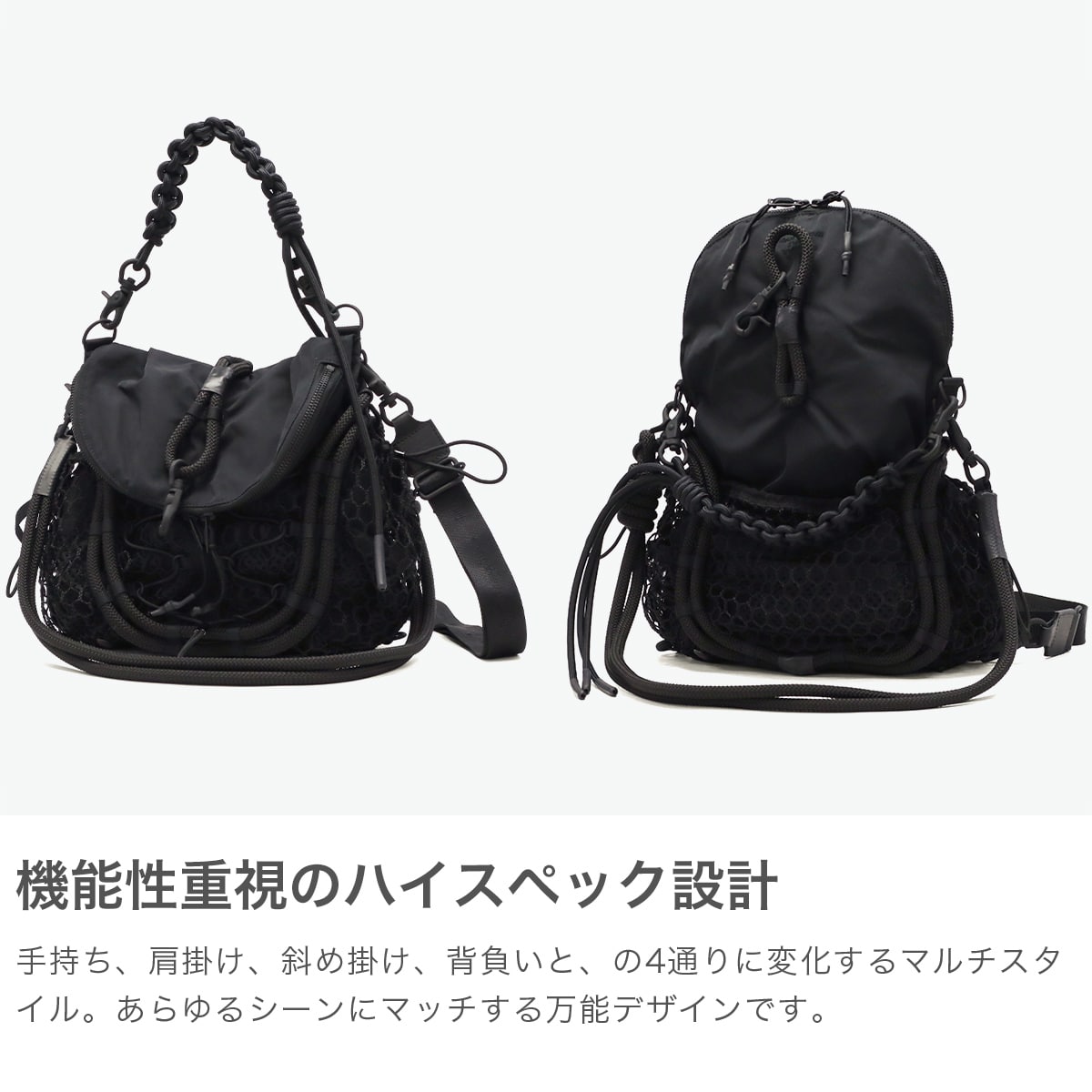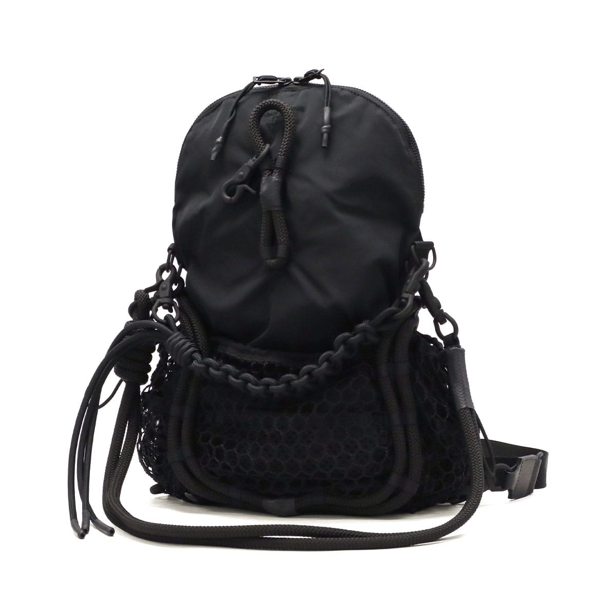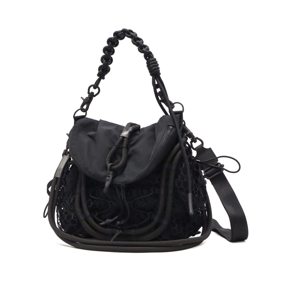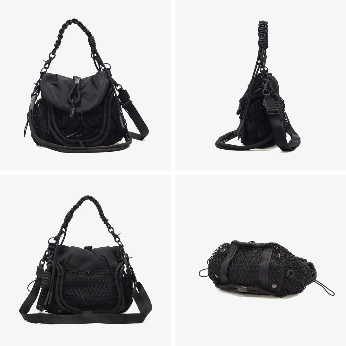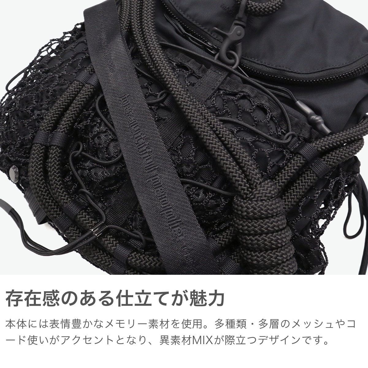 ブラックをベースに異素材MIXしたショルダーバッグ。多層のメッシュやコード使い、ハンドクラフトで編み込んだハンドルが特徴です。さりげなく施されたブランドのロゴ刺繍もポイント。個性が光る、存在感抜群のデザインに仕上がっています。