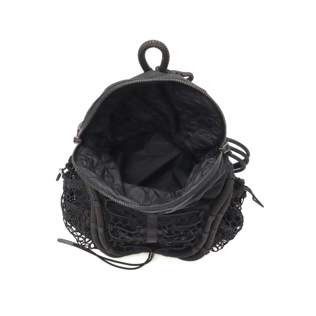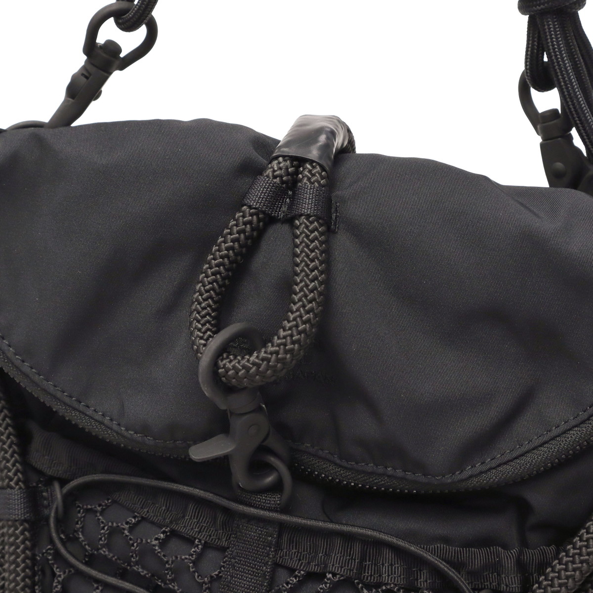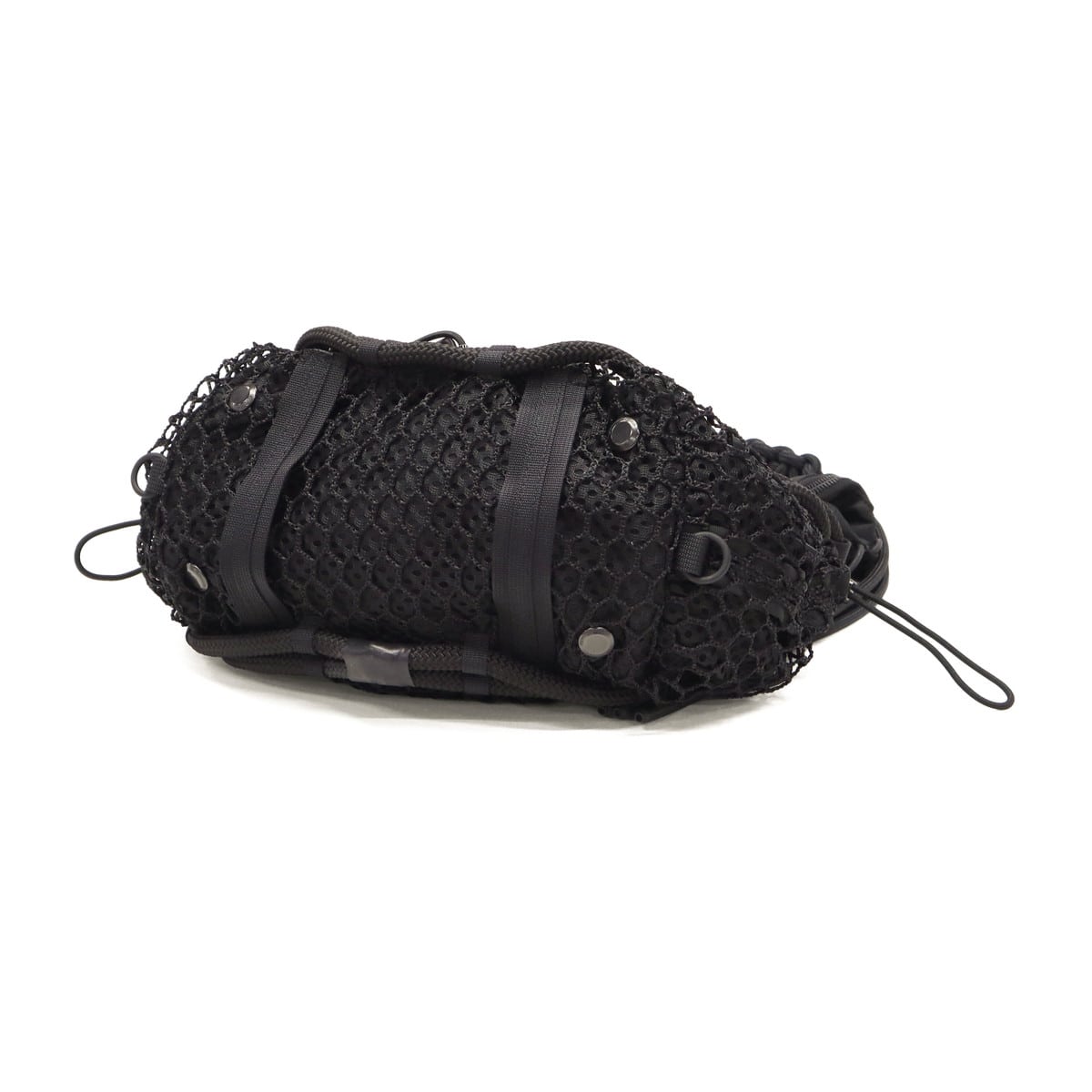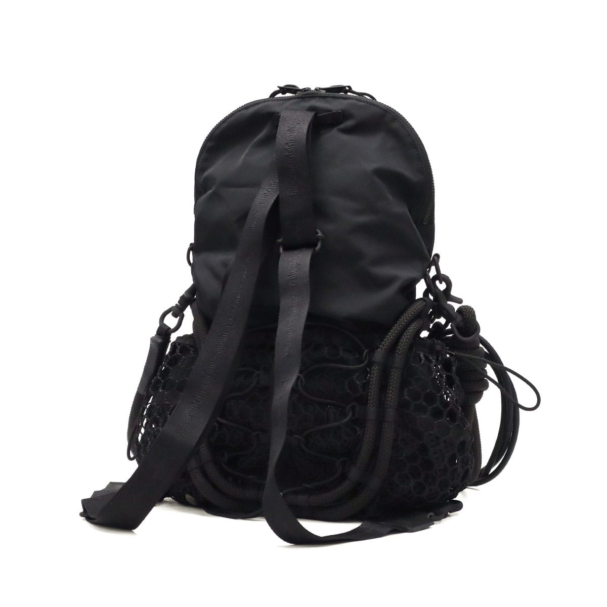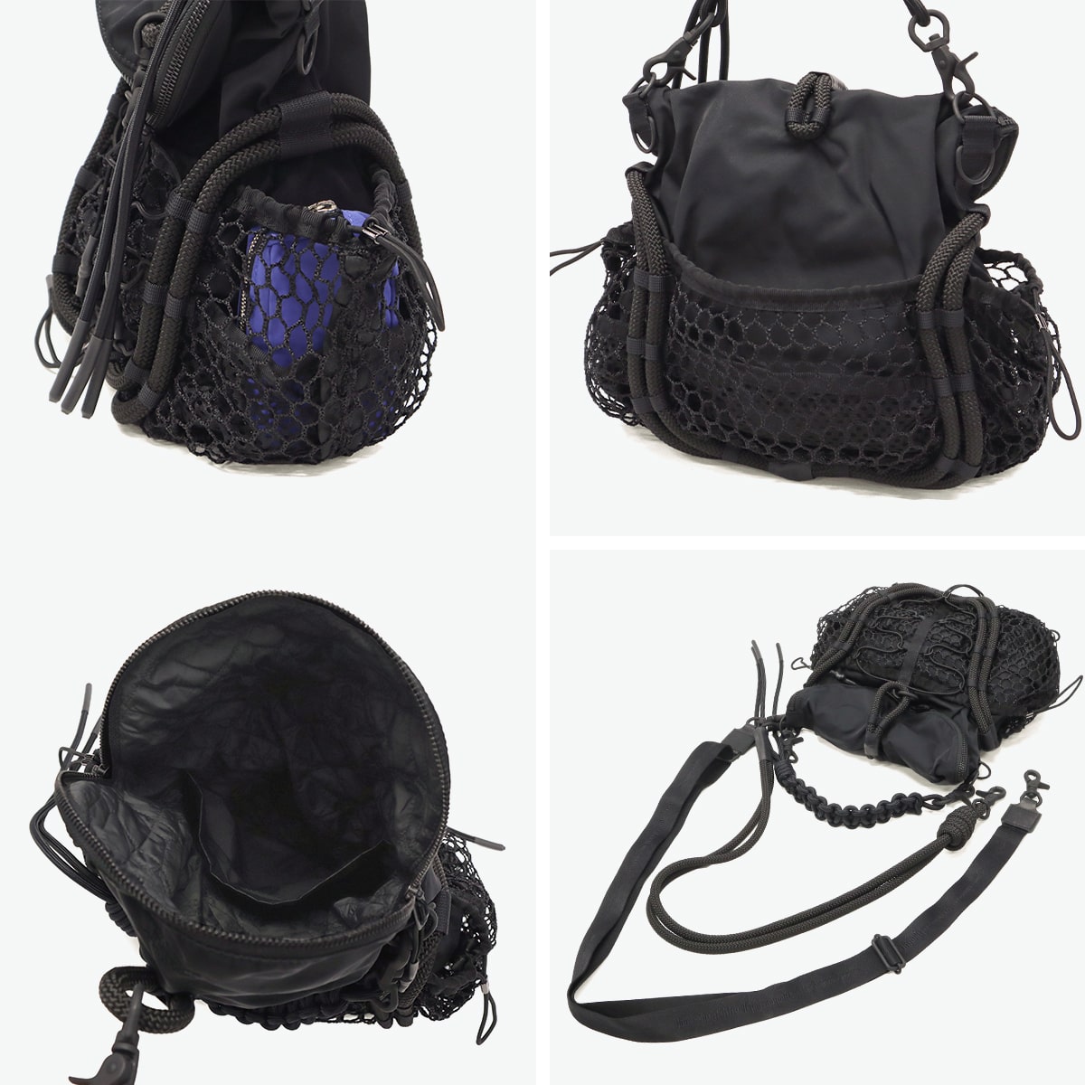 ブラックをベースに異素材MIXしたショルダーバッグ。多層のメッシュやコード使い、ハンドクラフトで編み込んだハンドルが特徴です。さりげなく施されたブランドのロゴ刺繍もポイント。個性が光る、存在感抜群のデザインに仕上がっています。