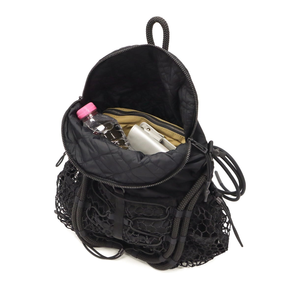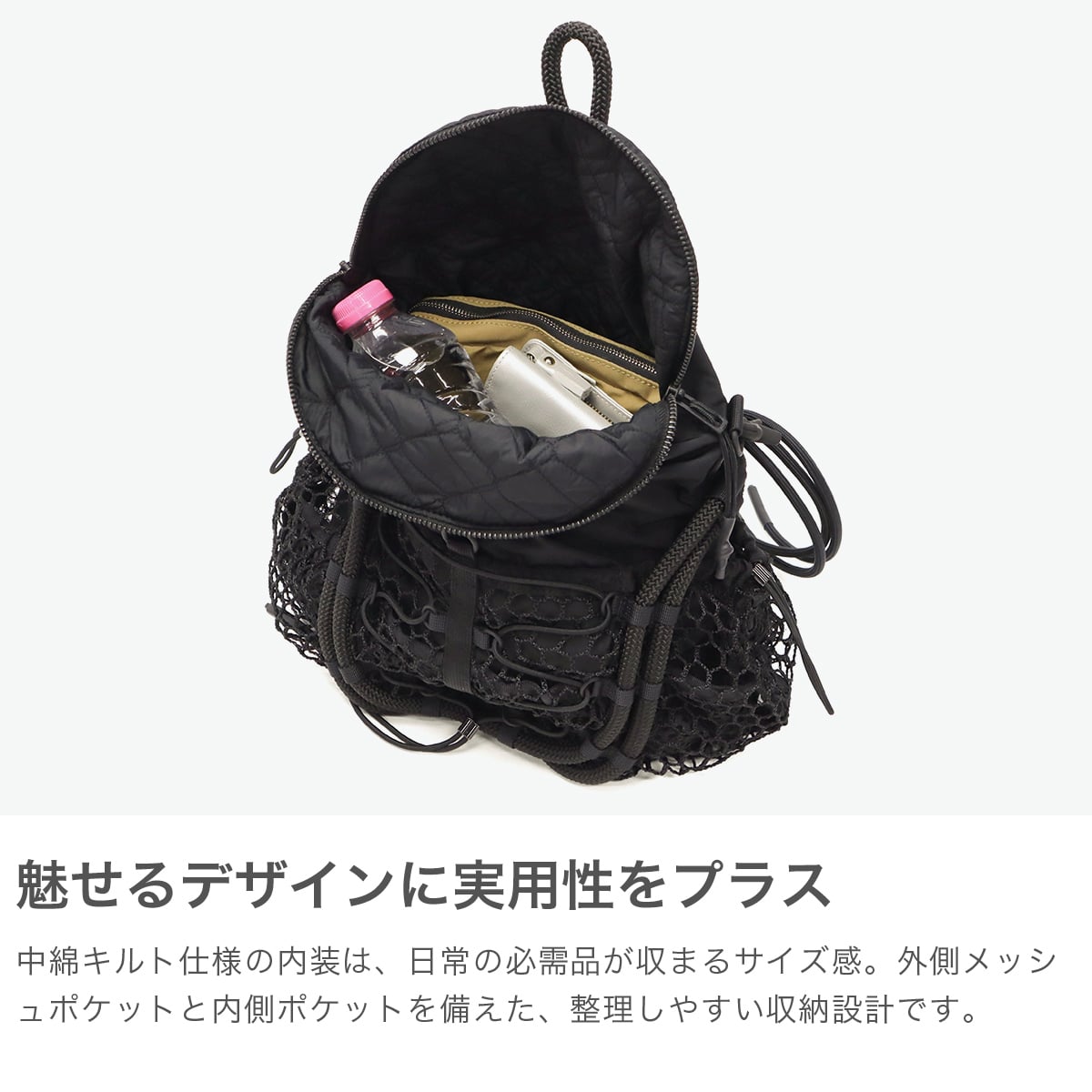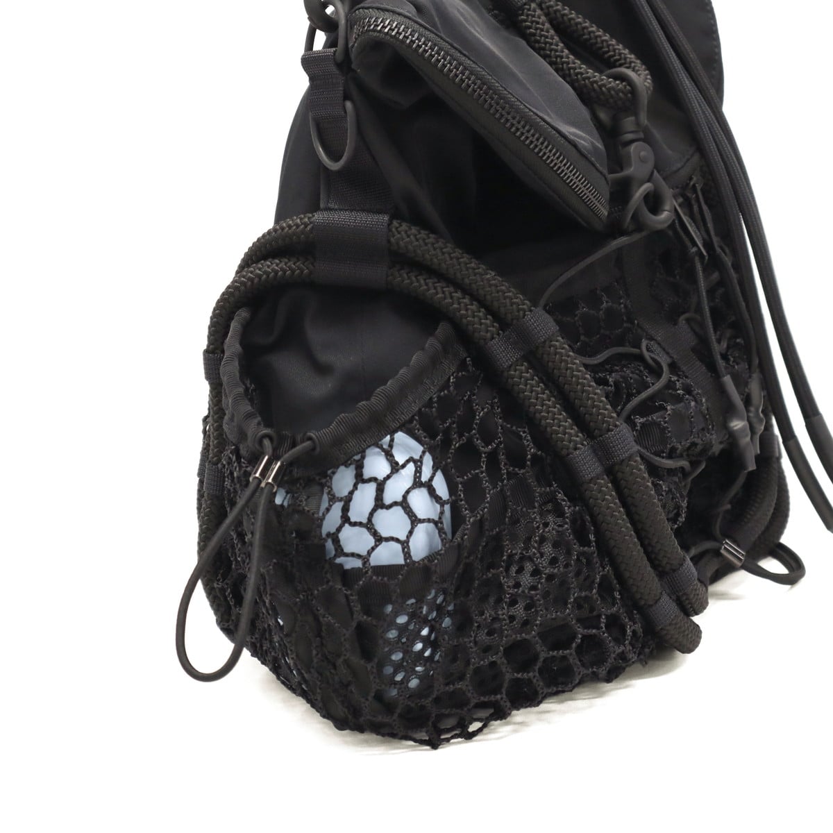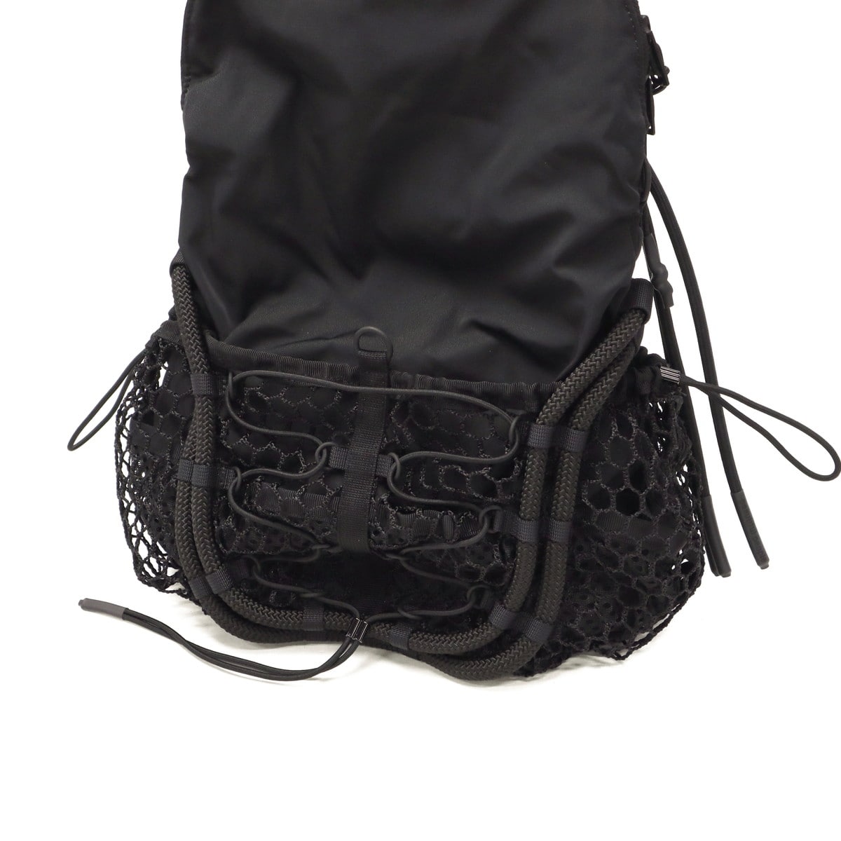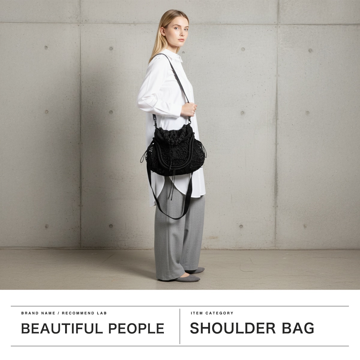 ブラックをベースに異素材MIXしたショルダーバッグ。多層のメッシュやコード使い、ハンドクラフトで編み込んだハンドルが特徴です。さりげなく施されたブランドのロゴ刺繍もポイント。個性が光る、存在感抜群のデザインに仕上がっています。