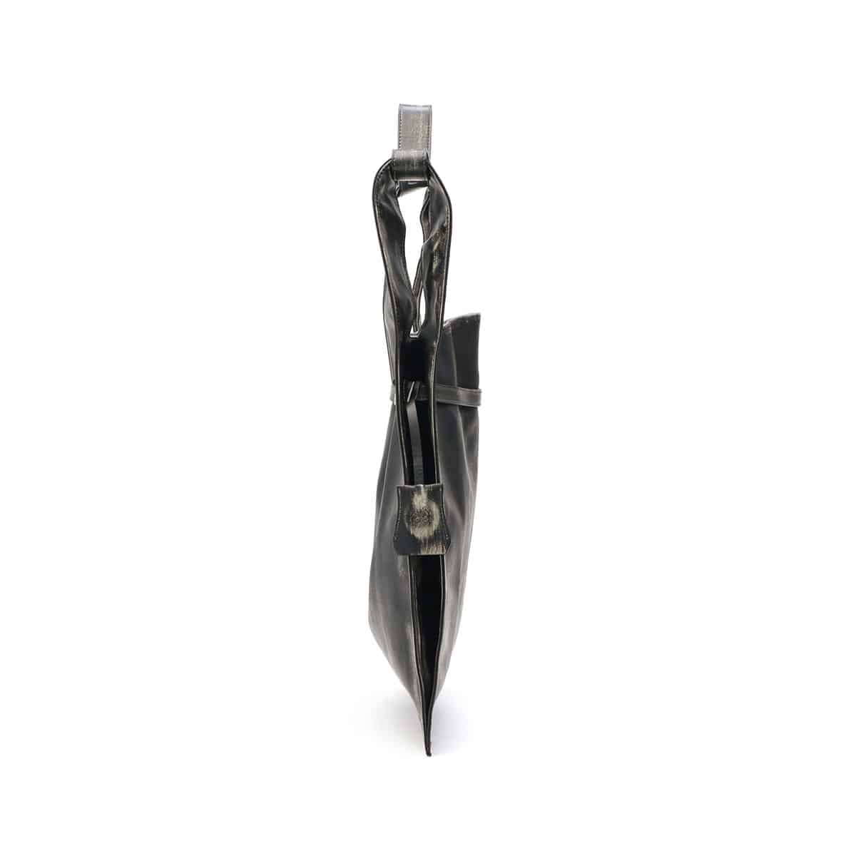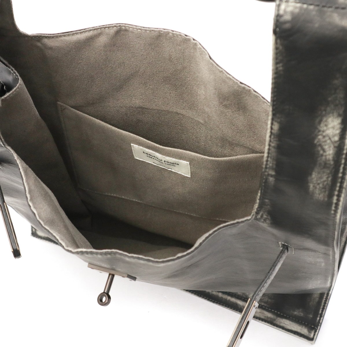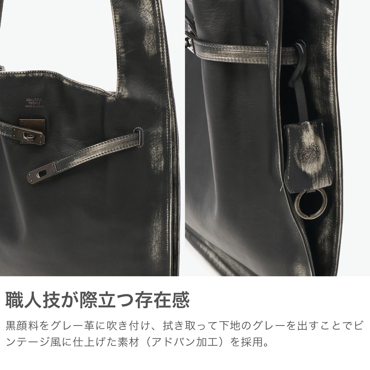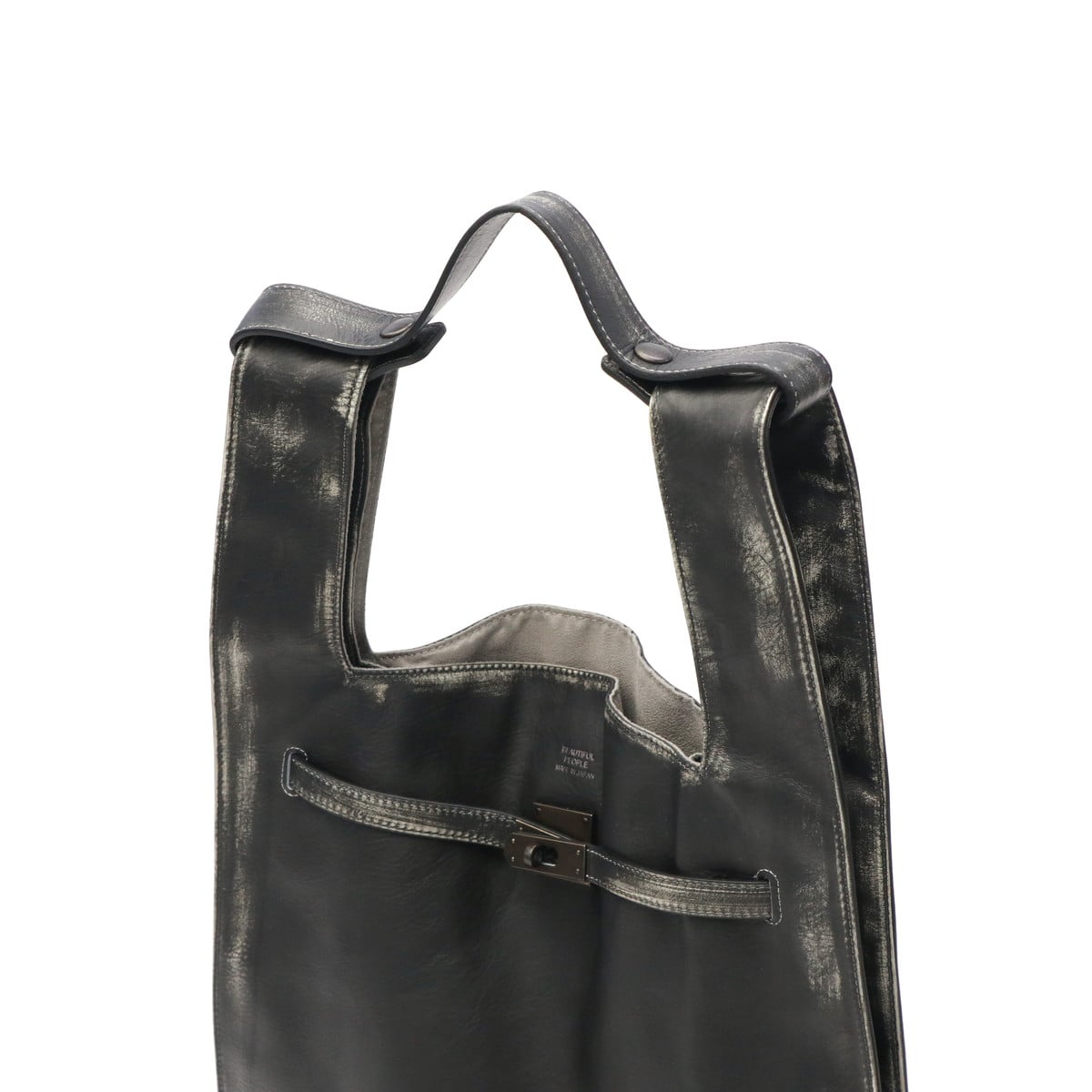 マーケットバッグをモチーフとしたデザインと金具の組み合わせが特徴のトートバッグ。「高価」と「安価」、「理想」と「現実」など相反する要素を融合した、個性が光るデザインに仕上がっています。ビンテージ感を表現するため手作業で一つ一つ色を落とし、異なる表情を実現。面白味のあるデザインとこだわりの詰まった素材で、ブランドの世界観を存分に表現しています。