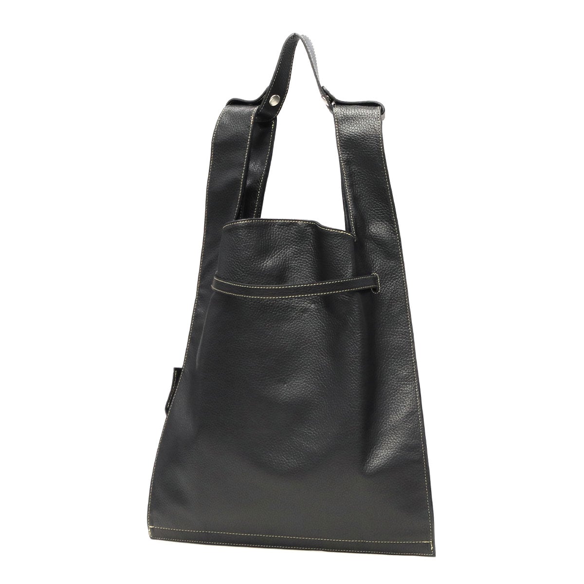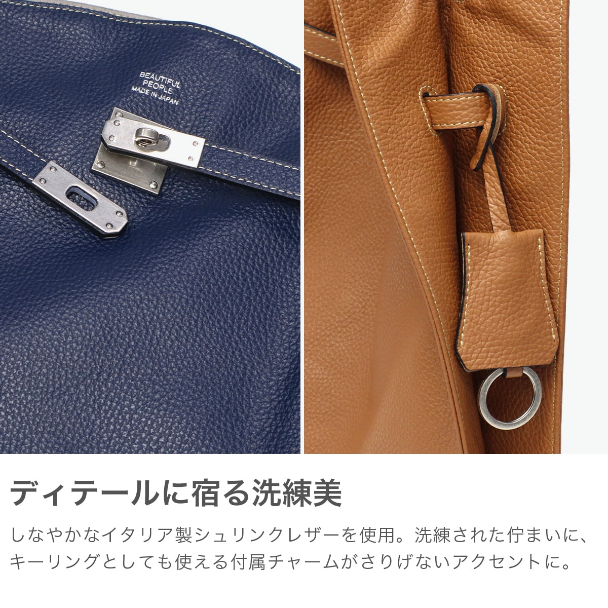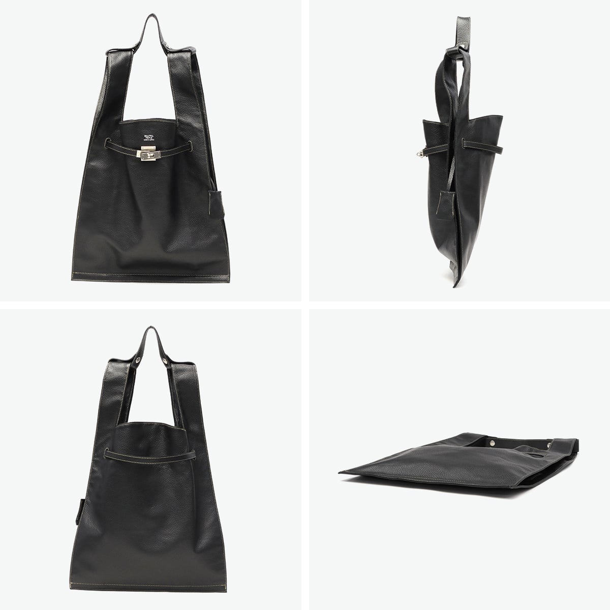 イタリア製シュリンクレザーを使用したA4トートバッグ。マーケットバッグと金具の組み合わせが特徴で、「高価」と「安価」、「理想」と「現実」など相反する要素を融合したデザインに仕上がっています。付属のチャームはキーリングとしても使用可能。裏地には手触りの良い起毛ポリエステルを採用し、使い心地も快適です。ハンドルにレザーベルトを装着することで、ワンショルダーバッグとしてもご使用いただけます。