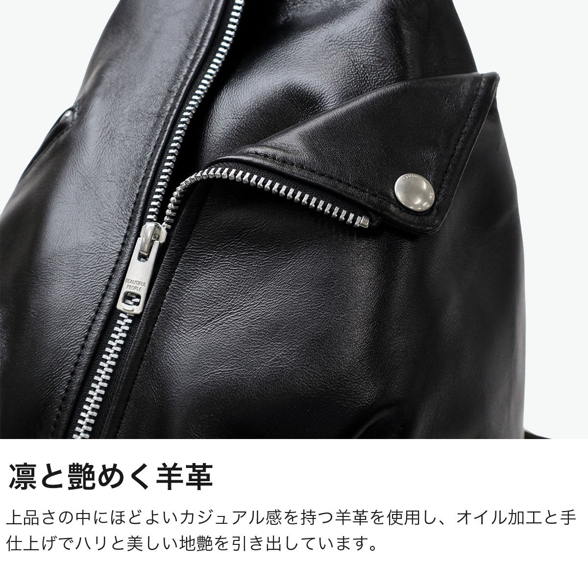 『beautiful people/ビューティフルピープル』の、ブランドアイコンの定番ヴィンテージライダースジャケットのディティールを凝縮したバックパック。ショルダーストラップ部分のファスナーを閉じることで、ボディーバッグとしても使用可能な2WAY仕様。ソフトでなめらかな羊革を使用し、ハンドアイロンで仕上げることにより、ハリ感と艶感を併せ持ち美しい地艶のある表情に。上品さの中にもカジュアル感のある仕上がりで個性的で上質な逸品に仕上がっています。
