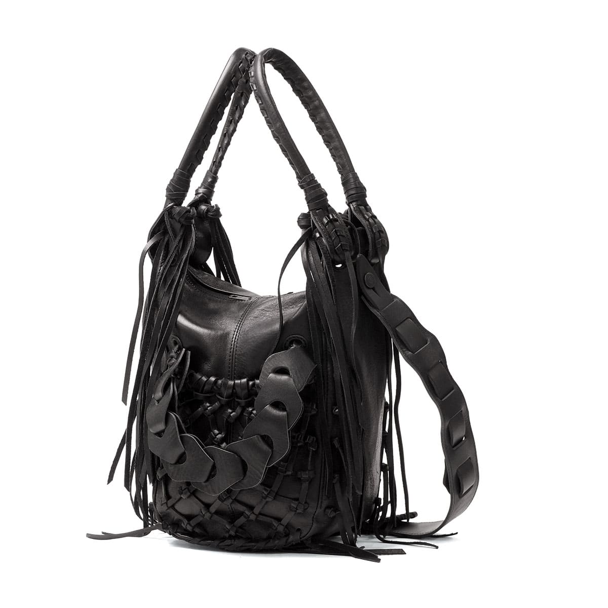 過剰なまでに詰め込まれた機能によって構成されるボンサック型バッグ。ハンドルの持ち方次第で、バッグの正面やシルエット、デザインが変わる仕様。着脱可能なギターストラップ型のショルダーベルト付きでショルダーバッグとしてもお使いいただける3WAYデザイン。本体は姫路レザーの馬革専門革屋「新喜皮革」の馬革を採用し、付属箇所は栃木レザー牛革を使用したこだわりの逸品。フリンジデザインが一際目を引くデザイン性の高い仕上がりとなっています。