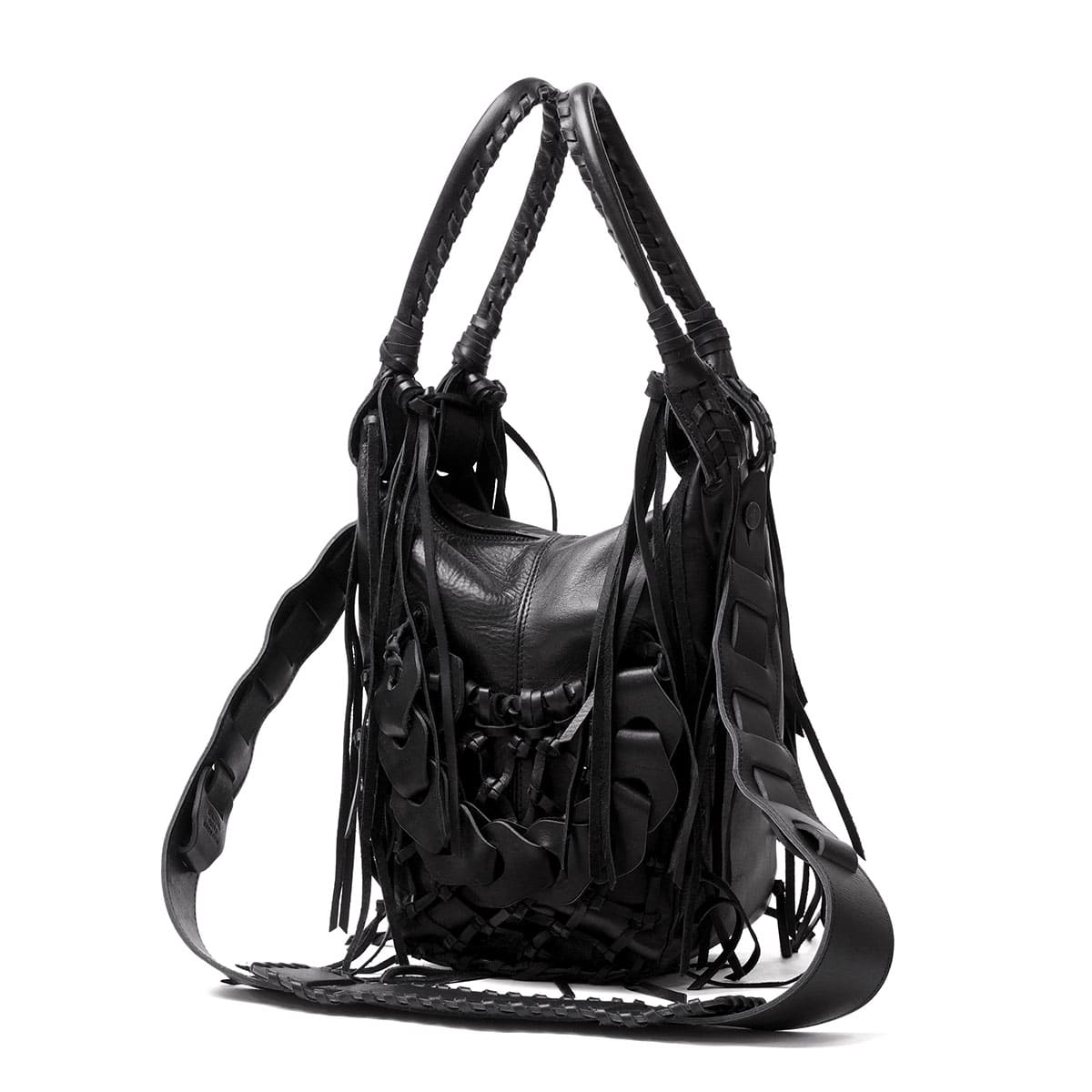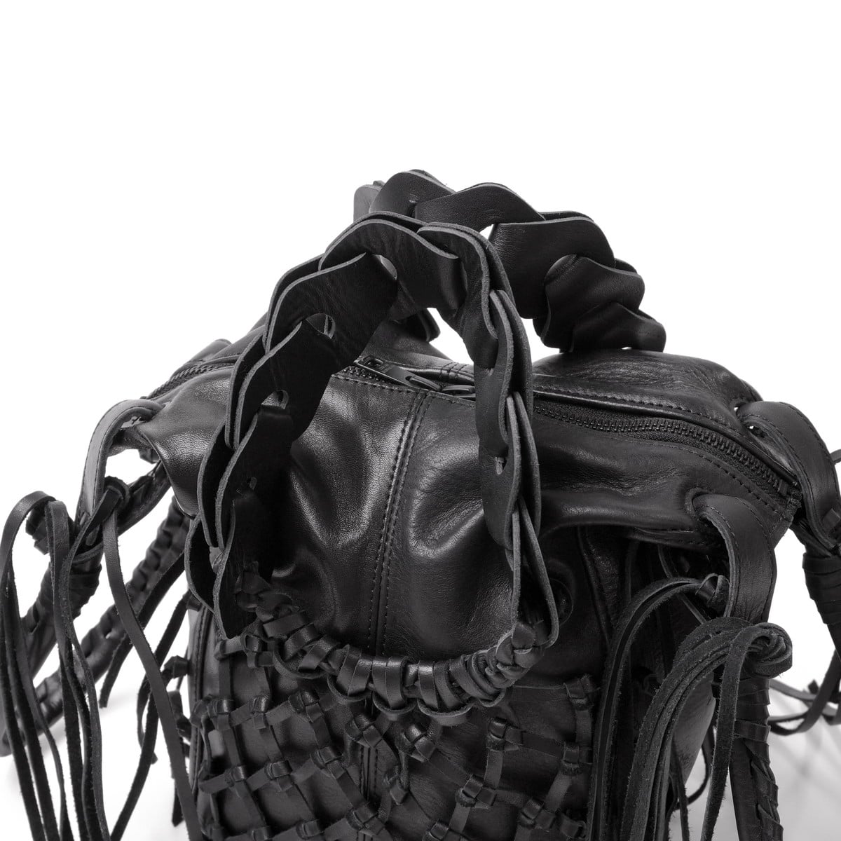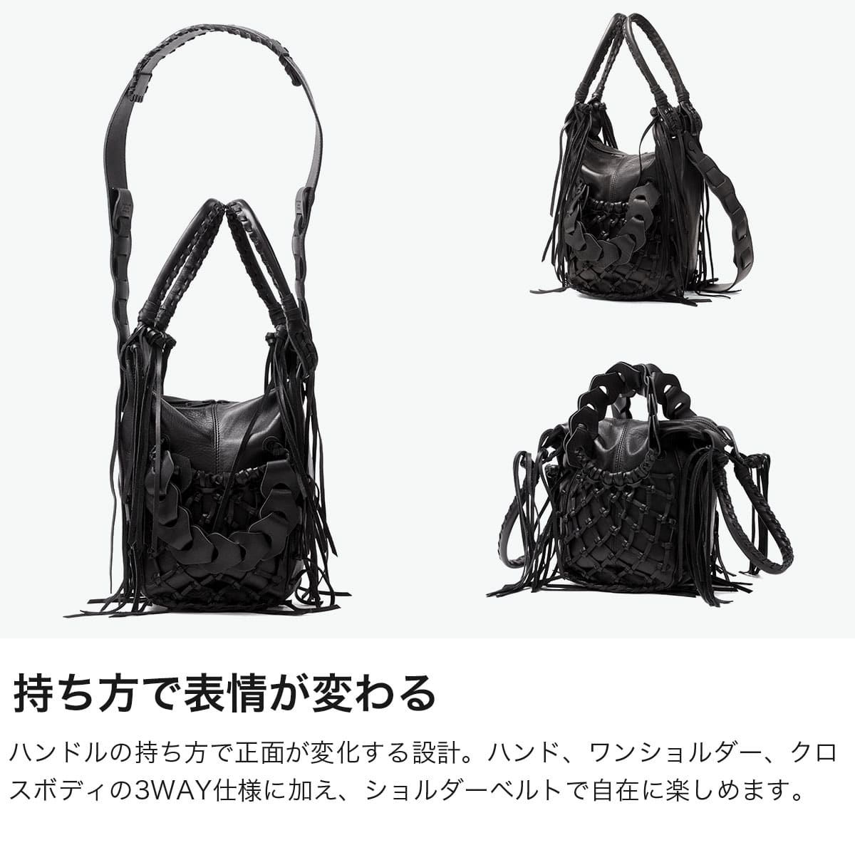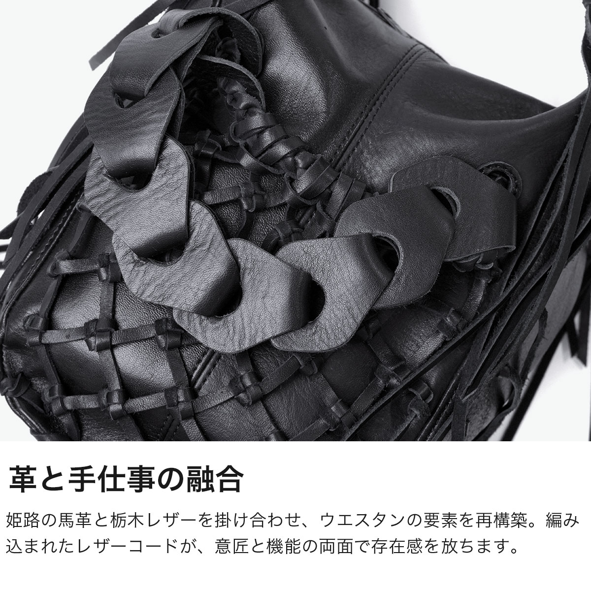 過剰なまでに詰め込まれた機能によって構成されるボンサック型バッグ。ハンドルの持ち方次第で、バッグの正面やシルエット、デザインが変わる仕様。着脱可能なギターストラップ型のショルダーベルト付きでショルダーバッグとしてもお使いいただける3WAYデザイン。本体は姫路レザーの馬革専門革屋「新喜皮革」の馬革を採用し、付属箇所は栃木レザー牛革を使用したこだわりの逸品。フリンジデザインが一際目を引くデザイン性の高い仕上がりとなっています。