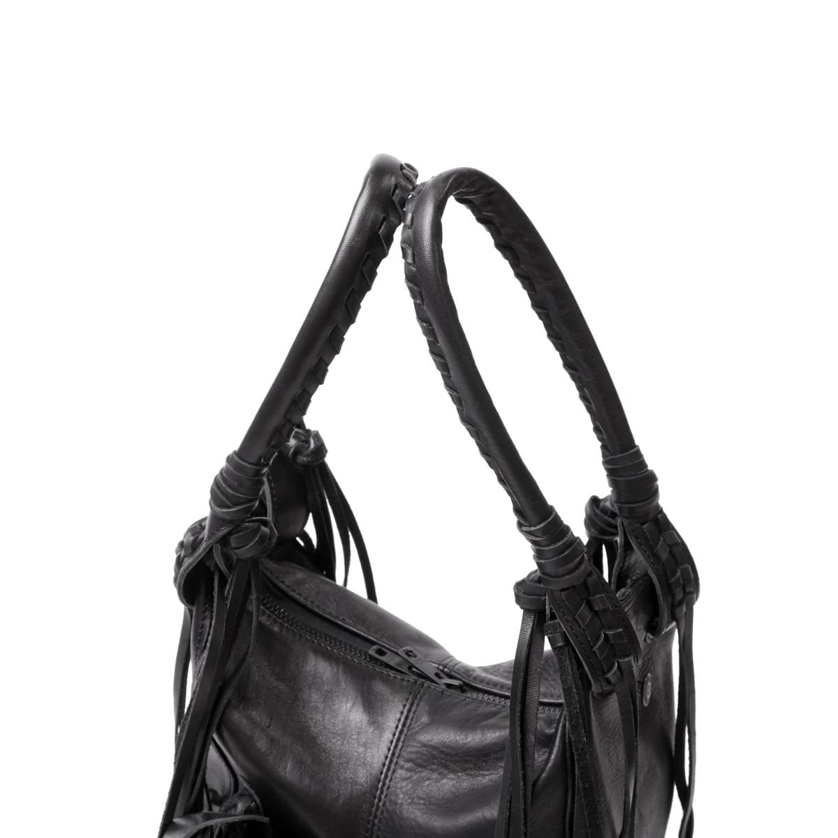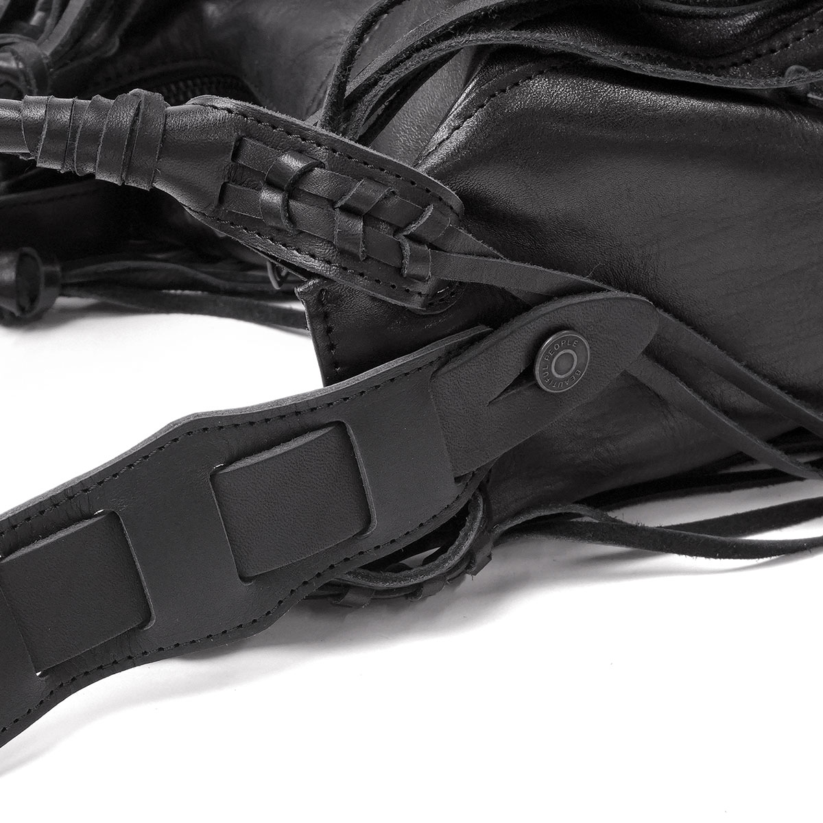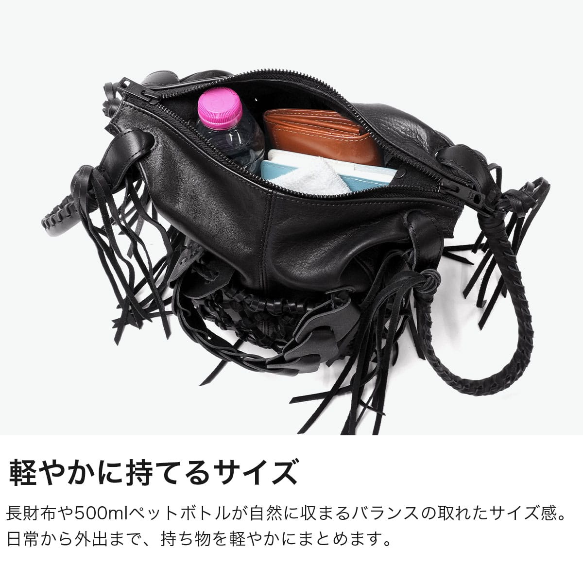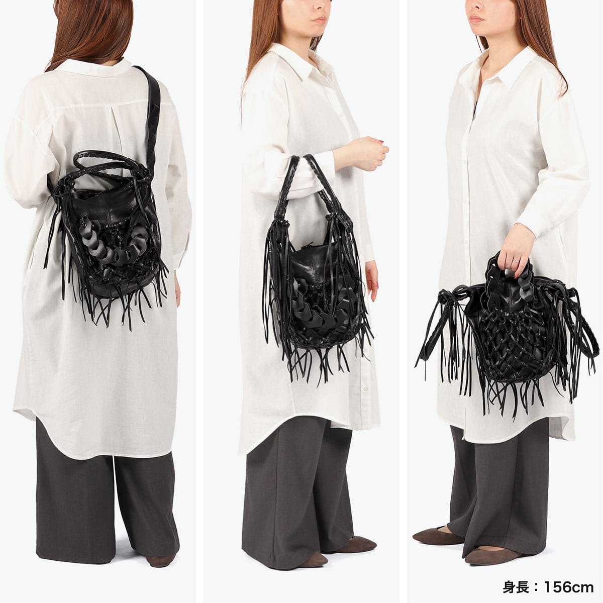 過剰なまでに詰め込まれた機能によって構成されるボンサック型バッグ。ハンドルの持ち方次第で、バッグの正面やシルエット、デザインが変わる仕様。着脱可能なギターストラップ型のショルダーベルト付きでショルダーバッグとしてもお使いいただける3WAYデザイン。本体は姫路レザーの馬革専門革屋「新喜皮革」の馬革を採用し、付属箇所は栃木レザー牛革を使用したこだわりの逸品。フリンジデザインが一際目を引くデザイン性の高い仕上がりとなっています。