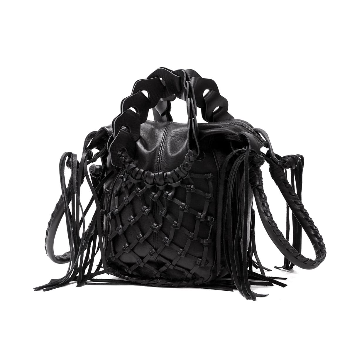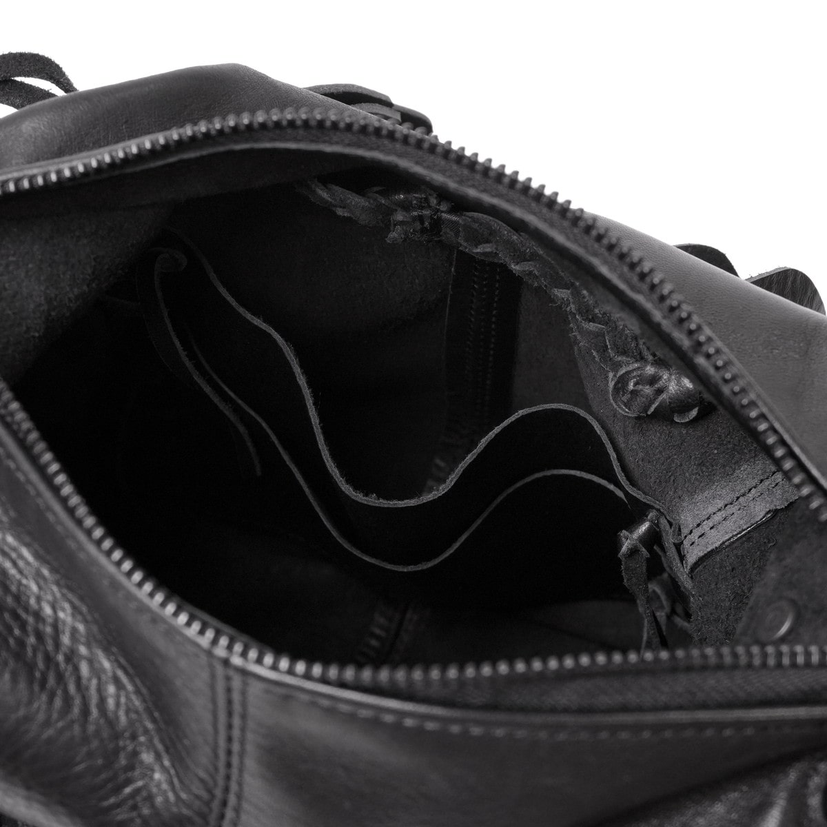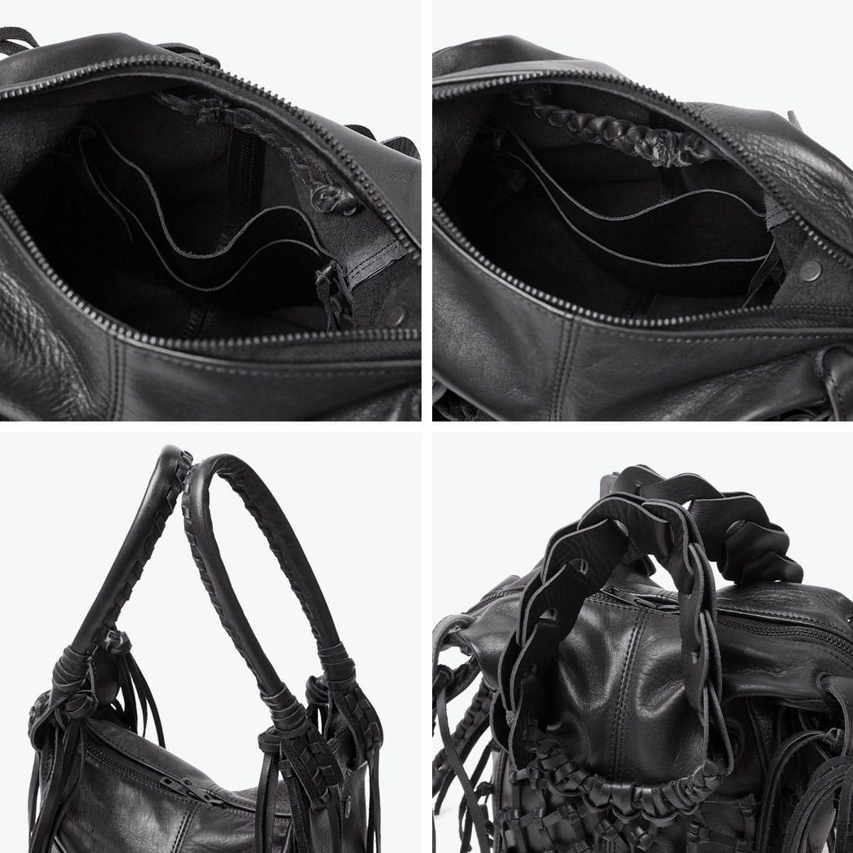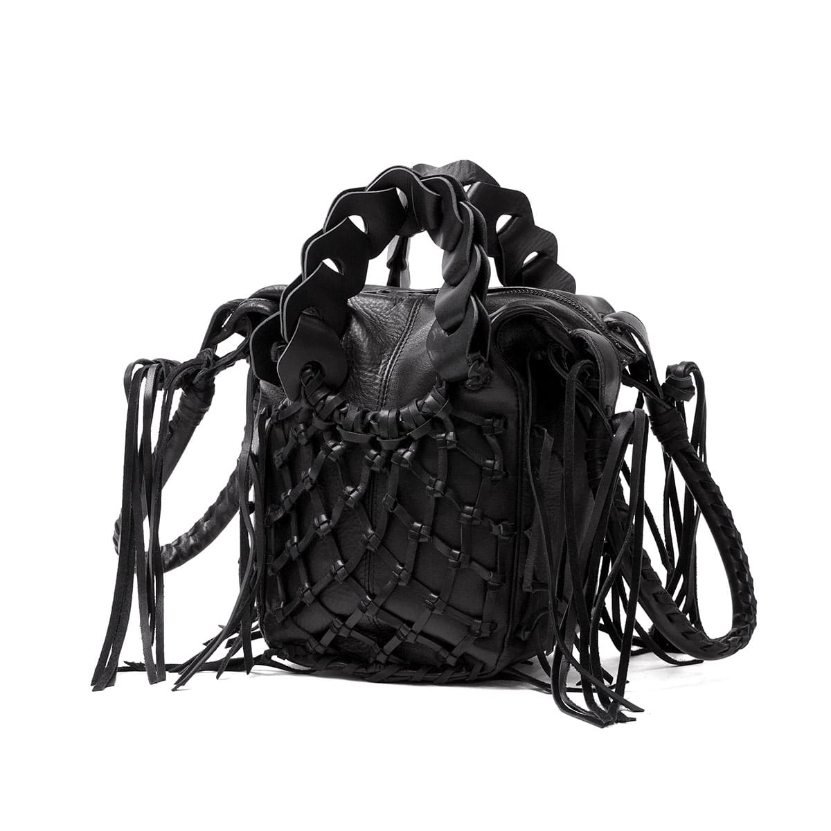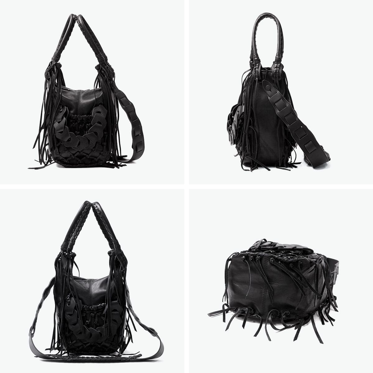 過剰なまでに詰め込まれた機能によって構成されるボンサック型バッグ。ハンドルの持ち方次第で、バッグの正面やシルエット、デザインが変わる仕様。着脱可能なギターストラップ型のショルダーベルト付きでショルダーバッグとしてもお使いいただける3WAYデザイン。本体は姫路レザーの馬革専門革屋「新喜皮革」の馬革を採用し、付属箇所は栃木レザー牛革を使用したこだわりの逸品。フリンジデザインが一際目を引くデザイン性の高い仕上がりとなっています。