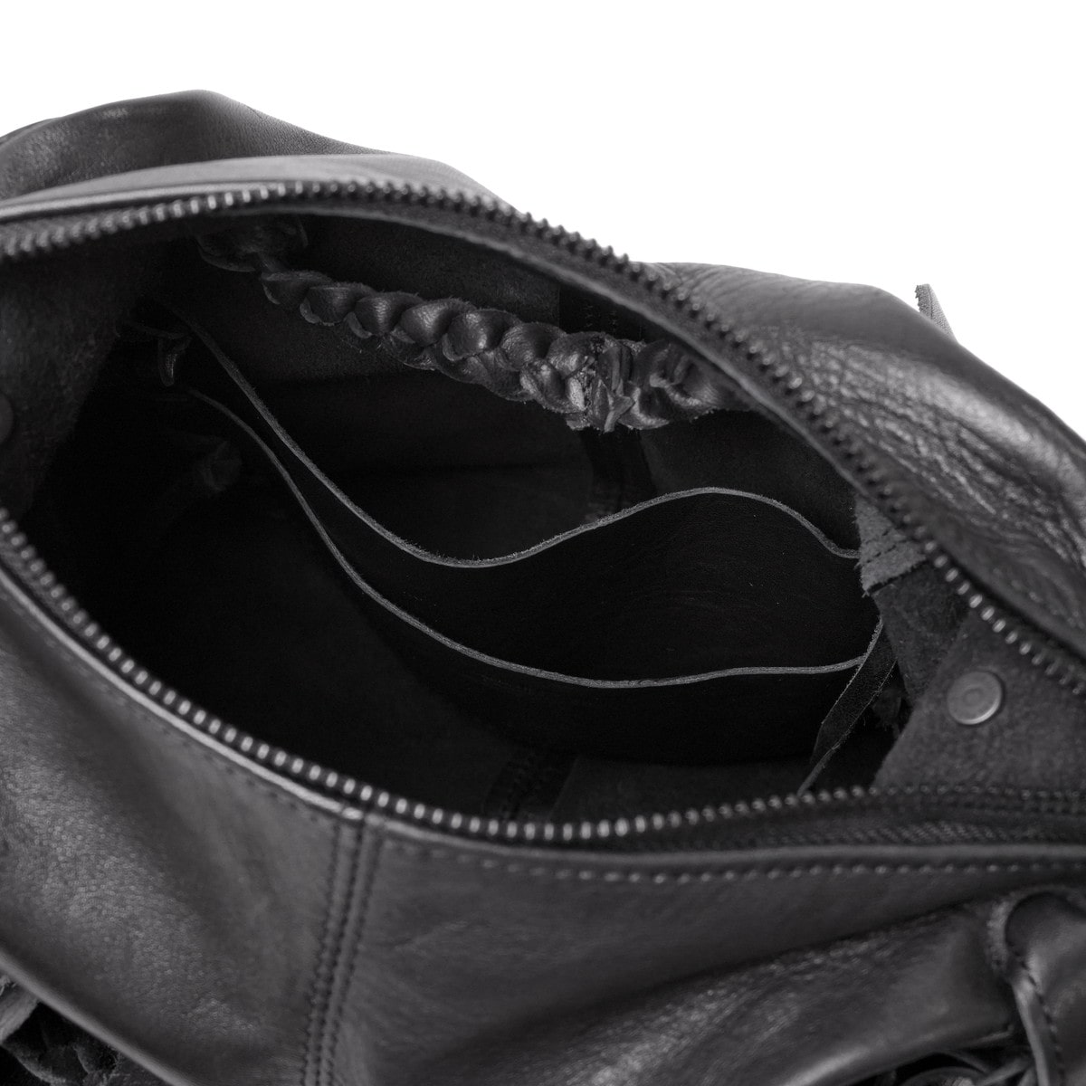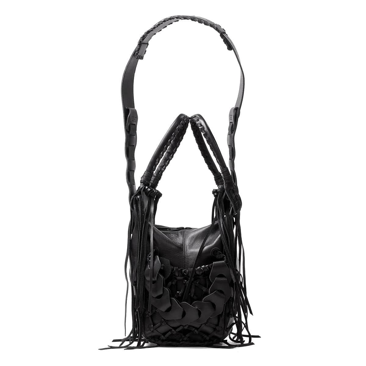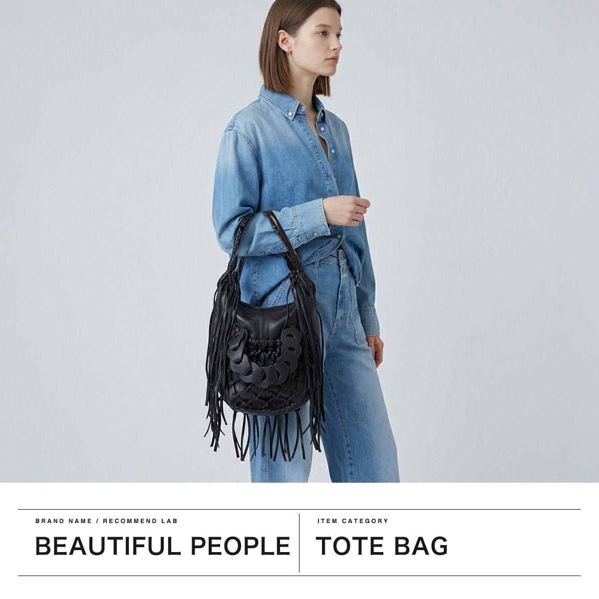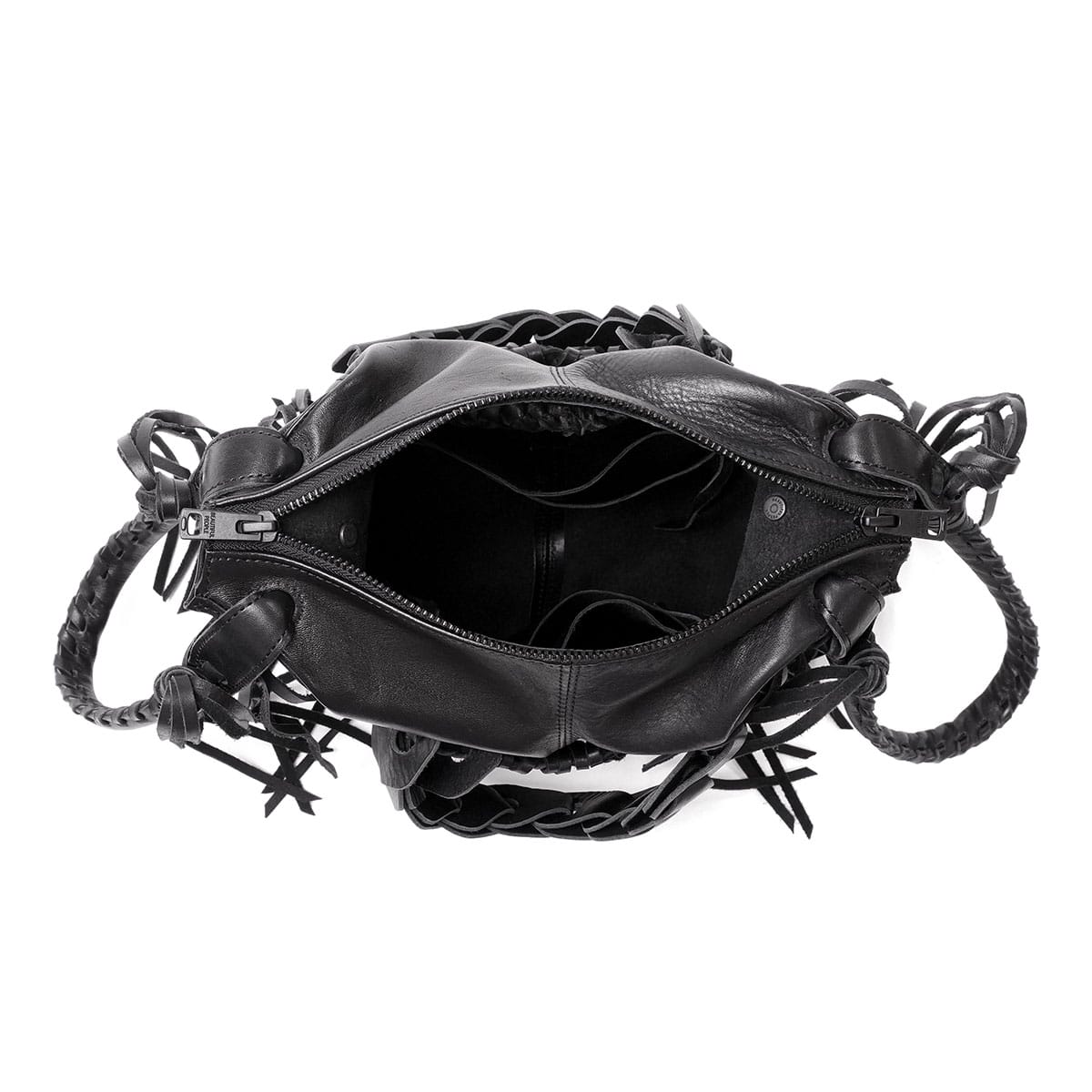 過剰なまでに詰め込まれた機能によって構成されるボンサック型バッグ。ハンドルの持ち方次第で、バッグの正面やシルエット、デザインが変わる仕様。着脱可能なギターストラップ型のショルダーベルト付きでショルダーバッグとしてもお使いいただける3WAYデザイン。本体は姫路レザーの馬革専門革屋「新喜皮革」の馬革を採用し、付属箇所は栃木レザー牛革を使用したこだわりの逸品。フリンジデザインが一際目を引くデザイン性の高い仕上がりとなっています。