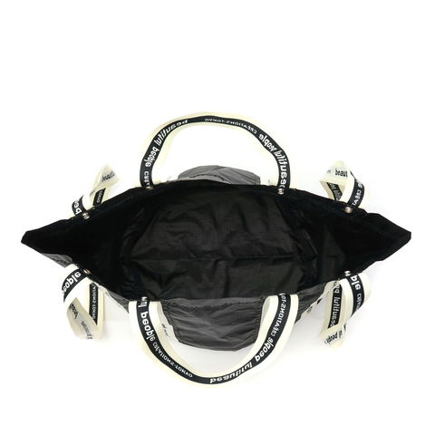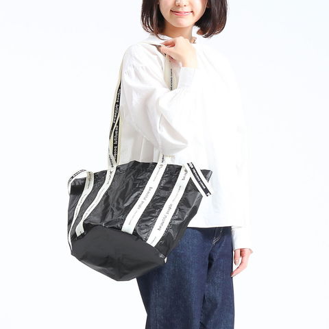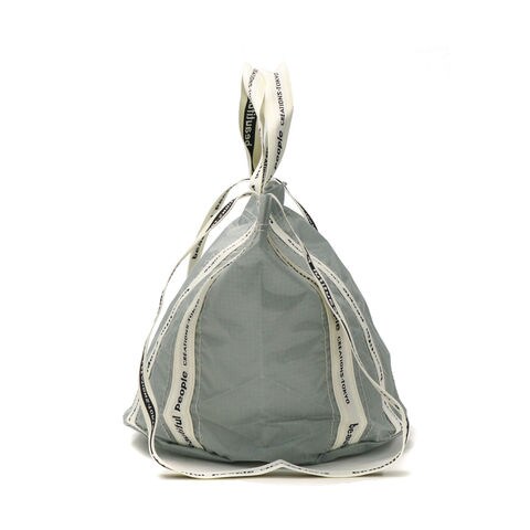 砂を運ぶビッグバッグからインスピレーションを受けデザインされた『sail cloth logo tape shift bag S』。シャラシャラと音がするお洒落な素材に、表裏で色の異なるオリジナルロゴテープを施した個性的な仕上がり。軽量でコンパクトにたためるので、普段使いはもちろん、旅行のサブバッグとしても。
