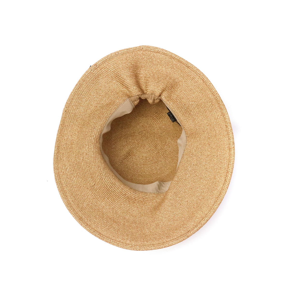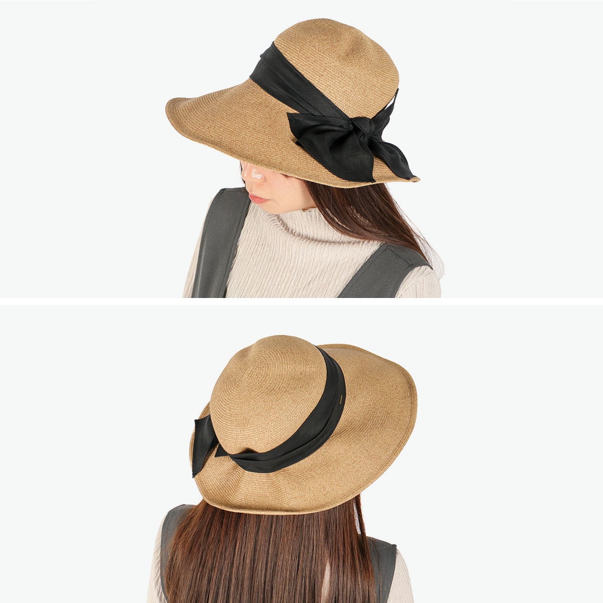 エレガントで高級感漂うキャペリンハット。ワイドブリムが顔周りの日差しをしっかりと遮り、バック部分は短くなって襟元に当たらない設計です。伸縮性のあるゴム仕様で安定したかぶり心地を提供◎涼しげなリネンリボンが品のある雰囲気を演出し、普段使いやリゾートシーンにも最適です。