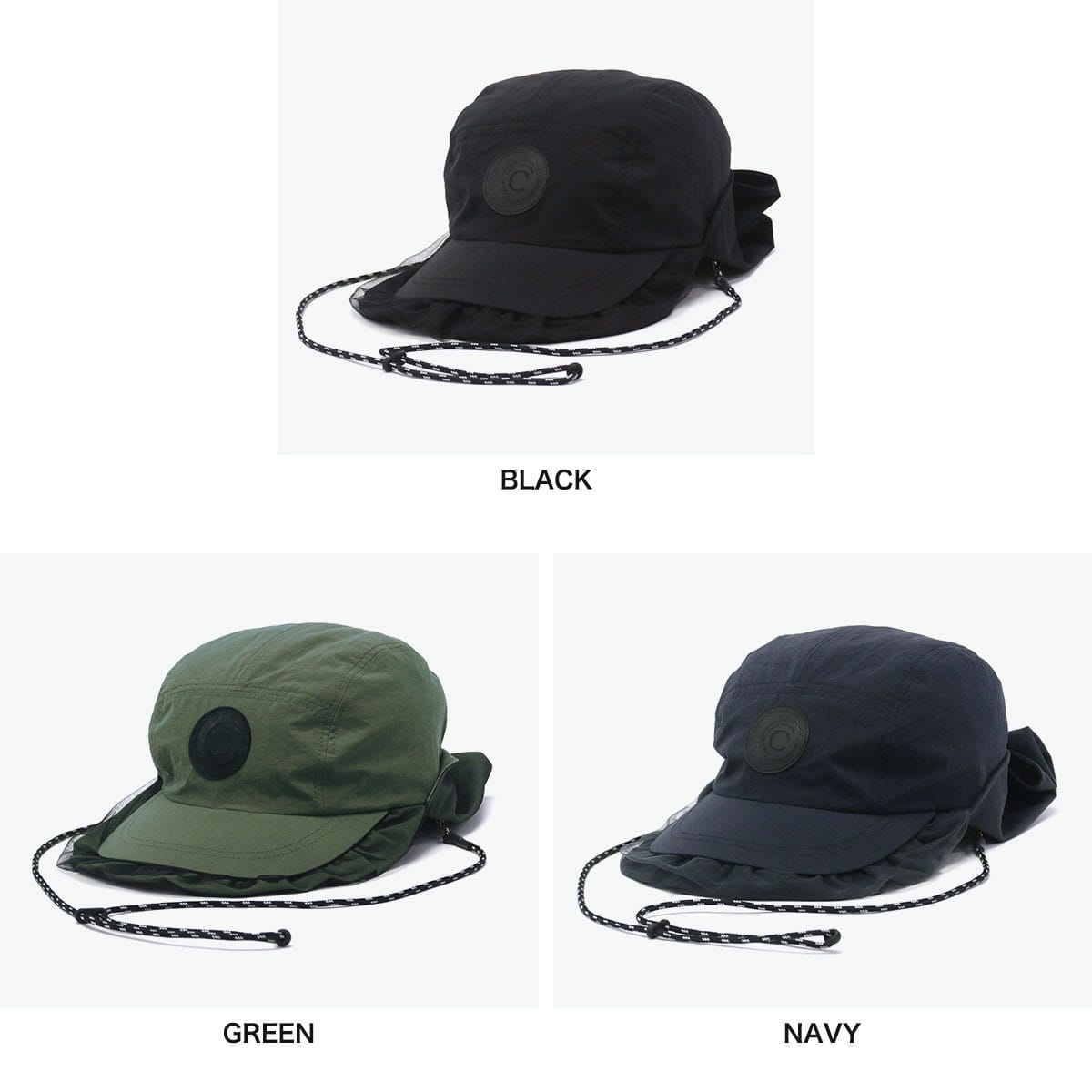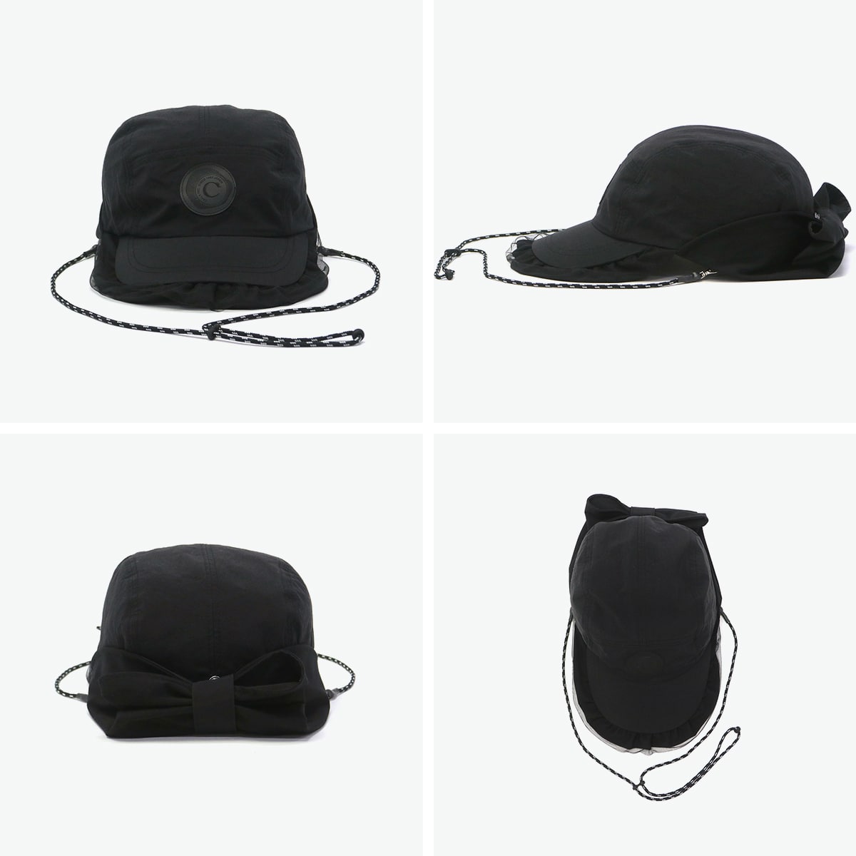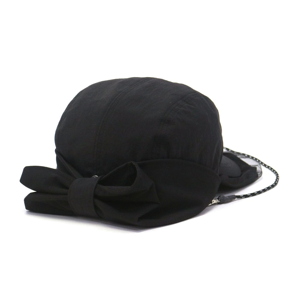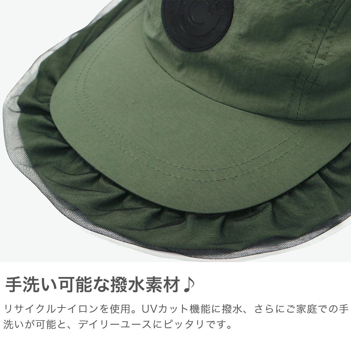 首元までカバーする日除け付きジェットキャップ。チュール付きのつばやワッペンがアクセントになった、スポーティー&フェミニンなデザインです。リサイクルナイロン素材はUVカット・撥水機能つきで、手洗いも可能。アウトドアや旅行に最適です。