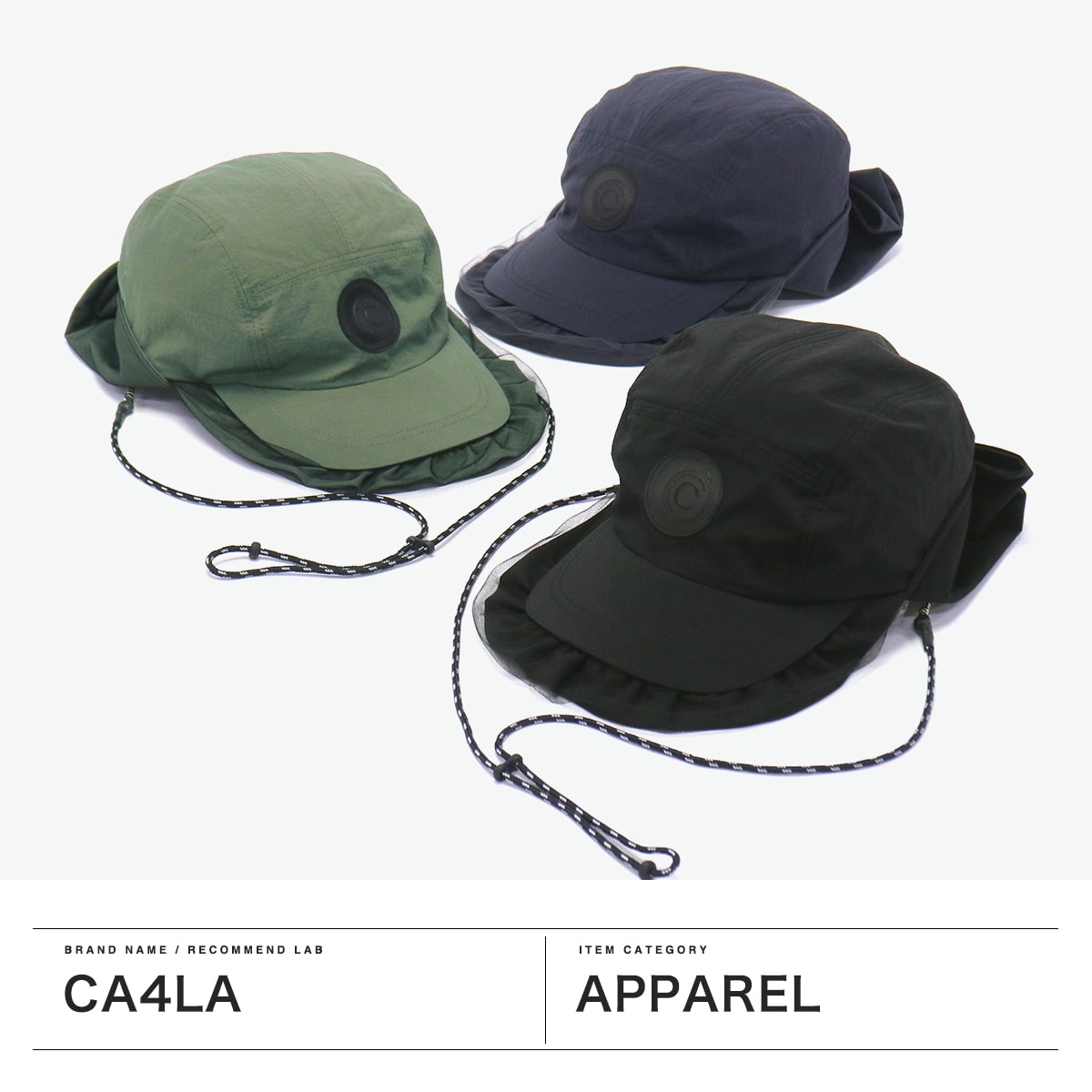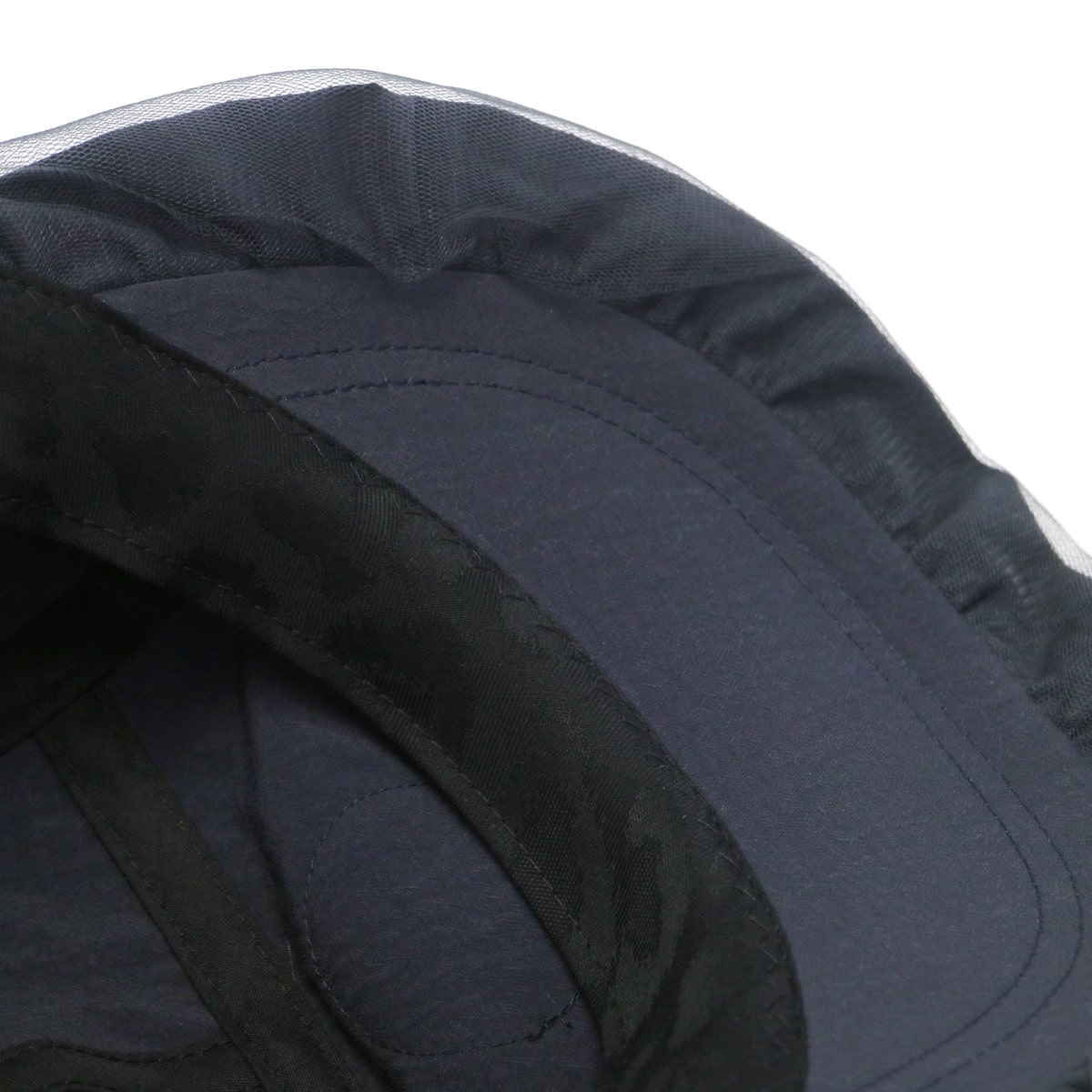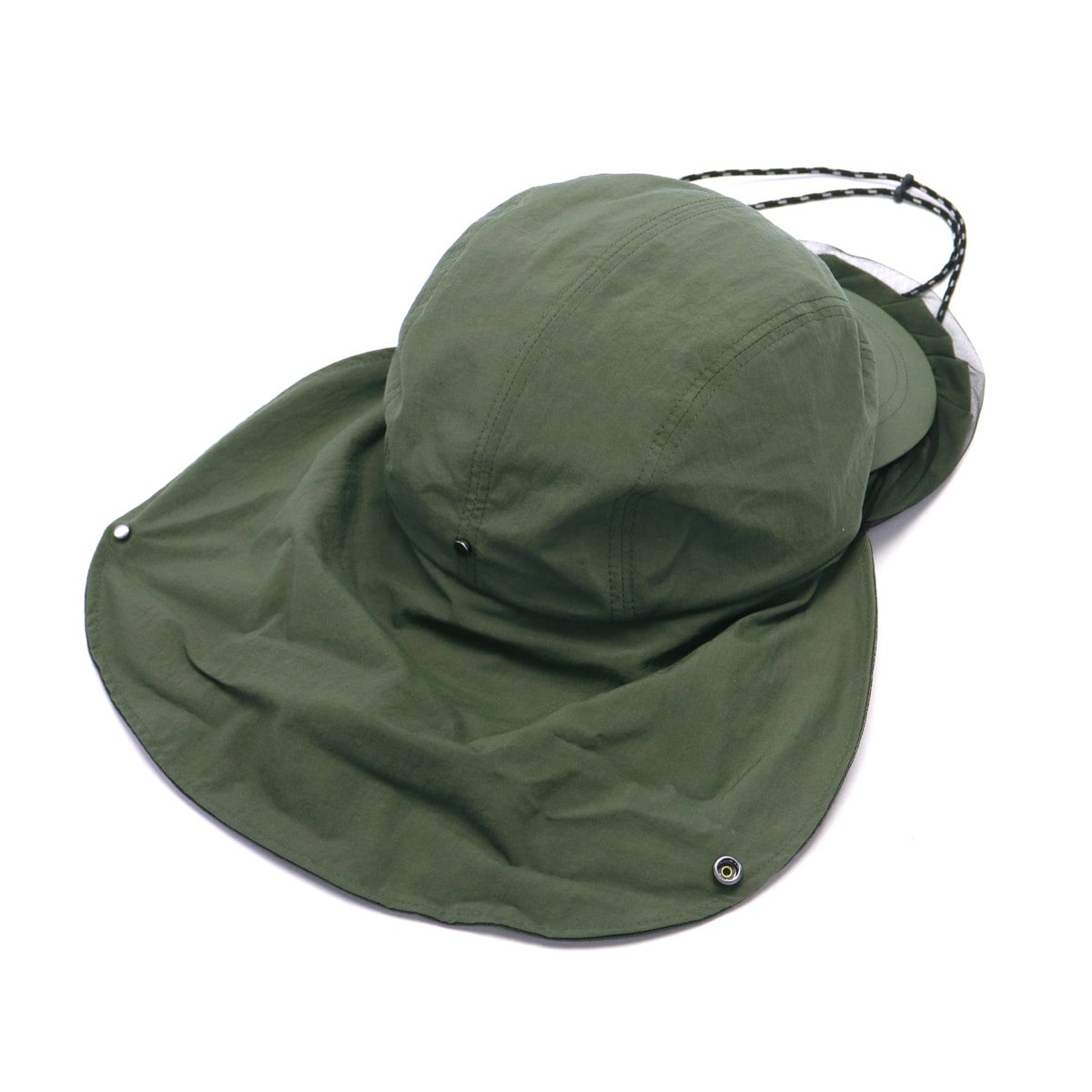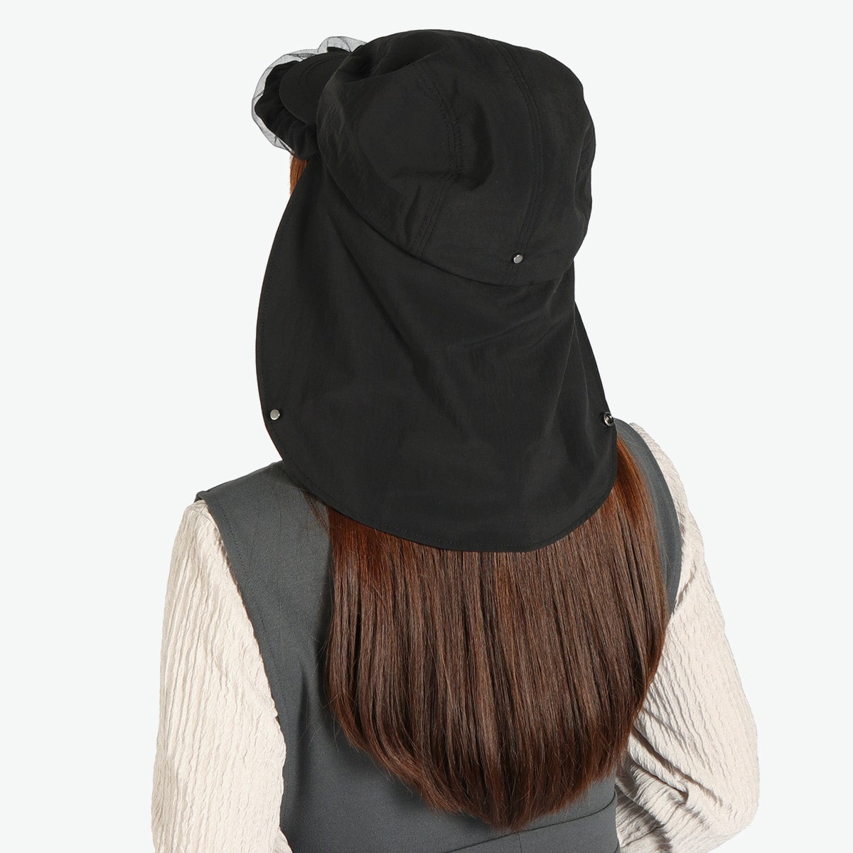 首元までカバーする日除け付きジェットキャップ。チュール付きのつばやワッペンがアクセントになった、スポーティー&フェミニンなデザインです。リサイクルナイロン素材はUVカット・撥水機能つきで、手洗いも可能。アウトドアや旅行に最適です。