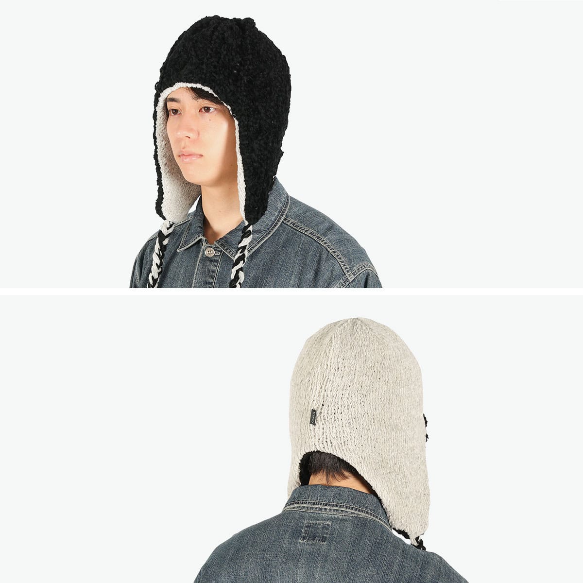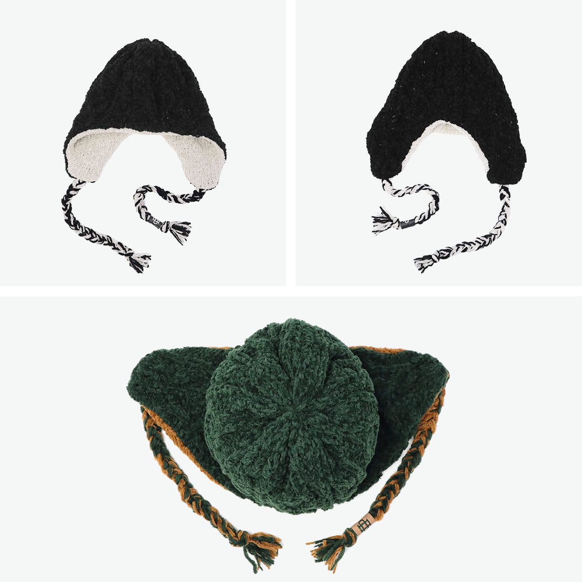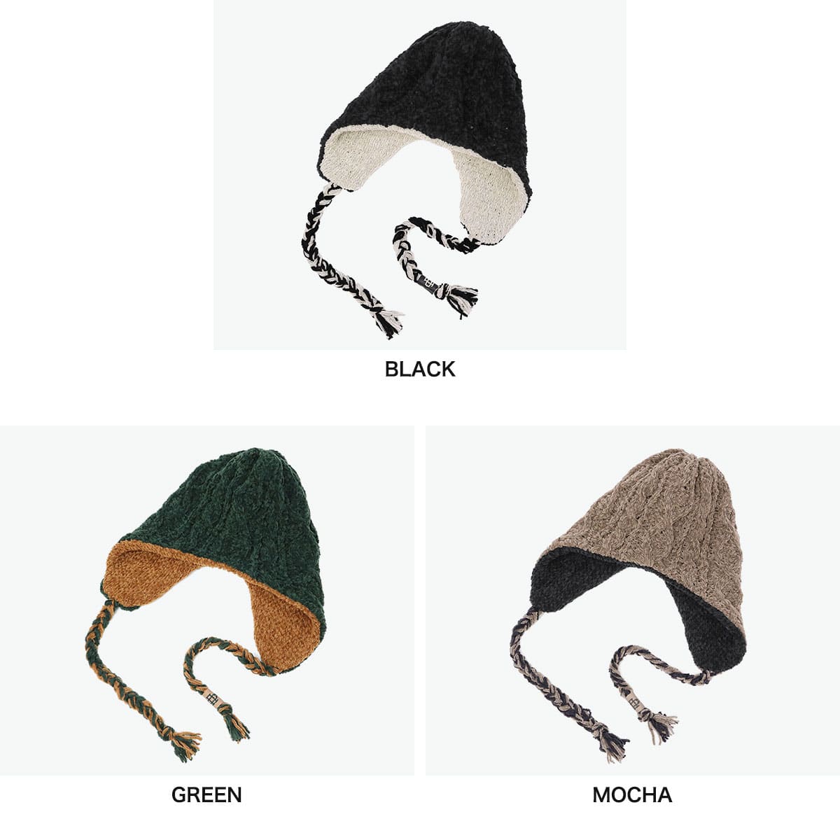 リバーシブル仕様の耳付きニット帽。表面は立体感のあるケーブル編み、裏面は配色を切り替えたデザインで、スタイルや気分に合わせて使い分け可能。耳までしっかり覆うフラップ付きで、防寒性も抜群。上質なエクストラファインウールのモール糸を使用し、ふんわり柔らかく、暖かさと快適なかぶり心地を両立したアイテムです。