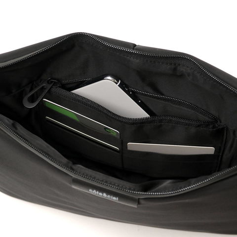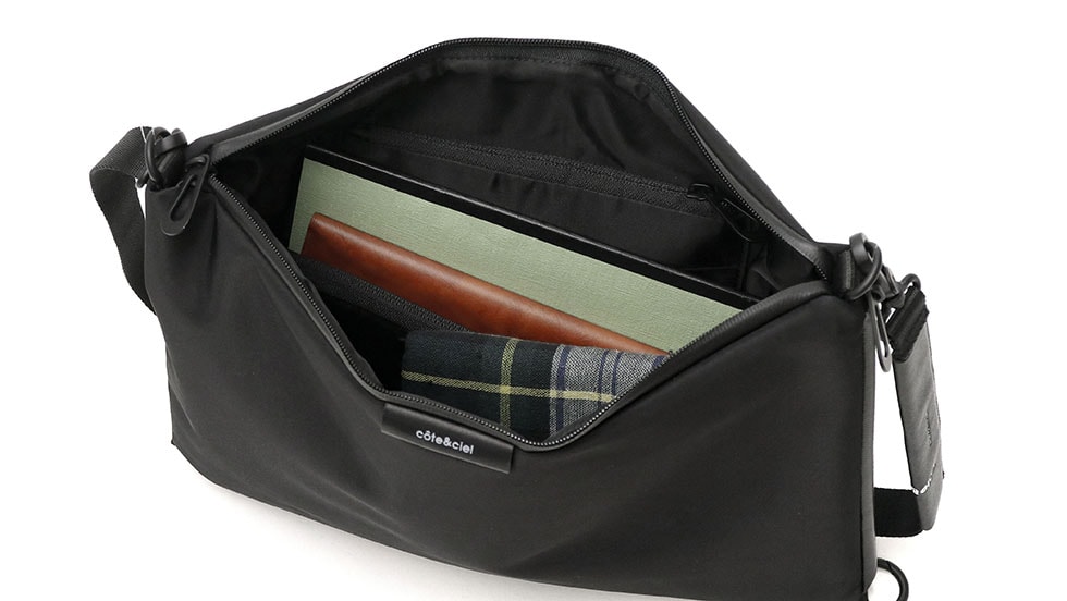 メインルームはA4サイズが余裕を持って入るサイズ感で、荷物の仕分けに便利な2層タイプとなっています。背面収納の内装には小物をしまえるジップポケットやカードポケットを備え、バッグの中身をすっきりと整理していただけます。