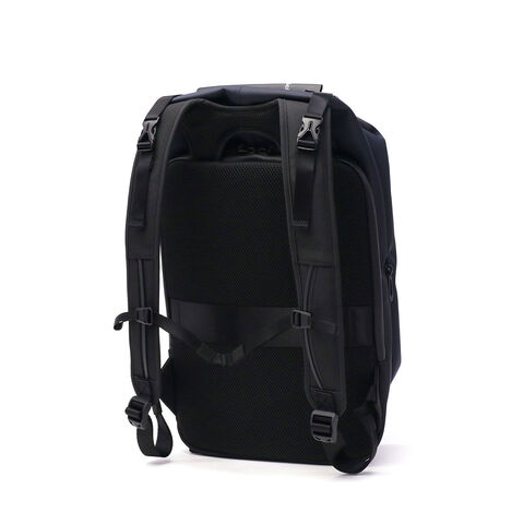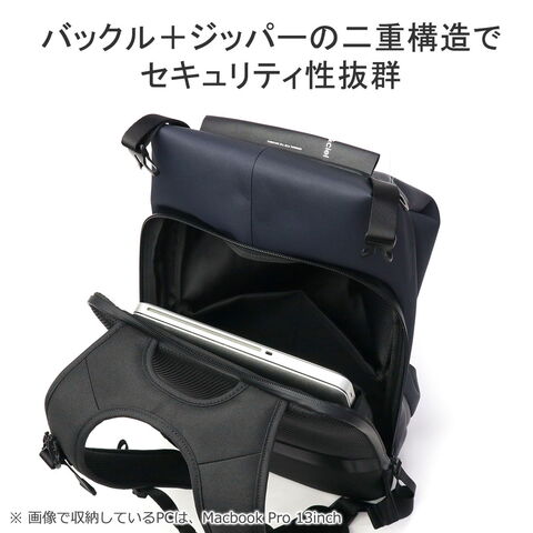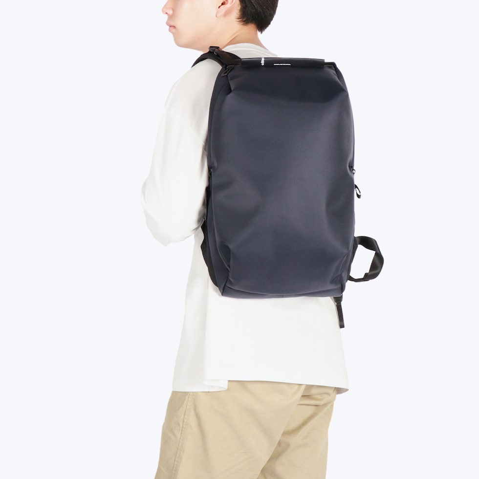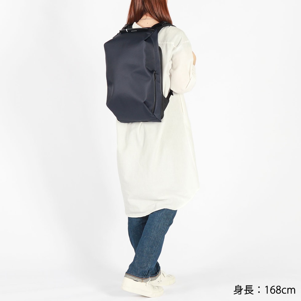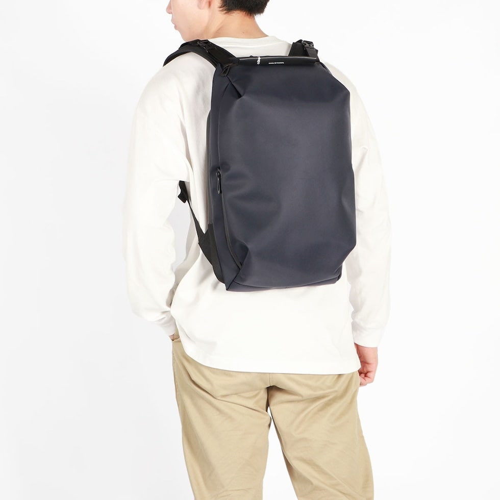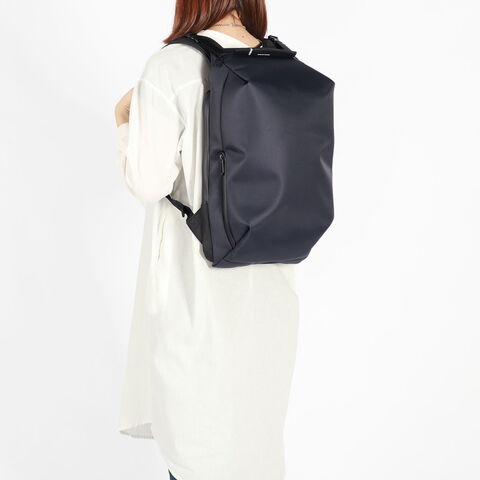シンメトリーのすっきりとしたシルエットを求める人のためのコンパクトなデイパックです。最大16インチのノートPCやA4書類も収納可能で、大きすぎず小さすぎない普段使いに最適なアイテムです。上部二つのバックルを開けることでメインルームにアクセスできる構造は、セキュリティ性を高め荷物の盗難を防ぐのに役立ちます。