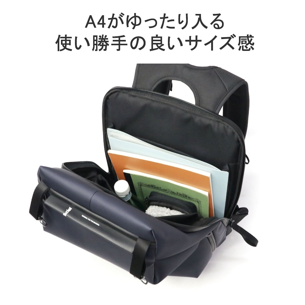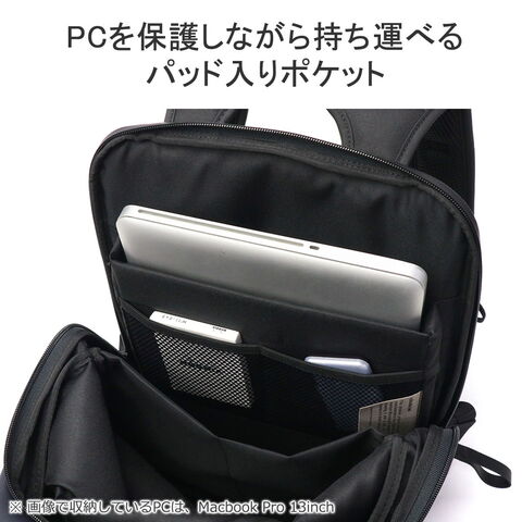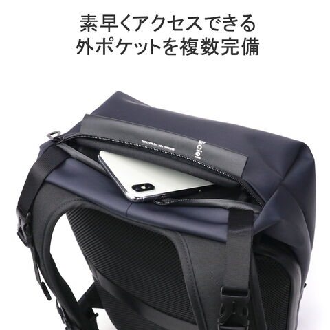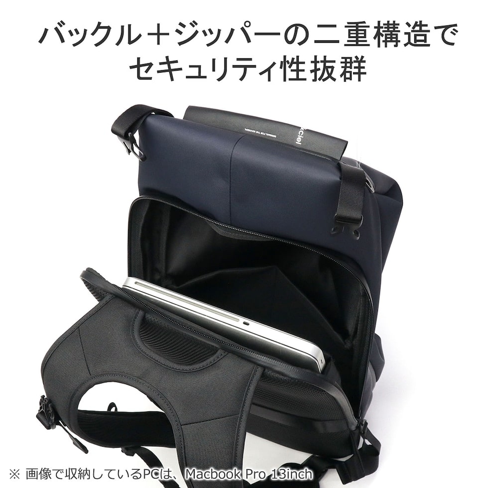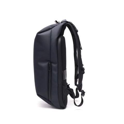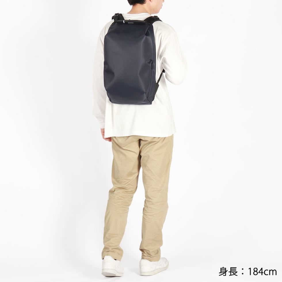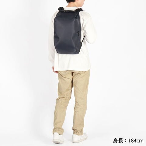 シンメトリーのすっきりとしたシルエットを求める人のためのコンパクトなデイパックです。最大16インチのノートPCやA4書類も収納可能で、大きすぎず小さすぎない普段使いに最適なアイテムです。上部二つのバックルを開けることでメインルームにアクセスできる構造は、セキュリティ性を高め荷物の盗難を防ぐのに役立ちます。