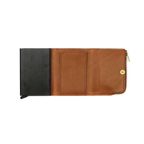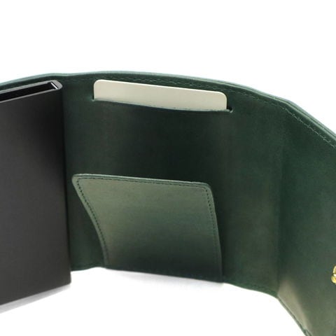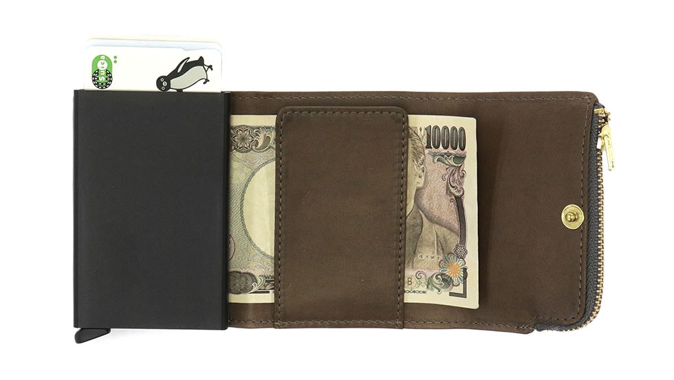 内装には札入れとカードが4~5枚程度収納できるカードプロテクターを装備。スキミング防止機能を備えた特殊なカードプロテクターは、非接触による誤作動やカード情報の不正な読み取り(スキミング)の被害から大切なカード情報を守ってくれます。