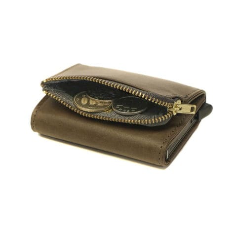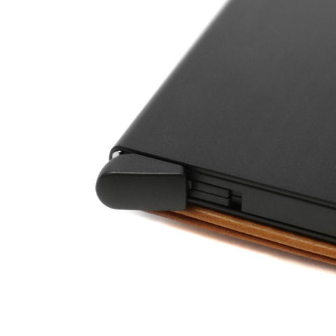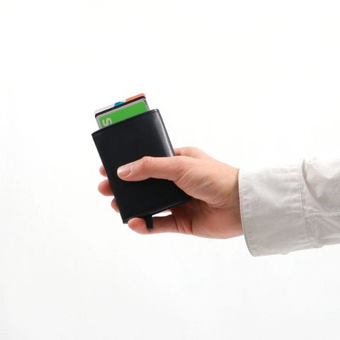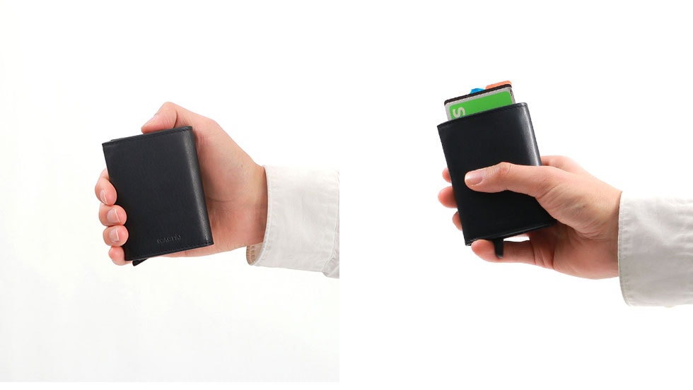 本体下部にある黒いレバーを引くとカードが並んで出てくるスマートな仕様で、お探しのカードを一目で見つける事ができます。また、カードプロテクターとは別に1枚のカード収納を装備。スキミングされたくないカードと、ICカードを別々に収納可能に。セキュリティー強化とスムーズな支払いが両立できます。