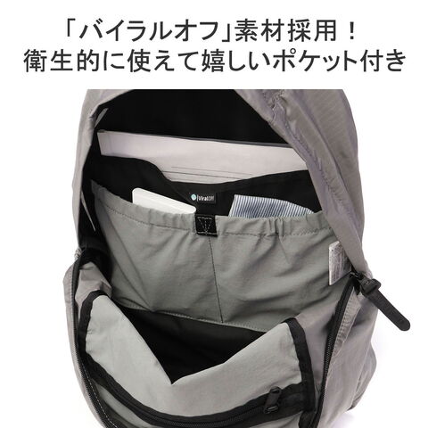 アウトドアからタウンユースまで幅広く活躍するバックパック。見た目以上の収納力で使い勝手抜群のデザインが魅力です。本体内側には表面に付着したウイルスを減少させる「バイラルオフ」素材を採用したポケットを設けています。また、雨の日でも安心できる撥水ファスナーを採用。さらに、生地には汚れにくいテフロン加工を施しているため、毎日気兼ねなく愛用して頂けます。