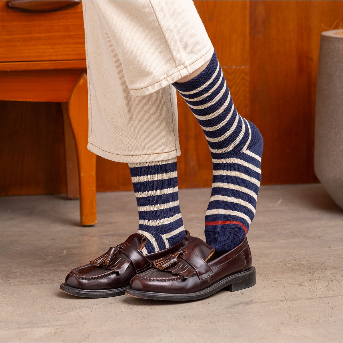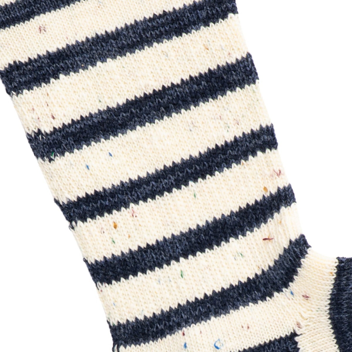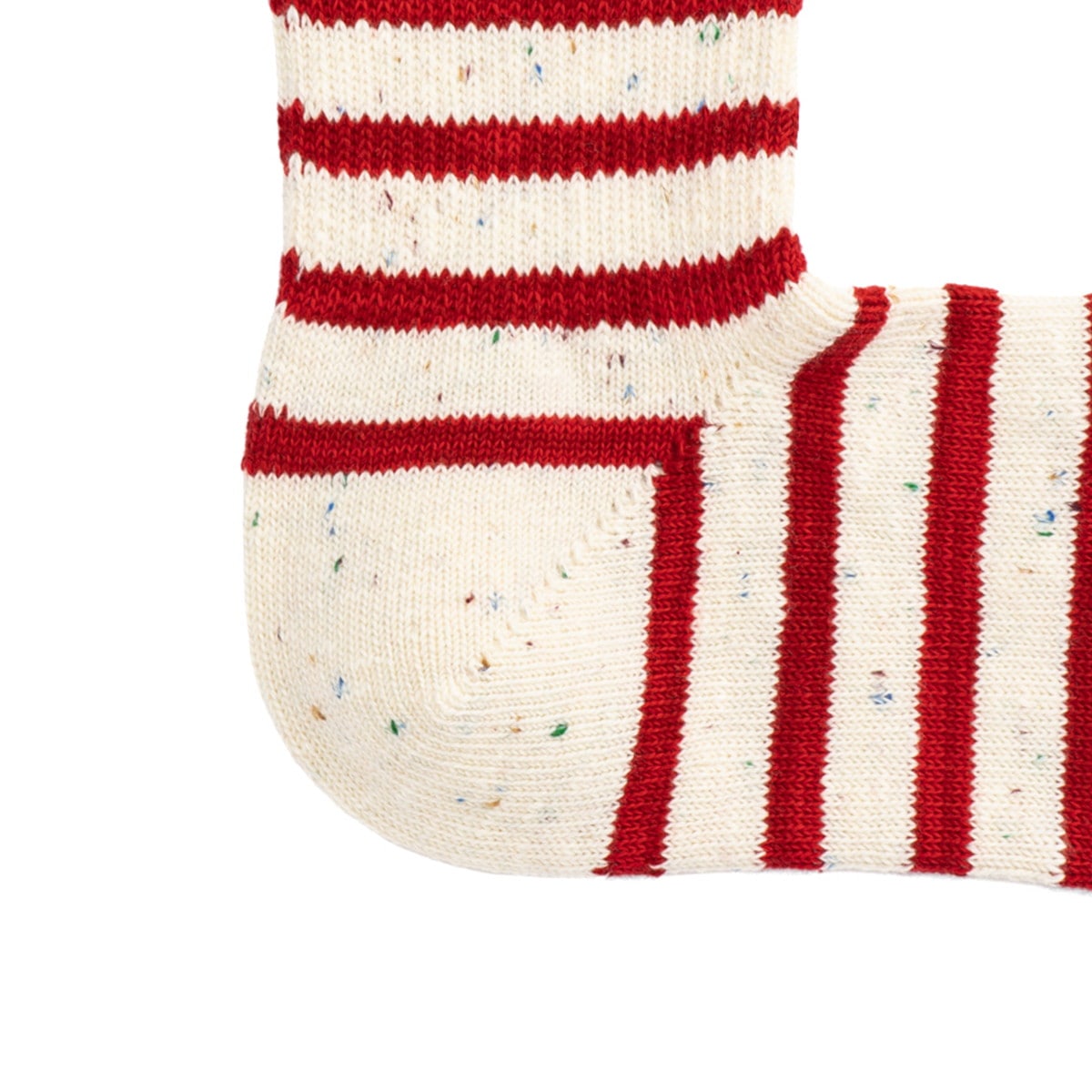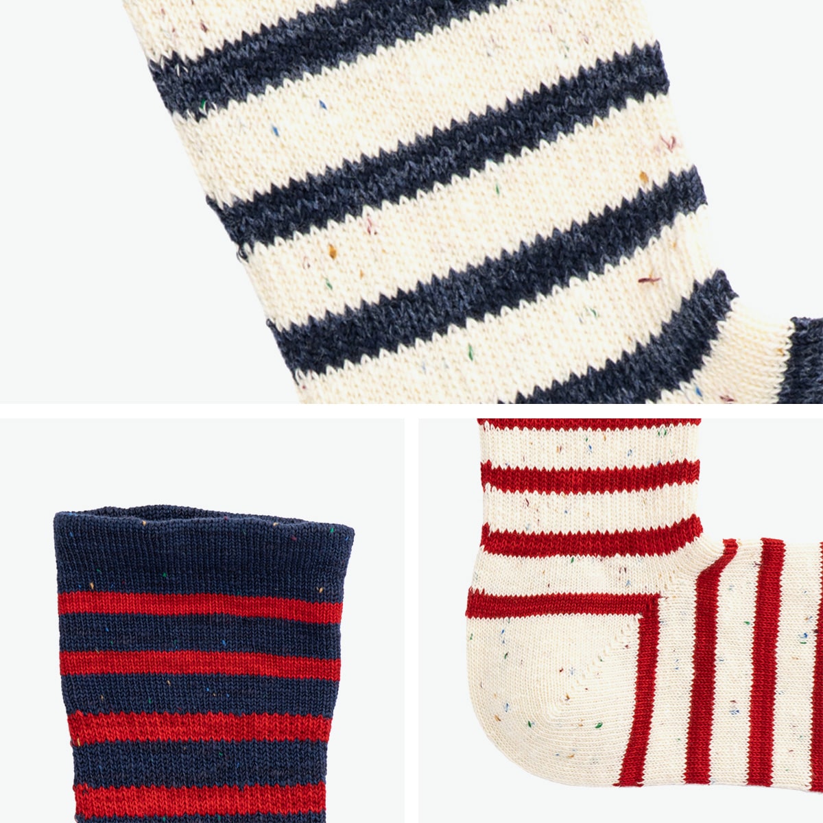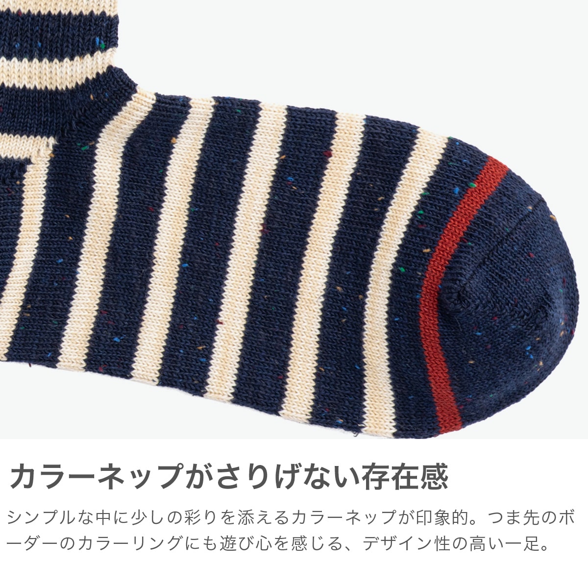 シンプルながら個性的なカラーネップを使用し、つま先の配色をアクセントにしたクラシカルなツートンボーダーのクルーソックス。足首や甲にシワが寄らずに、すっきりした見た目のL字型靴下です。独特な風合いと定番のカラーリングで、カジュアルにもトラッドにも気軽に履ける1足です。
