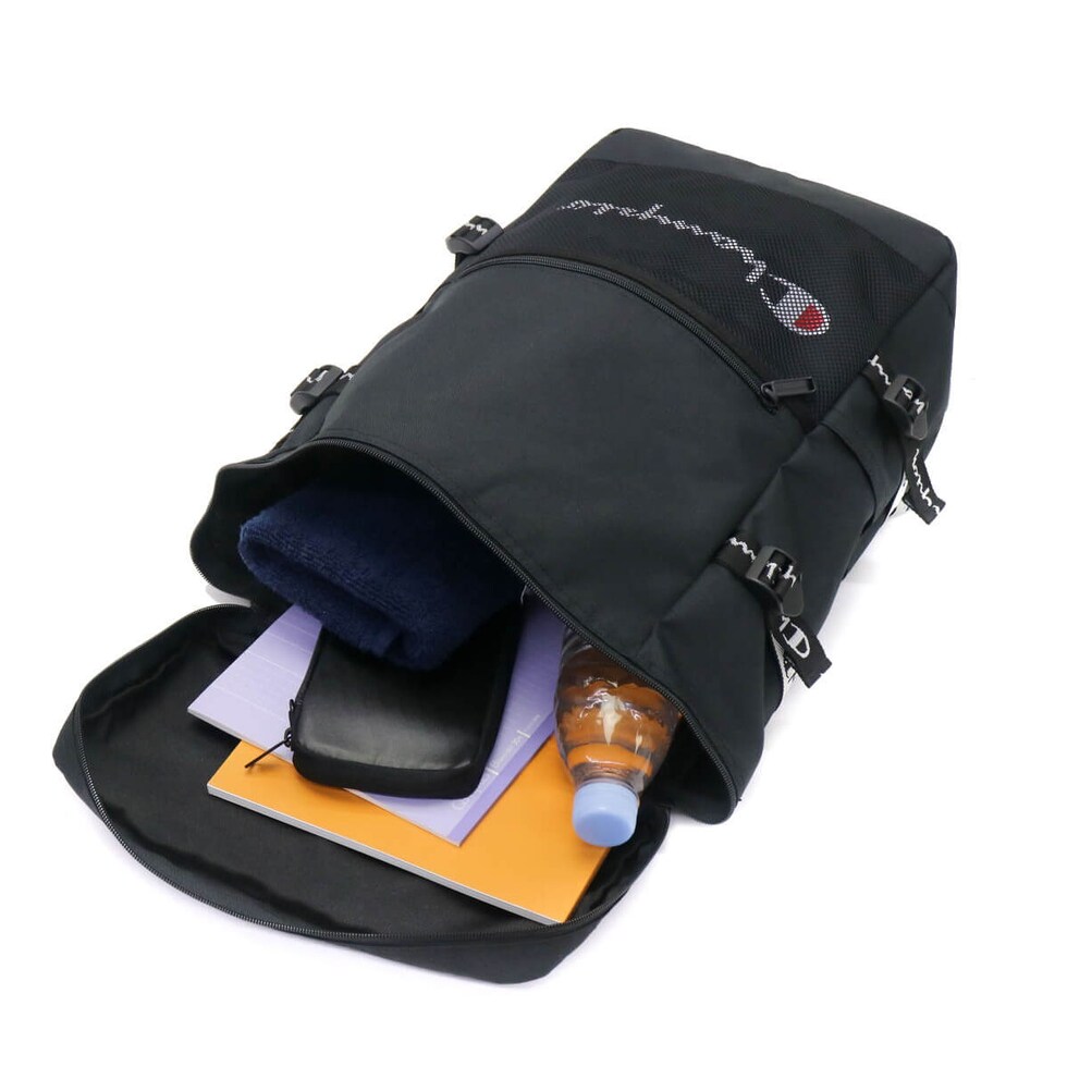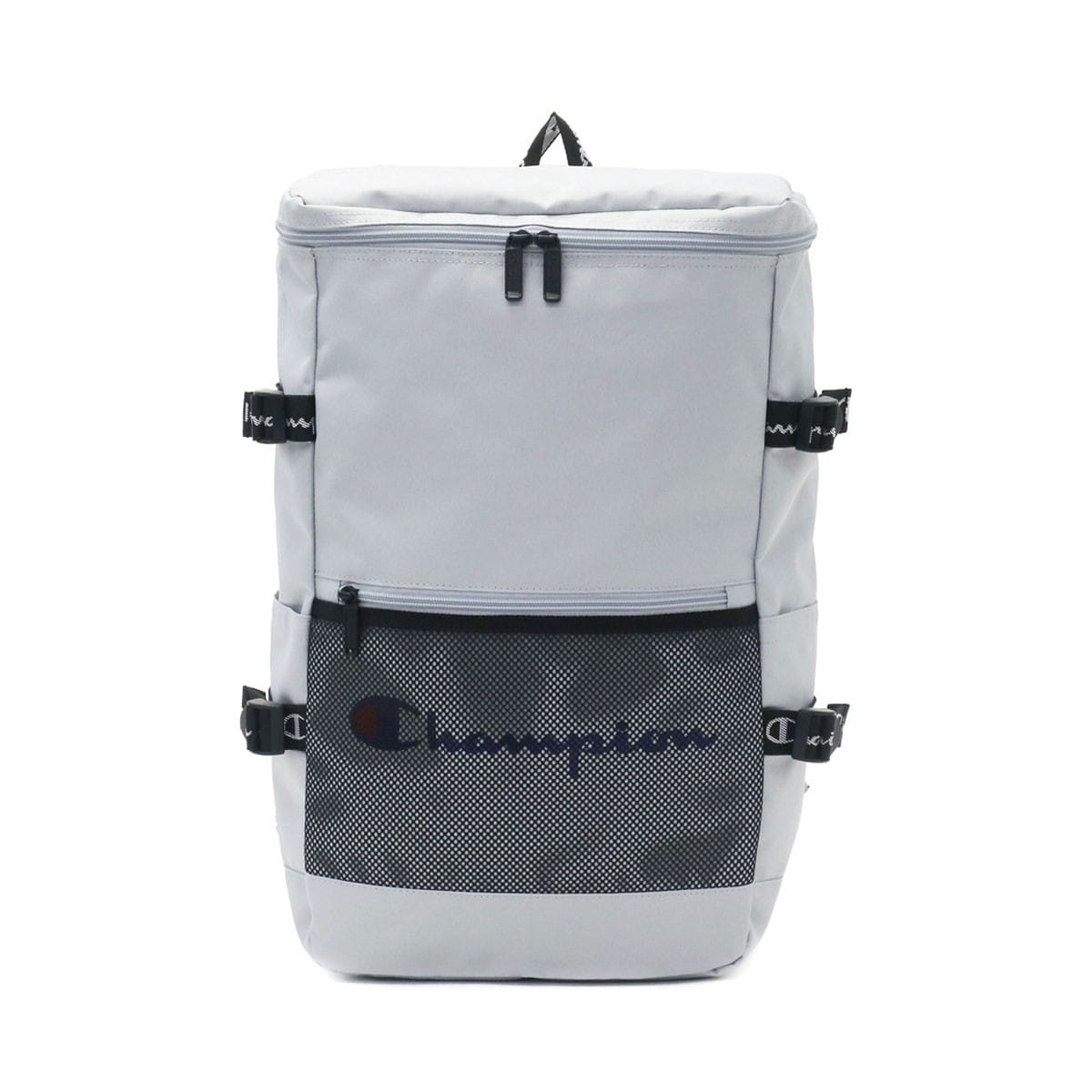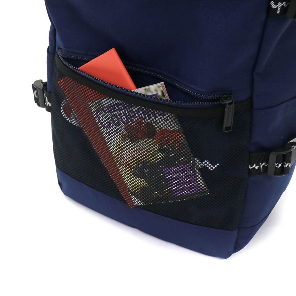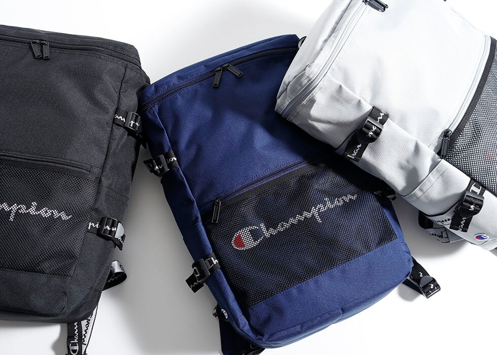 カジュアルシーンで人気のブランド『Champion/チャンピオン』のリュックサック。外装にあしらわれたブランドロゴテープと、フロントのメッシュポケットがデザインのポイントです。こちらは人気のボックス型タイプとなっており、タウンユースから通学や部活にも活躍してくれます。